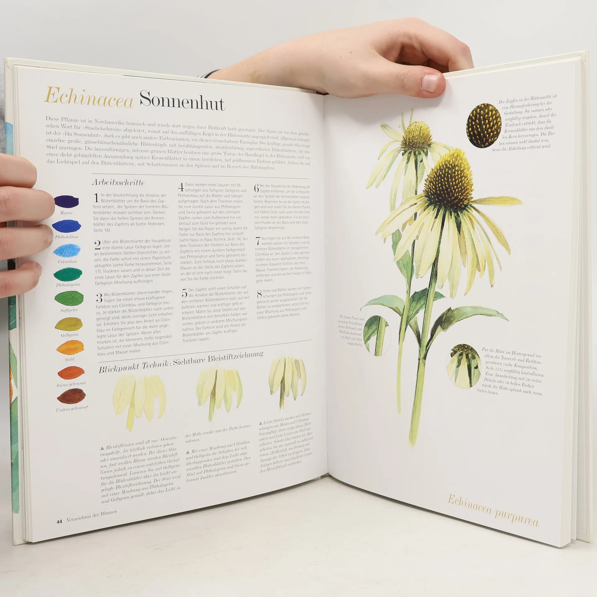 50 beliebte Blumen, nach den lateinischen Namen alphabetisch geordnet, zum Nachmalen als Aquarell, das ist das außergewöhnliche Anliegen dieses Buches. Das gelingt dank der genauen Farbangaben und den Schritt-für-Schritt-Sequenzen, in der das Malen jeder Blume demonst-riert wird. Ein eigenes Kapitel zeigt, wie diese Blumen zu farbenfrohen Kompositionen zusammengestellt werden können.
