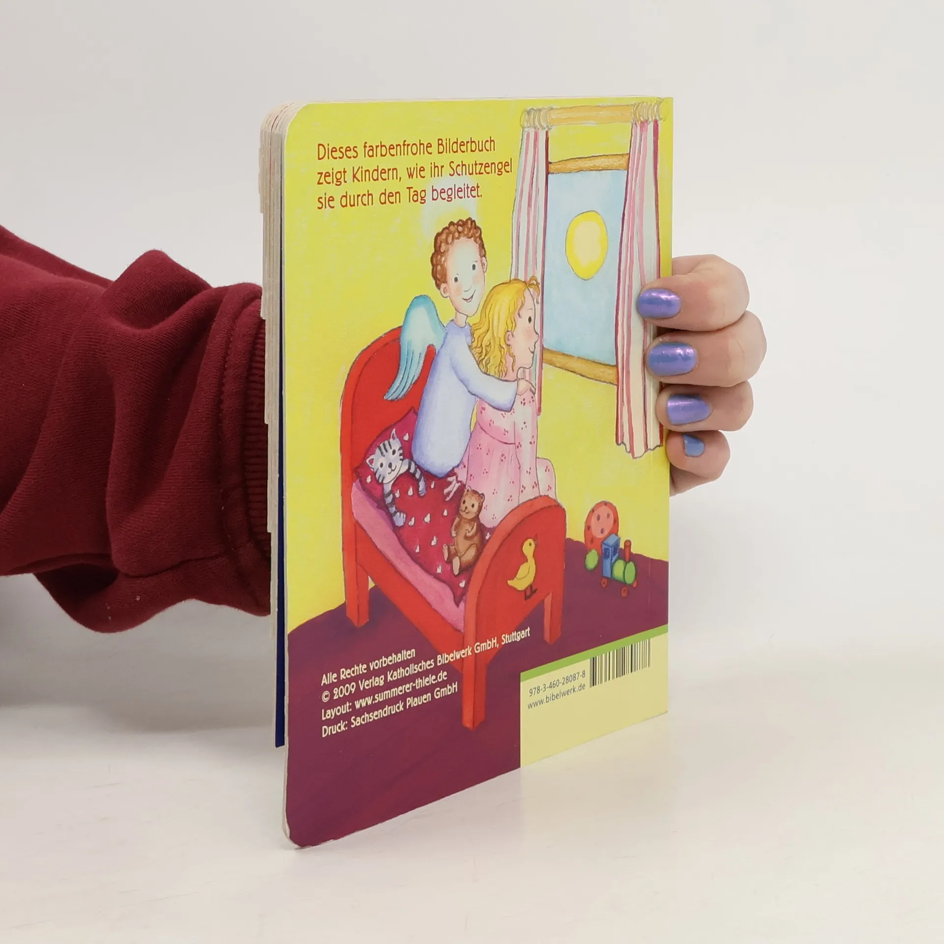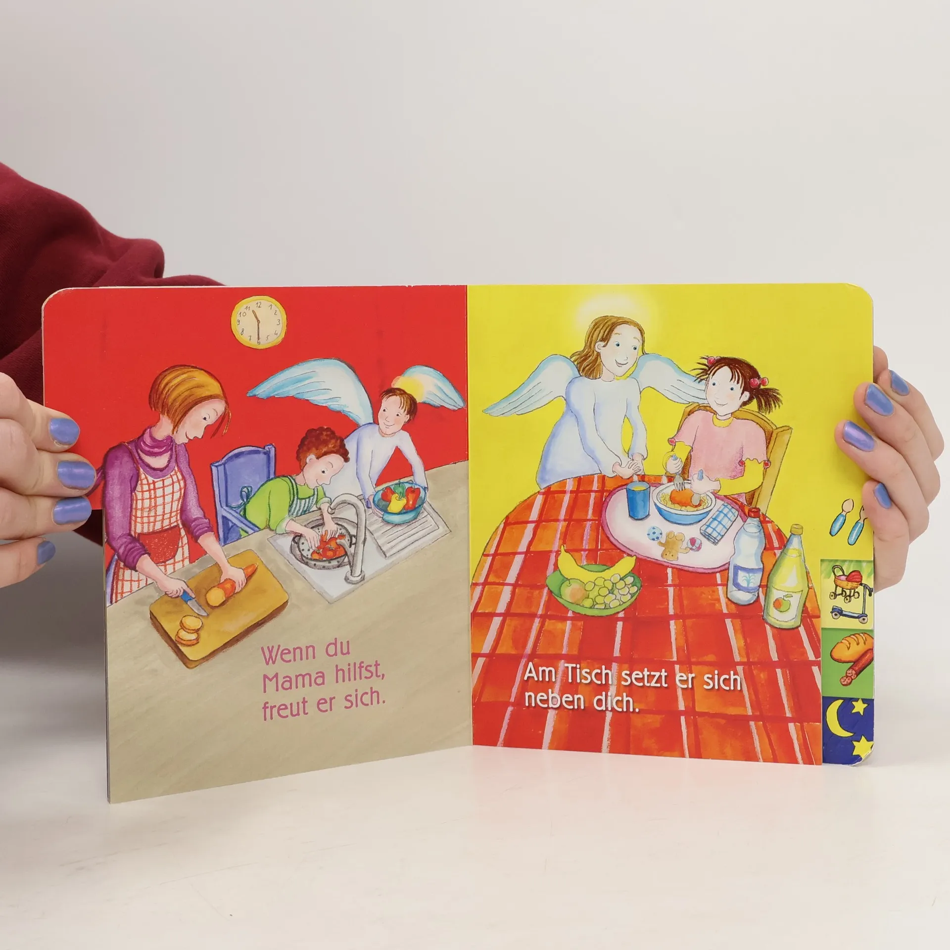 Leicht aufzufinden durch das Griffregister mit einfachen Symbolen, erzählt das Büchlein die verschiedenen Situationen eines Kinderlebens vom Aufstehen bis zum Schlafengehen: Anziehen, Frühstücken, Spielen, Einkaufen - überall ist der Schutzengel dabei. Mit den leicht einprägsamen Versen von Pia Biehl wird dem Kind vermittelt: Du bist niemals allein.
