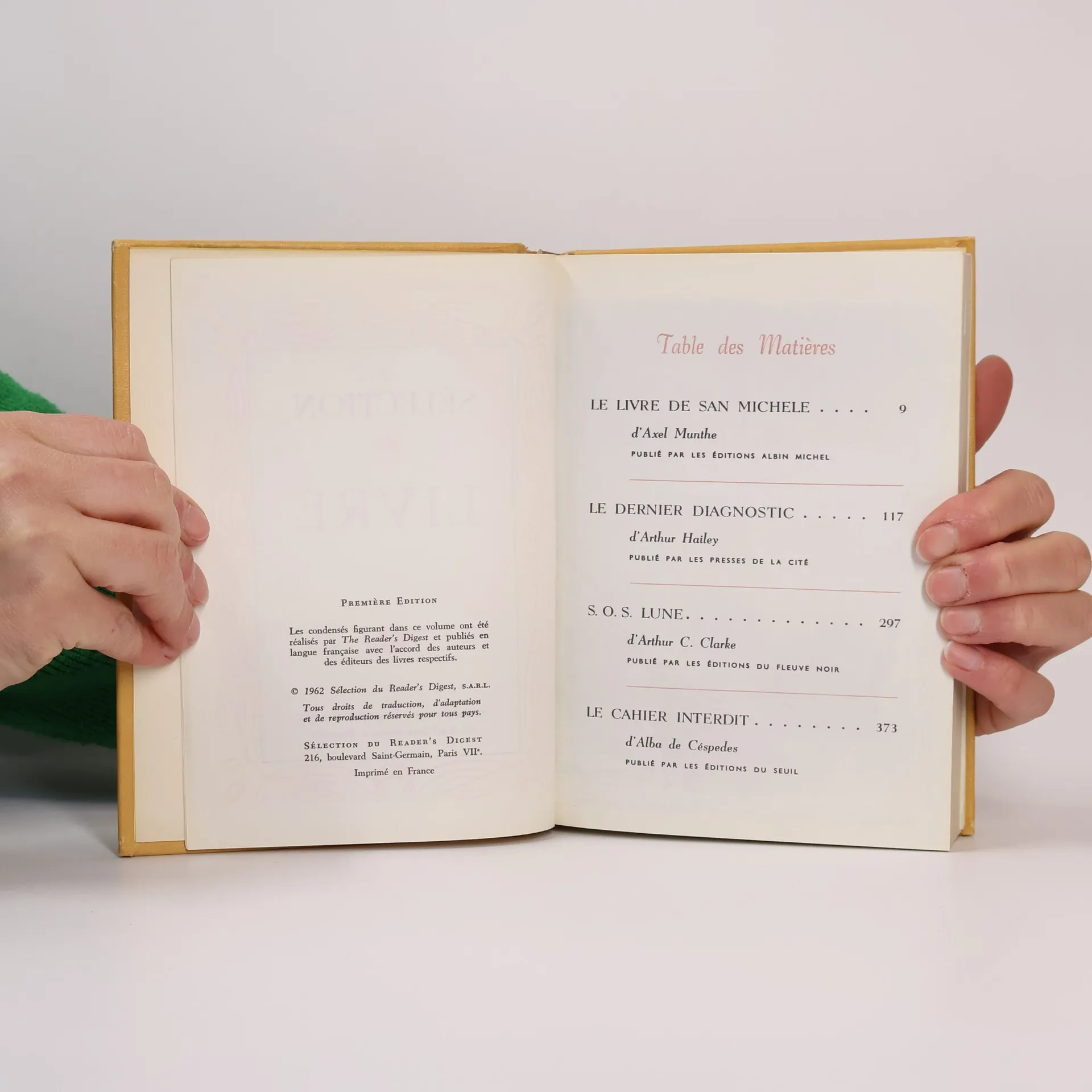 Sélection du livre. Le Livre de San Michele, Le Dernier Diagnostic, S. O. S. Lune a Le Cahier Interdit, Axel Munthe, Arthur Charles Clarke, Arthur Hailey, Alba De Céspedes