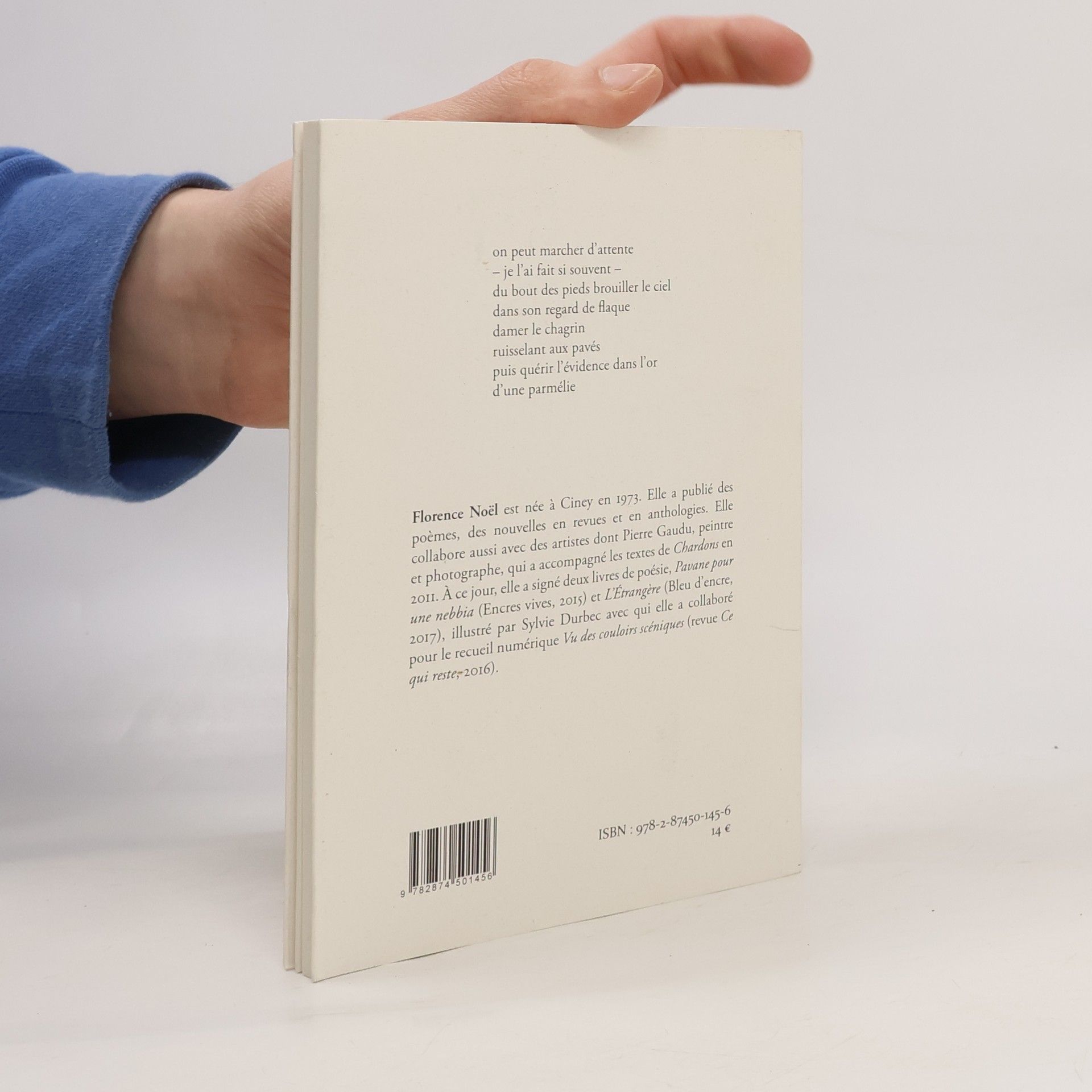 Extrait00on peut marcher d?attente0? je l?ai fait si souvent ?0du bout des pieds brouiller le ciel0dans son regard de flaque0damer le chagrin0ruisselant aux pavés0puis quérir l?évidence dans l?or0d?une parmélie00Florence Noël est née à Ciney en 1973. Elle a publié des poèmes, des nouvelles en revues et en anthologies. Elle collabore aussi avec des artistes dont Pierre Gaudu, peintre et photographe, qui a accompagné les textes de Chardons en 2011. À ce jour, elle a signé deux livres de poésie, Pavane pour une nebbia (Encres vives, 2015) et l?Étrangère (Bleu d?encre, 2017), illustré par Sylvie Durbec avec qui elle a collaboré pour le recueil numérique Vu des couloirs scéniques (revue Ce qui reste, 2016).