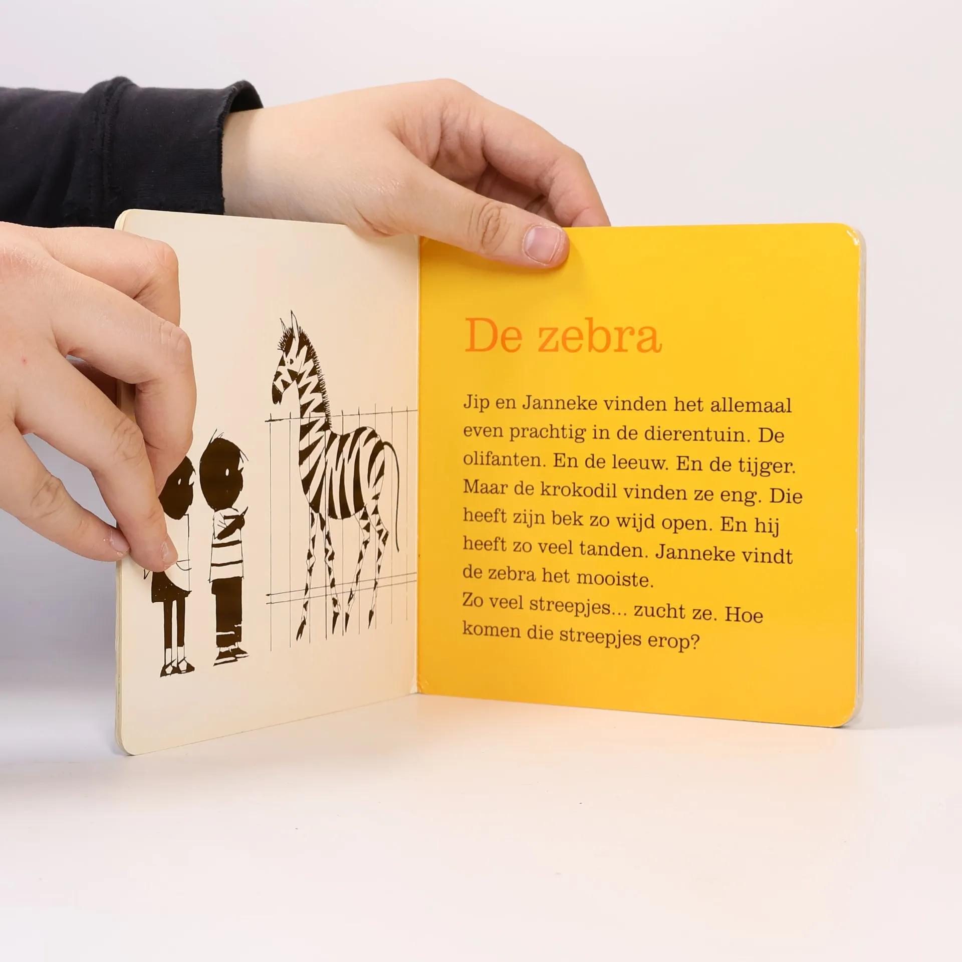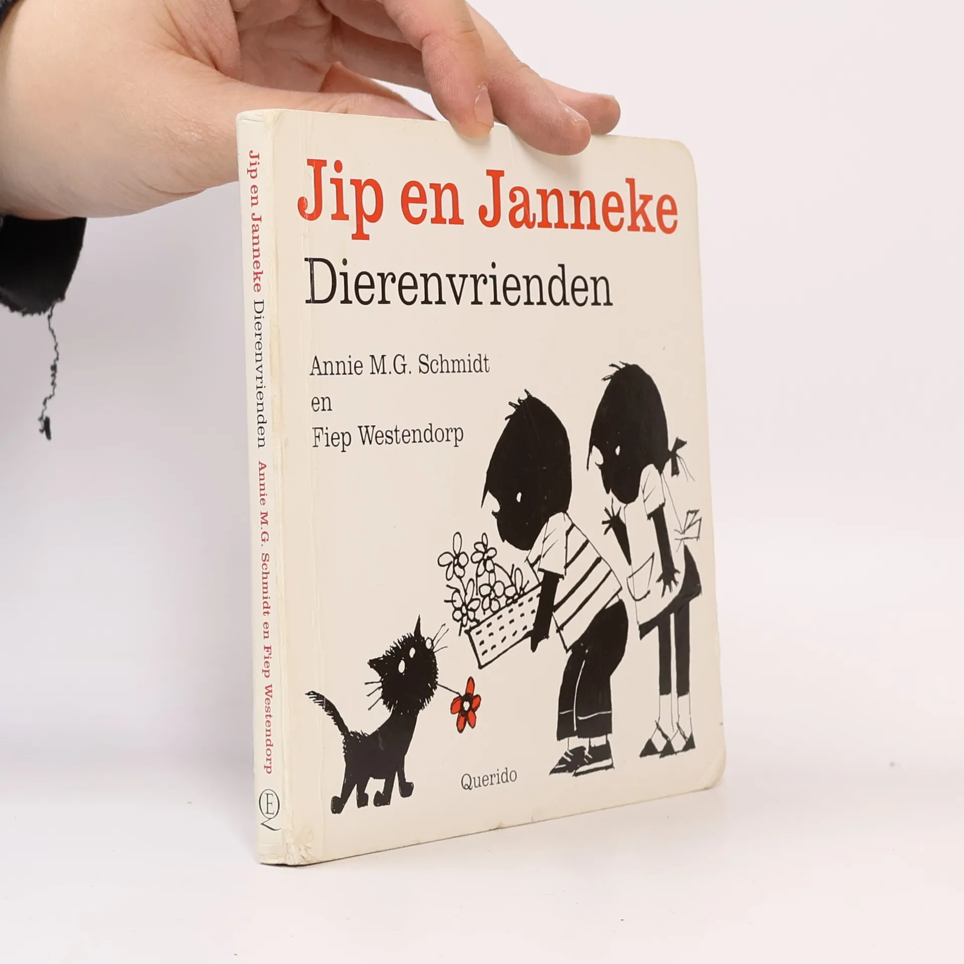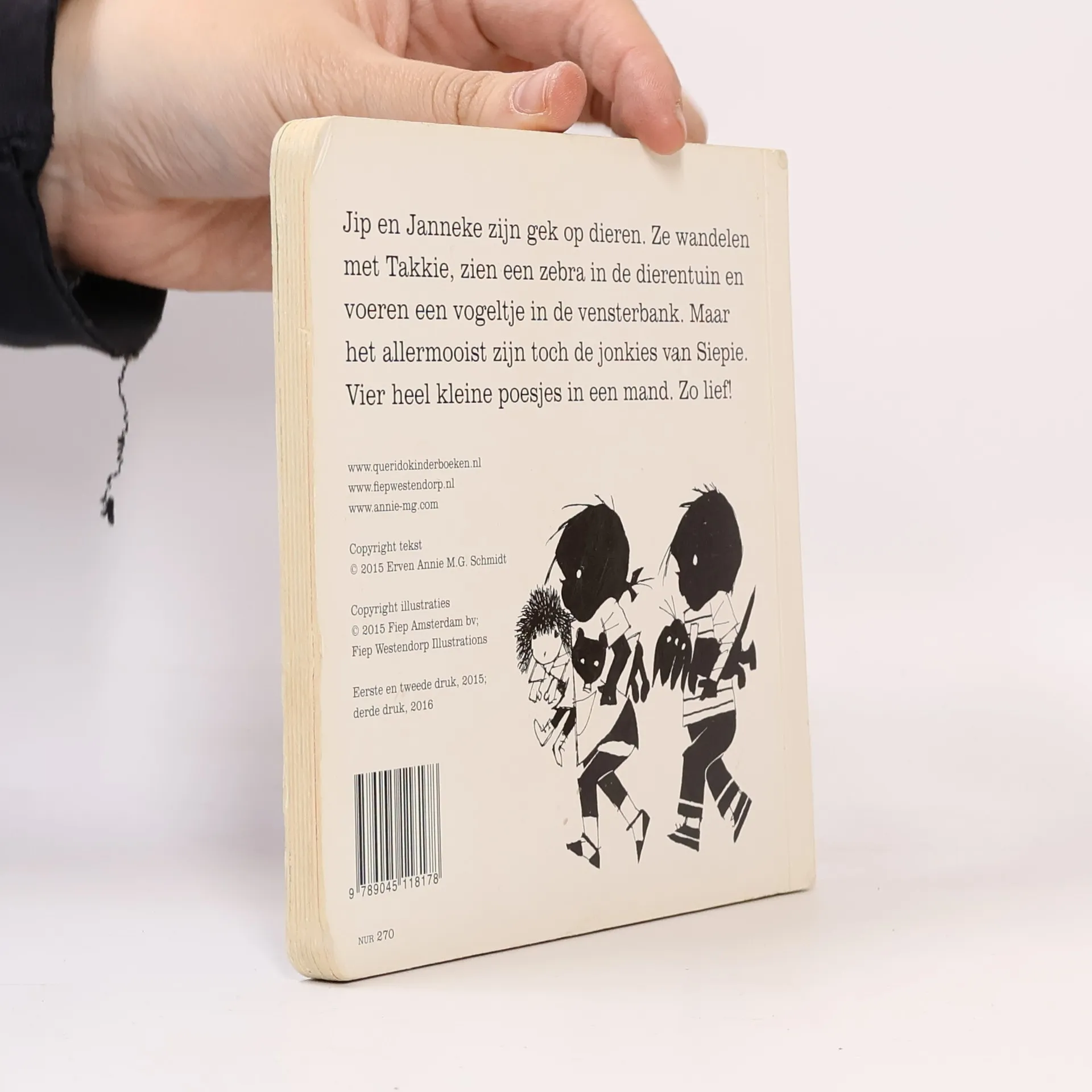 Hardkartonnen vierkant boekje met zeven vereenvoudigde dierenverhaaltjes over Jip en Janneke. Over een papegaai in een gouden kooi, de zebra en de kameel in de dierentuin, de jonge poesjes van Siepie, een vogeltje op de vensterbank, Jip als bokje en Takkie als hun kind in de kinderwagen. Onlangs verscheen ook 'Het grote De geit van dokter Sanders dierenvoorleesboek'* met de meest geliefde dierenverhalen uit het werk van Annie M.G. Schmidt. Met dit kartonboekje kunnen ook kleintjes van de dierenverhalen genieten. Op de glanzende bladzijden staat de tekst op een gekleurde een mooie afwisseling met de bekende, karakteristieke illustraties van Fiep Westendorp in zwart-wit. Elk verhaaltje bestaat uit een pagina tekst en een pagina met illustratie, qua lengte is dat goed afgestemd op de doelgroep. Voor de uitvoering met twee afgeronde hoeken geldt dat ook. De tekst en illustraties beginnen en eindigen aan de binnenzijden van het omslag. Daarop staat in zwart-wit, met enkele accenten in de steunkleur rood, het bekende duo afgebeeld. Fijn boekje voor kinderen vanaf ca. 2 jaar.