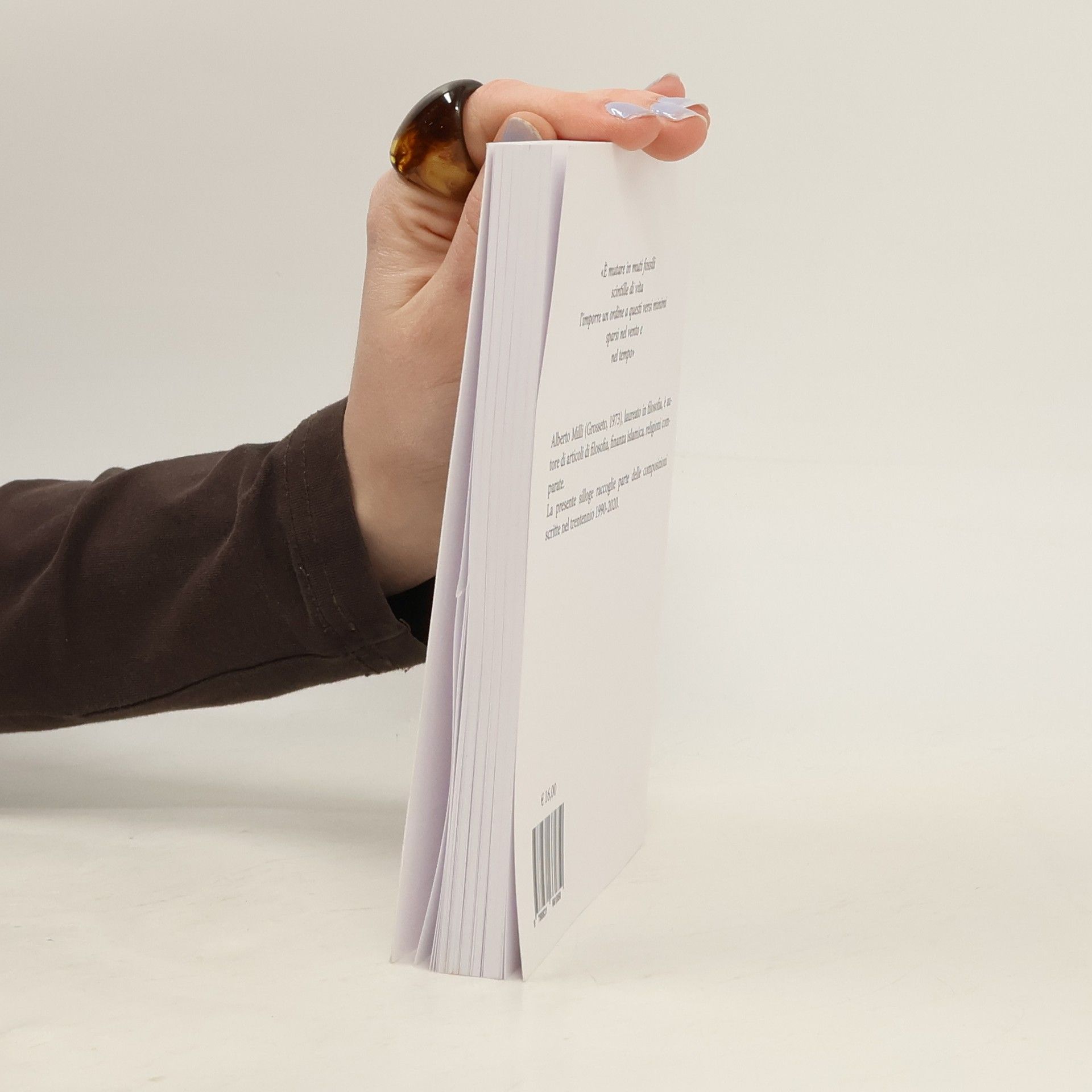 Emozioni, lievi o fortissime, e moti dell'animo trascritti sulla carta, qualsiasi tipo di carta, prima di ritrovarli sbiaditi o, peggio, "ruminati" nella riflessione. Pensieri che non danno tregua ridotti al loro nocciolo, per non perderne il peso nel sovrapporvi una scorza troppo spessa di parole. I salti vertiginosi nei monoteismi e nelle tragedie indicibili, una semplice luce estiva, un bicchiere di vino, una persona o un animale caro, un trasloco, un'orfana di guerra, una catarsi dalla rete, un digiunante nella calura estiva, una sigaretta, "l'universo in un quanto", fotografie in bianco e nero. "Scintille di vita" fermate sulla carta, salvate dal tempo.