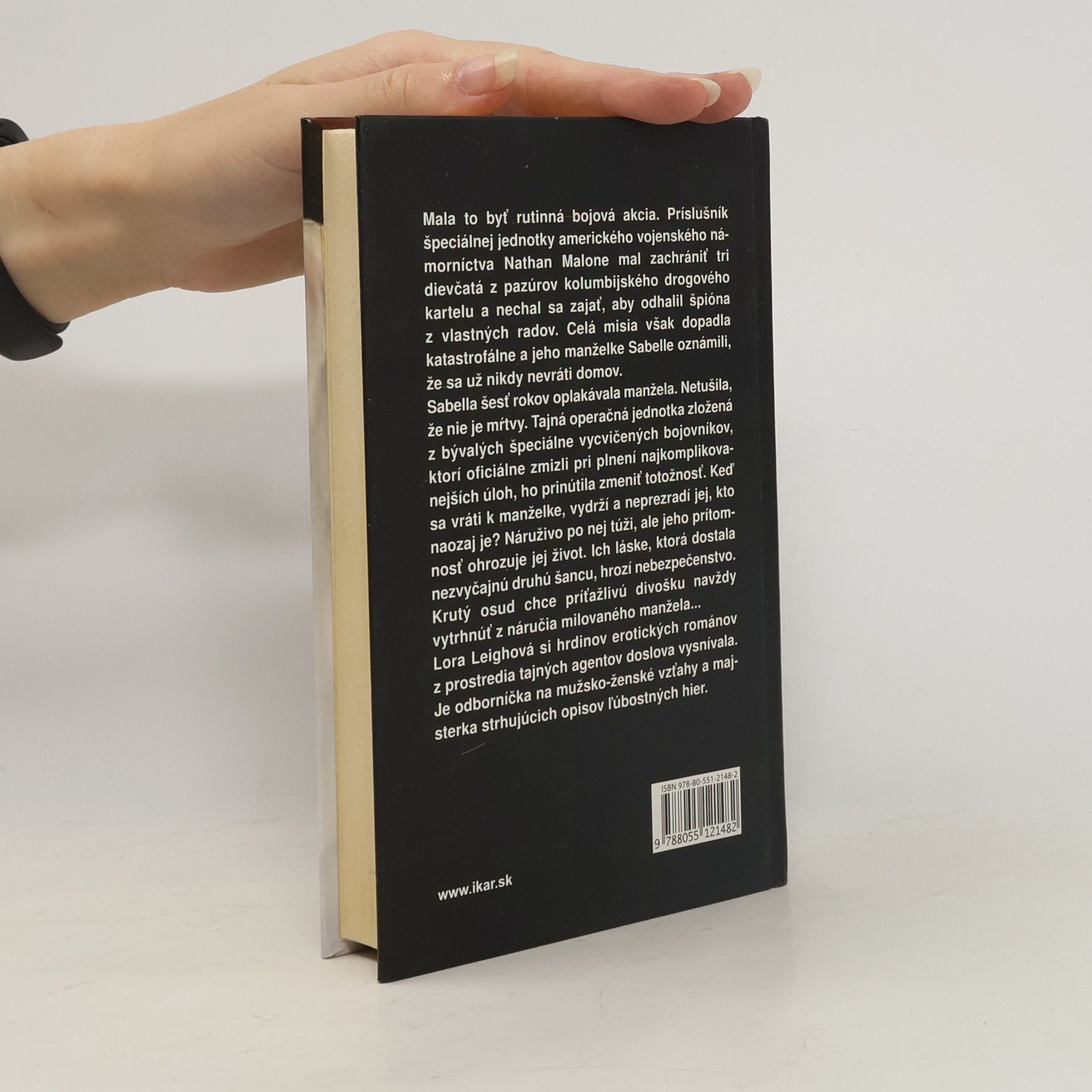 Mala to byť rutinná bojová akcia. Príslušník špeciálnej jednotky amerického vojenského námorníctva Nathan Malone mal zachrániť tri dievčatá z pazúrov kolumbijského drogového kartelu a nechal sa zajať, aby odhalil špióna z vlastných radov. Celá misia však dopadla katastrofálne a jeho manželke Sabelle oznámili, že sa už nikdy nevráti domov. Sabella šesť rokov oplakávala manžela. Netušila, že nie je mŕtvy. Tajná operačná jednotka zložená z bývalých špeciálne vycvičených bojovníkov, ktorí oficiálne zmizli pri plnení najkomplikovanejších úloh, ho prinútila zmeniť totožnosť. Keď sa vráti k manželke, vydrží a neprezradí jej, kto naozaj je? Náruživo po nej túži, ale jeho prítomnosť ohrozuje jej život. Ich láske, ktorá dostala nezvyčajnú druhú šancu, hrozí nebezpečenstvo. Krutý osud chce príťažlivú divošku navždy vytrhnúť z náručia milovaného manžela... Lora Leighová si hrdinov erotických románov z prostredia tajných agentov doslova vysnívala. Je odborníčka na mužsko-ženské vzťahy a majsterka strhujúcich ľúbostných hier.
