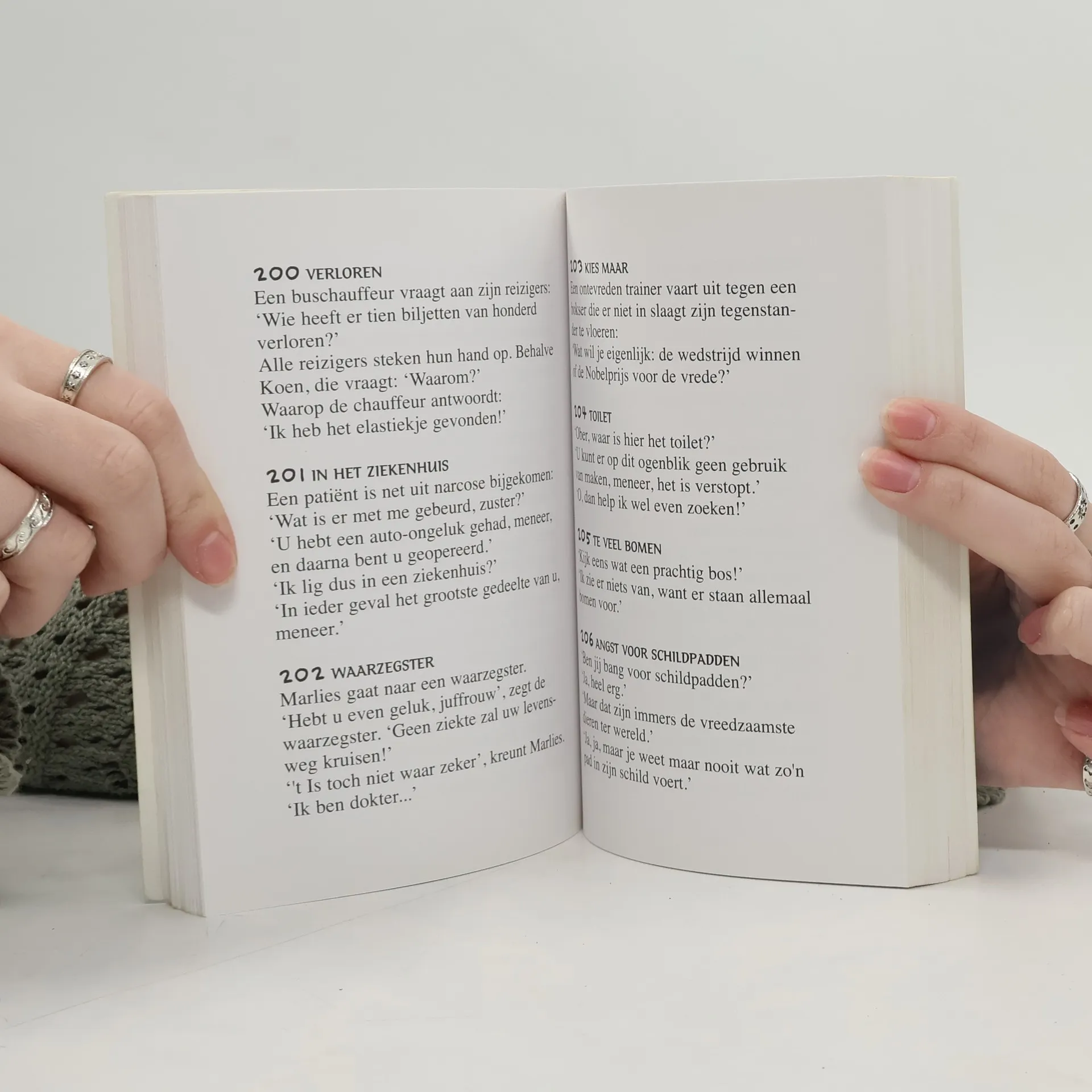 Verzameling van 500 korte moppen. Met paginagrote zwart-witte cartoons, die zelf ook een mop uitbeelden. Vanaf ca. 9 jaar.