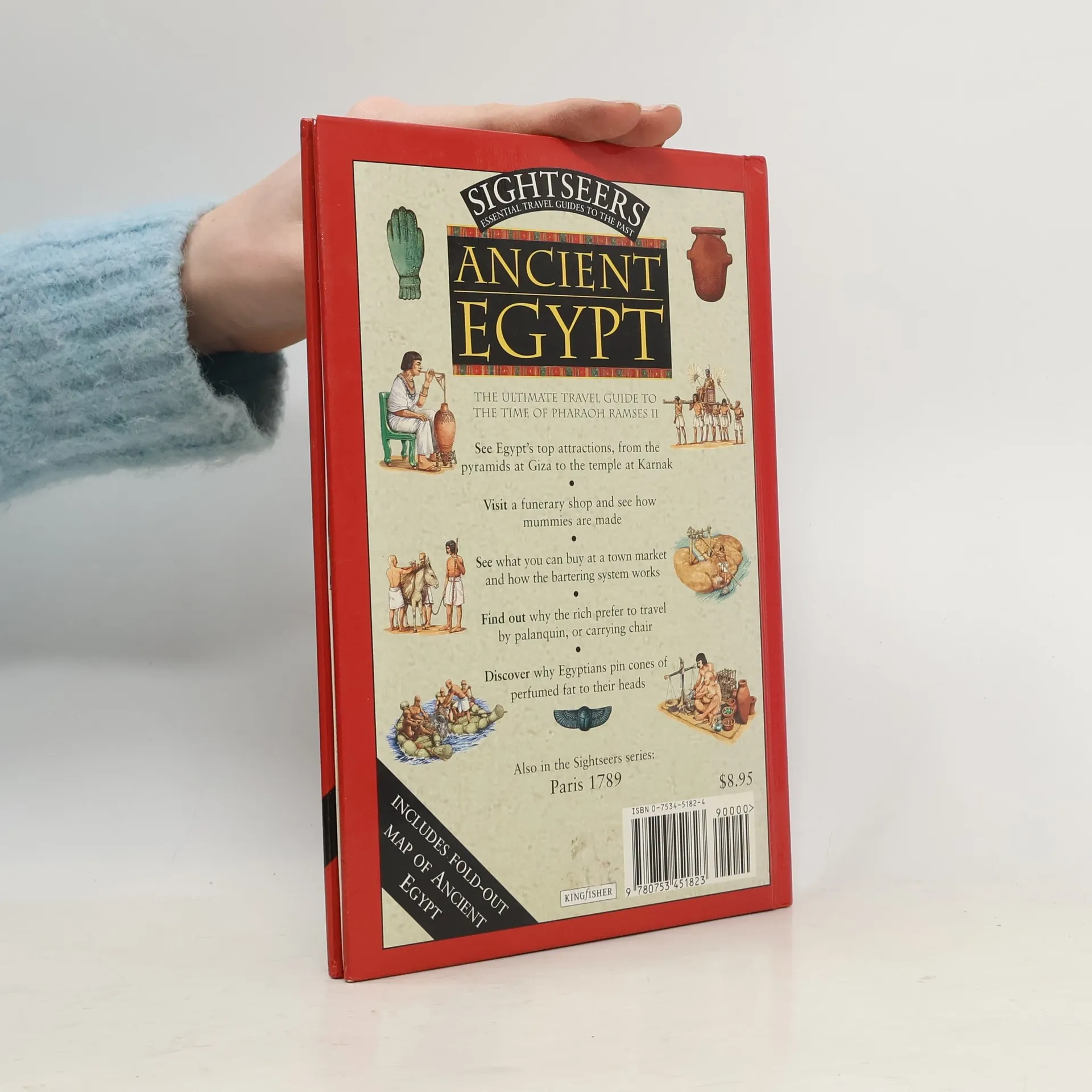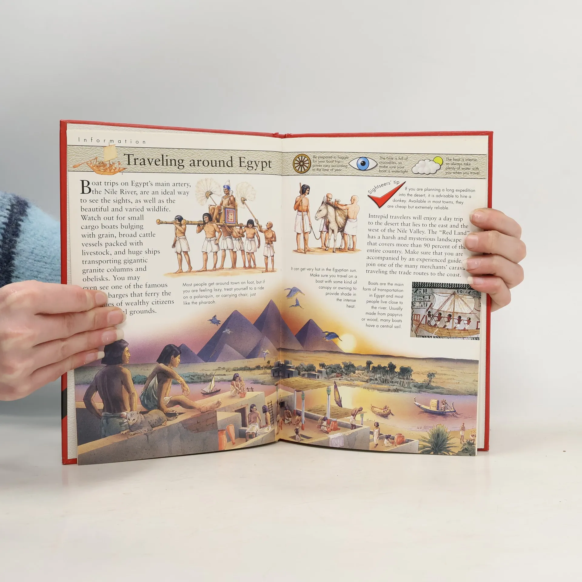 Take a boat trip down the crocodile-infested Nile, travel by donkey to the pyramids at Giza, and hire a palanquin to complete the tour in style. This historical travel guide is packed with fascinating facts and colorful illustrations offering kids a unique and enjoyable way to look at Ancient Egypt, its people, places and customs. Looking under headings such as "Accommodation" reveals that a comfortable night's sleep in Thebes may be hard to find since beds were made with ropes or leather straps. "Top attractions" include the recently constructed temples at Karnak and Luxor, and "Getting around" includes tips on the safest ways to travel. Kids will be amused to discover why fashionable folk pin cones of perfumed fat to their heads, how "sniffer baboons" patrol the markets for thieves, and how to avoid being roped into service in the harvest season. A fold-out map at the end of the book helps kids locate all the sites mentioned, and a "tourist quiz" lets young Egyptologists test themselves on the essential information they need to know before they go!