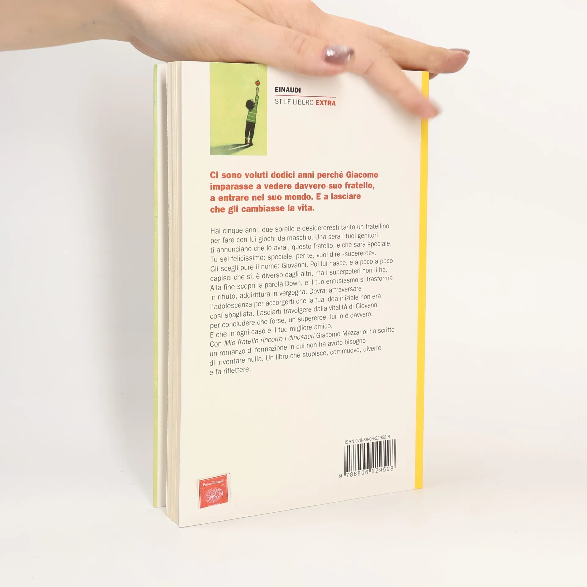 Mi chiamo Giacomo Mazzariol, ho diciotto anni. Vivo in una cittadina del Veneto con i miei genitori, le mie sorelle Chiara e Alice e mio fratello Giovanni. Io sono il secondogenito, Giovanni è il più piccolo; ci togliamo sei anni. Ci sono alcune cose che dovete sapere, di Giovanni. Lui è uno che, se va a prendere il gelato e gli chiedono: "Cono o coppetta?", risponde: "Cono!", e se io gli faccio notare che poi il cono non lo mangia dice: "Be', neanche la coppetta la mangio!" Giovanni è uno che paga, prende il resto e lo butta via con lo scontrino. È uno che ruba il cappello a un barbone e scappa. Che ama i dinosauri e il rosso. Che va al cinema con una compagna di classe, torna a casa e annuncia che si è sposato. Che balla in mezzo alla piazza, da solo, al suono della musica di un artista di strada, e uno dopo l'altro i passanti cominciano a imitarlo: Giovanni è uno che fa ballare le piazze. Per lui il tempo è sempre venti minuti, mai più di venti minuti: se uno va in vacanza per un mese, è stato via venti minuti. Ogni giorno va in giardino e porta un fiore alle sorelle, e se è inverno e non ne trova, porta loro foglie secche. Giovanni sa essere estenuante, logorante. Giovanni ha dodici anni e un sorriso più grande dei suoi occhiali. È molto meno bravo di me in matematica, però è più simpatico. Giovanni ha un cromosoma in più.