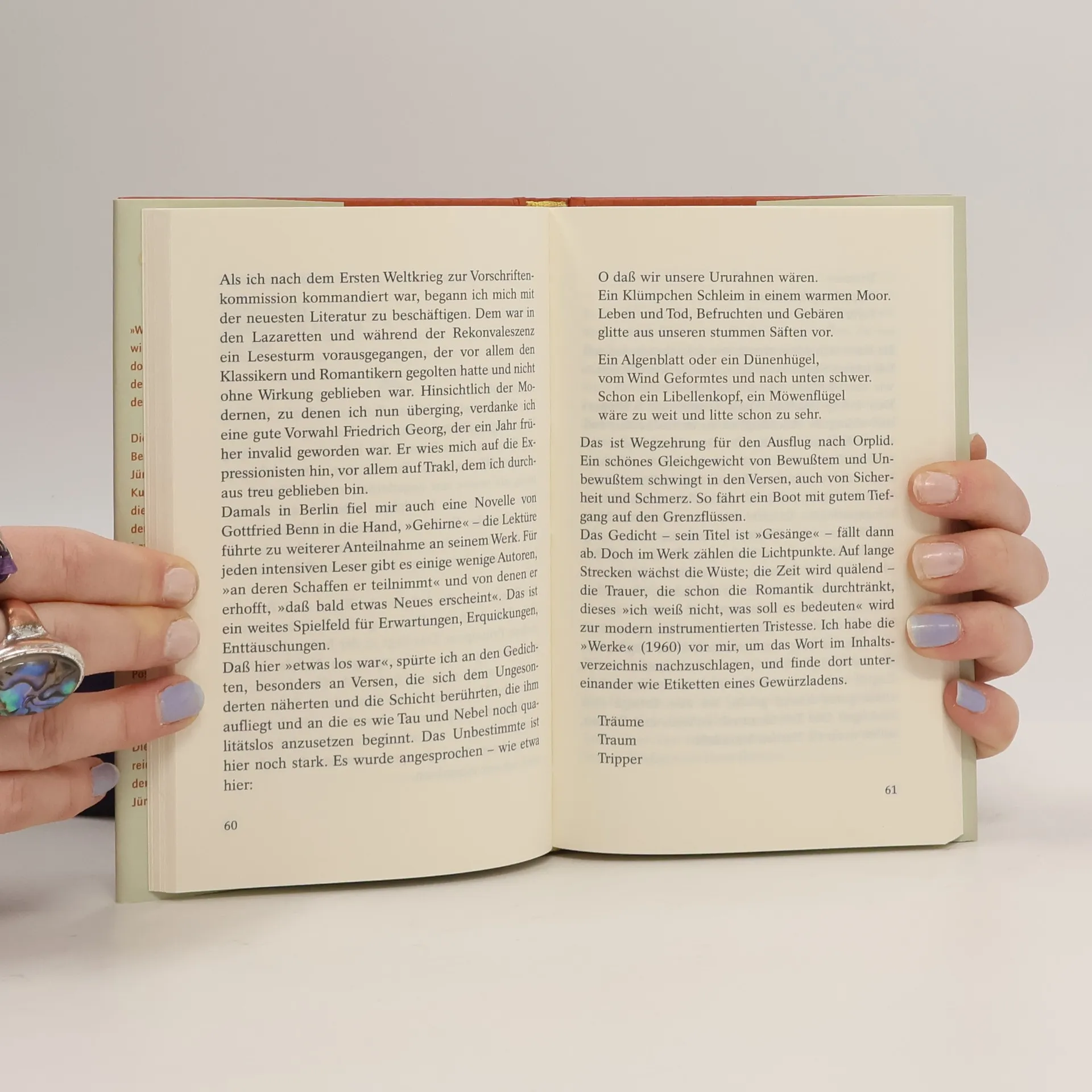 »Wir sind von außen oft verbunden, / wir sind von innen meist getrennt, / doch teilen wir den Strom, die Stunden / den Ecce-Zug, den Wahn, die Wunden / des, das sich das Jahrhundert nennt.« Dieses berühmte Gedicht Gottfried Benns ist überschrieben: »An Ernst Jünger«. Es ist wohl der künstlerische Kulminationspunkt einer Beziehung, die mit einem Brief Jüngers Anfang der zwanziger Jahre begann: Jünger hatte damals Benns »Rönne«-Prosa bewundert. 1949 dann beginnt eine schriftliche Annäherung Jüngers an den bewunderten Dichterkollegen. Im Lauf der nächsten sechs Jahre, bis zu Benns Tod im Juli 1956, wechseln die beiden ca. 50 Briefe, Telegramme, Postkarten und Widmungsexemplare. Im Mai 1952 kommt es zum einzigen persönlichen Zusammentreffen in Benns Wohnung, Berlin Schöneberg. Dieser Abend, an dem auch der Cognac reichlich fließt, ist in einer hinreißenden Passage der »Annäherungen« Jüngers beschrieben.