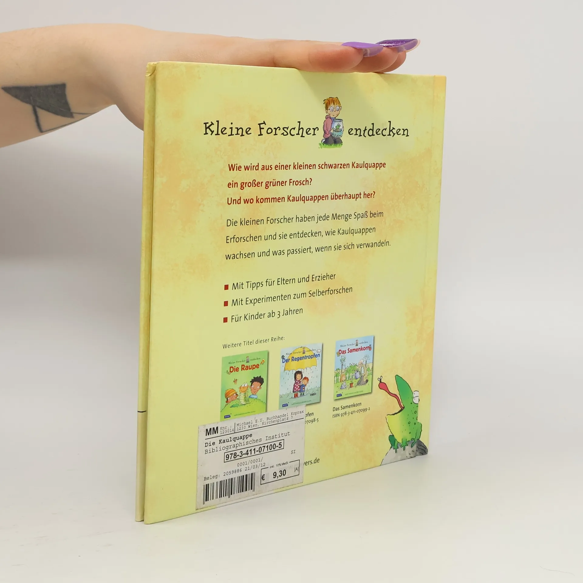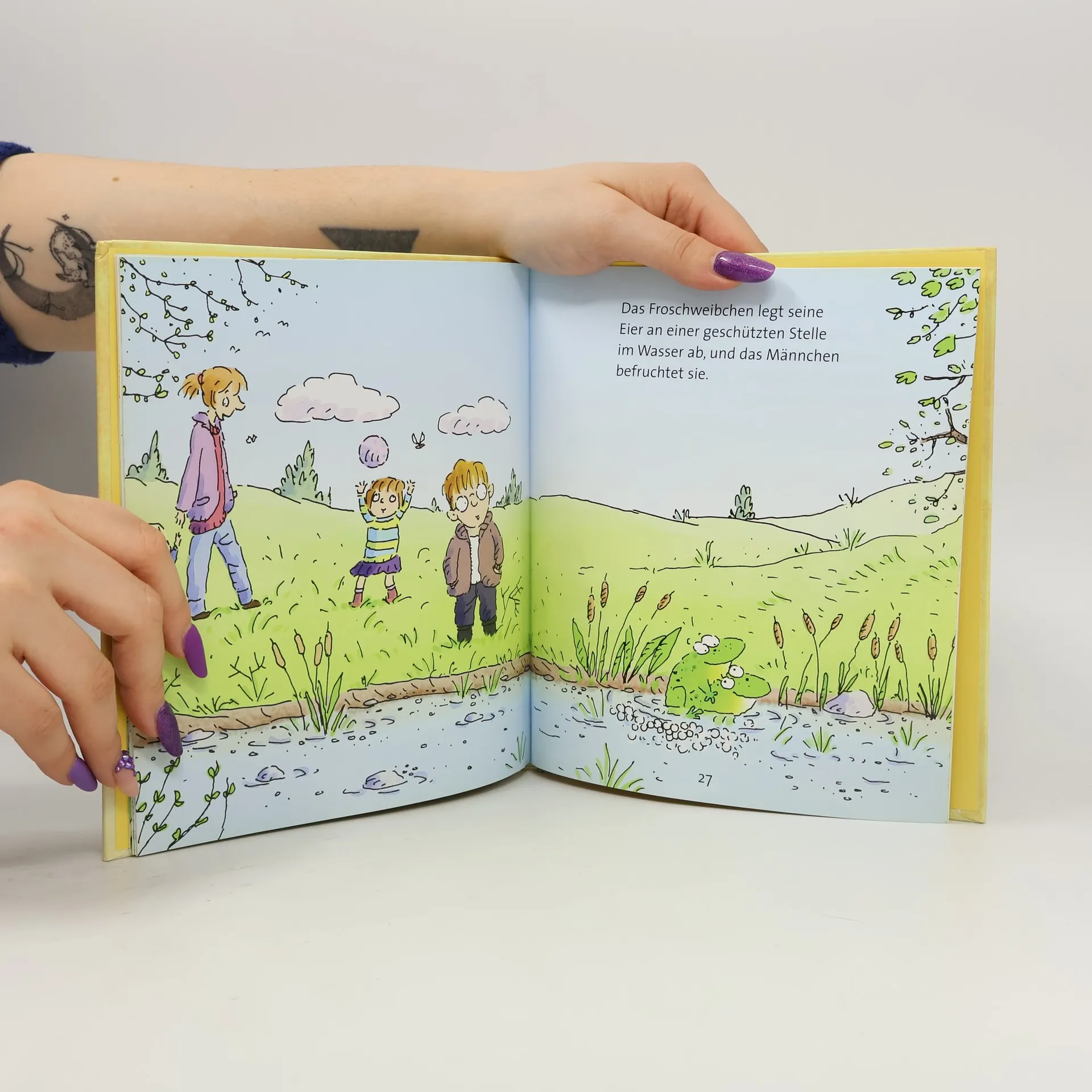 Drei Kinder bekommen aus einem Gartenteich etwas Froschlaich und beobachten die Verwandlung vom Ei zur Kaulquappe und schliesslich zum Jungfrosch, bevor sie die Tiere wieder am Teich freilassen. Ab 3.