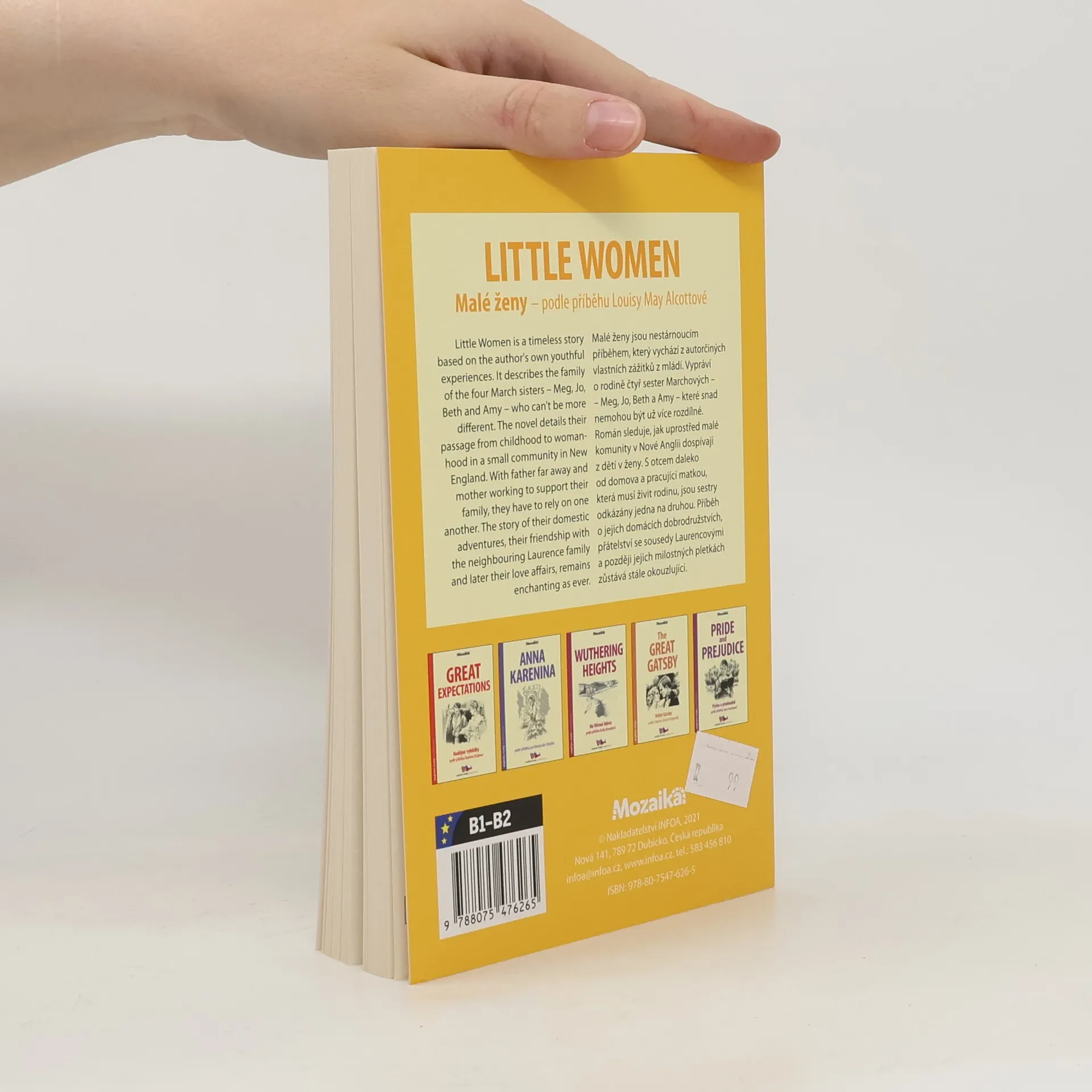 Malé ženy jsou nestárnoucím příběhem, který vychází z autorčiných vlastních zážitků z mládí. Vypráví o rodině čtyř sester Marchových, Meg, Jo, Beth a Amy, které snad nemohou být už více rozdílné. Román sleduje, jak uprostřed malé komunity v Nové Anglii dospívají z dětí v ženy. S otcem daleko od domova a pracující matkou, která musí živit rodinu, jsou sestry odkázány jedna na druhou. Příběh o jejich domácích dobrodružstvích, přátelství se sousedy Laurencovými a později jejich milostných pletkách zůstává stále okouzlující. Anglicko-český zrcadlový text pro mírně pokročilé Little Women is an ageless story based on the author's own experiences from her youth. It tells the story of a family of four March sisters, Meg, Jo, Beth and Amy, who perhaps can no longer be different. The novel follows the development of children from women into women in the middle of a small community in New England. With a father away from home and a working mother who has to support the family, the sisters depend on each other. The story of their home adventures, their friendship with Laurence's neighbors and later their love affairs still remains enchanting. English-Czech mirror text for intermediate students