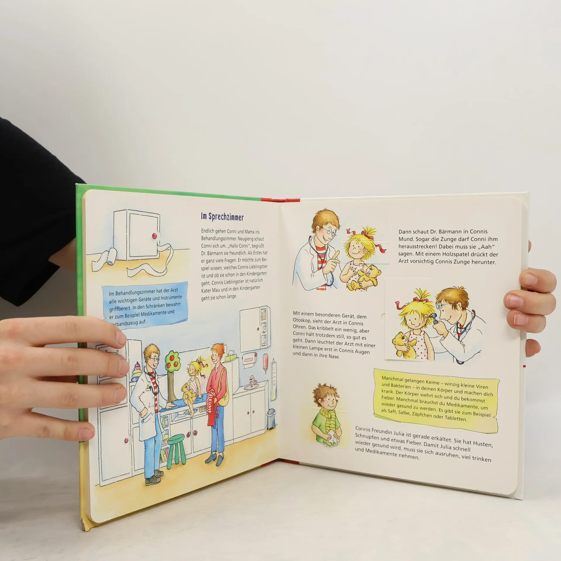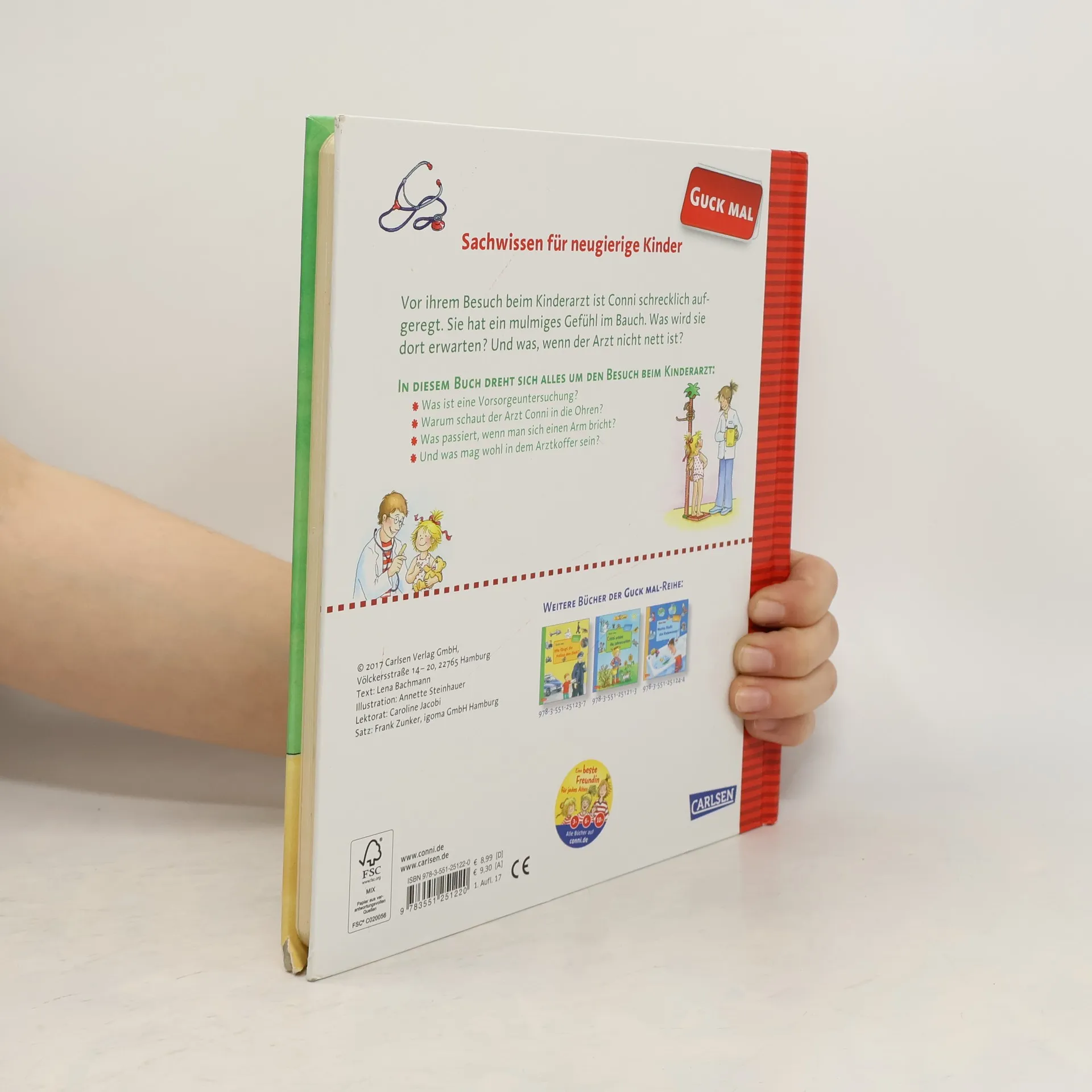 Die neue Sachbuchreihe „Guck mal“ gibt Kindergartenkindern ab 3 Jahren Antworten auf Alltagsfragen. Zum Beispiel: Wie ist es beim Kinderarzt? Conni, die beliebte und bekannte Kinderbuchfigur, erlebt einen aufregenden Tag: Sie geht zum Kinderarzt! Zuerst hat sie ein mulmiges Gefühl im Bauch. Was ist, wenn der Arzt nicht nett ist? Und was passiert eigentlich bei einer Vorsorgeuntersuchung? Ein spannender Besuch beginnt: Conni wird gewogen, gemessen und von Kopf bis Fuß untersucht. Auch der Sehtest ist gar nicht schlimm – und ob Conni sogar in den Arztkoffer schauen darf? Dieses Buch gibt Antworten auf alle Fragen, die Kindergartenkinder zum Arztbesuch haben und vermittelt spielerisch erstes Sachwissen über den Körper. Die Bücher der Reihe „Guck mal“ sind Sachbilderbücher für Kinder, die nach dem Wie und Wieso fragen und wissen wollen, wie die Dinge zusammenhängen.