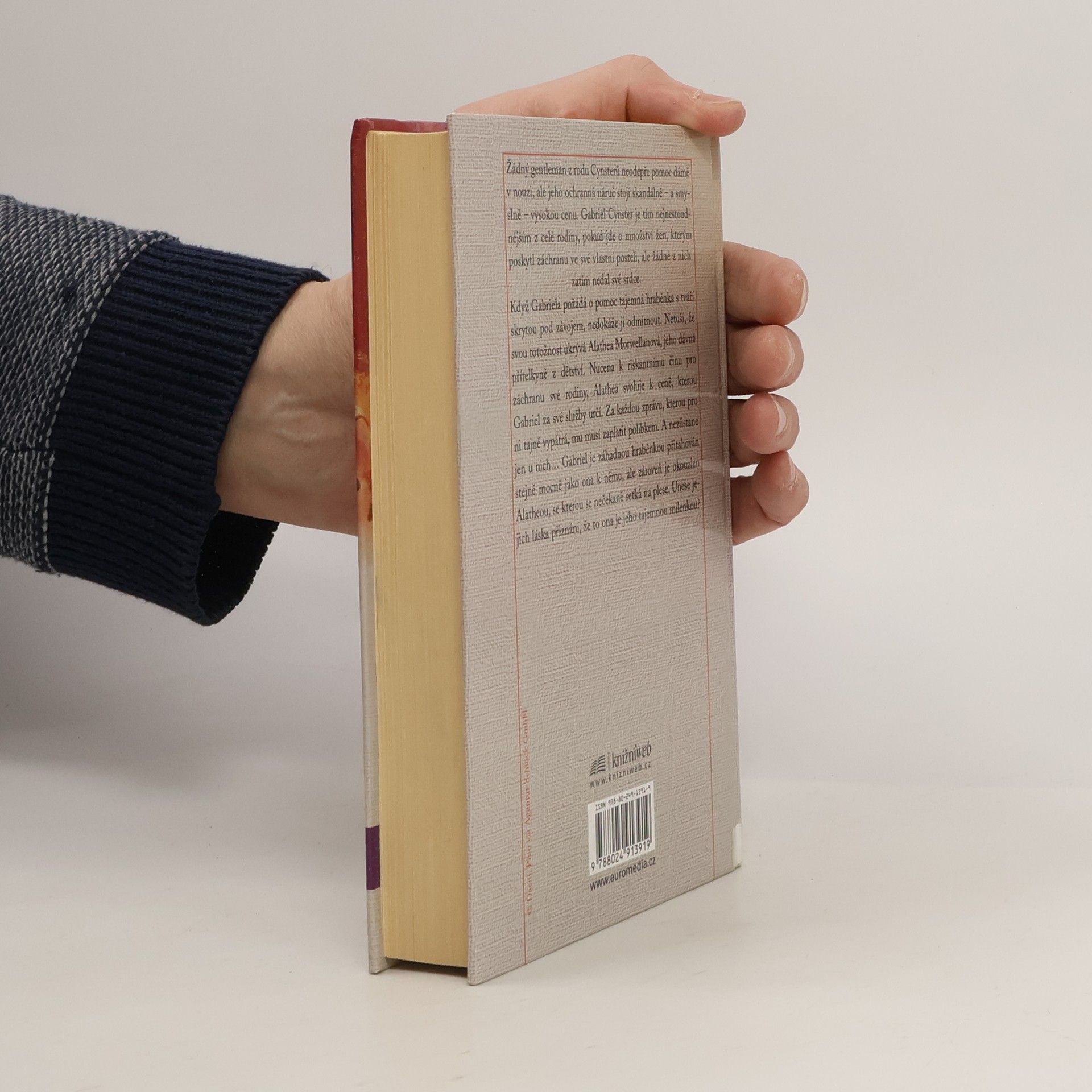 Londýn, 1820 Žádný gentleman z rodu Cynsterů neodepře pomoc dámě v nouzi, ale jeho ochranná náruč stojí skandálně - a smyslně - vysokou cenu. Gabriel Cynster je tím nejnestoudnějším z celé rodiny, pokud jde o množství žen, kterým poskytl záchranu ve své vlastní posteli, ale žádné z nich zatím nedal své srdce. Když Gabriela požádá o pomoc tajemná hraběnka s tváří skrytou pod závojem, nedokáže ji odmítnout. Netuší, že svou totožnost ukrývá Alathea Morwellanová, jeho dávná přítelkyně z dětství. Nucena k riskantnímu činu pro záchranu své rodiny, Alathea svoluje k ceně, kterou Gabriel za své služby určí. Za každou zprávu, kterou pro ni tajně vypátrá, mu musí zaplatit polibkem. A nezůstane jen u nich... Gabriel je záhadnou hraběnkou přitahován stejně mocně jako ona k němu, ale zároveň je okouzlen Alatheou, se kterou se nečekaně setká na plese. Unese jejich láska přiznání, že to ona je jeho tajemnou milenkou?