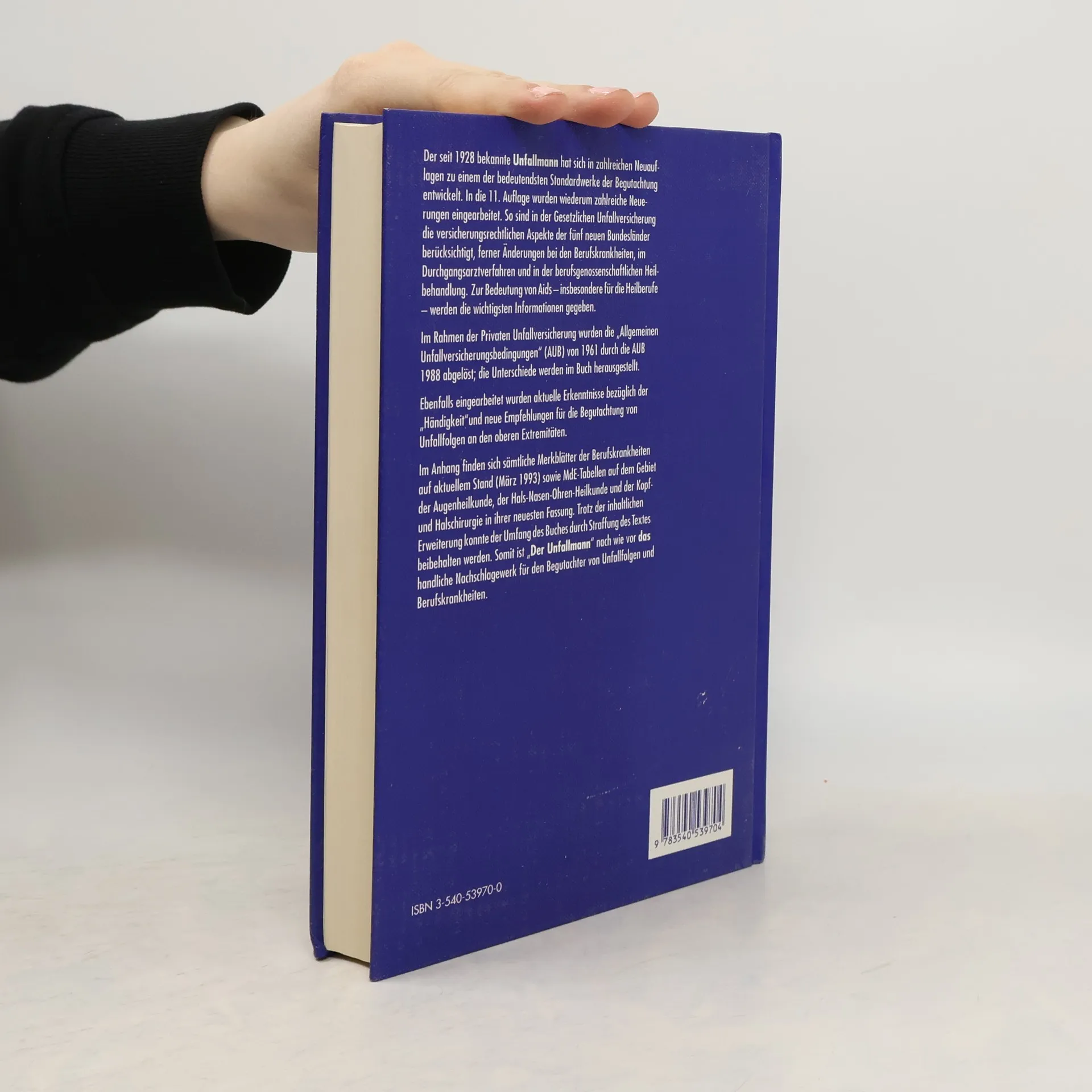Der seit 1923 bekannte "Unfallmann" hat sich in zahlreichen Neuauflagen zu einem der bedeutendsten Standardwerke der Be- gutachtung entwickelt. In die 11. Auflage wurden wiederum zahlreiche Neuerungen eingearbeitet. So sind in der Gesetz- lichen Unfallversicherung die versicherungsrechtlichen Aspekte der 5 neuen Bundesl{nder ber}cksichtigt, ferner n- derungen bei den Berufskrankheiten, im Durchgangsarztverfah- ren und in der berufgenossenschaftlichen Heilbehandlung. Die Bedeutung der erworbenen Immunschw{che Aids, insbesondere f}r die Heilberufe, wird aufgezeigt. Im Rahmen der Privaten Unfallversicherung wurden die "Allgemeinen Unfallversiche- rungsbedingungen" (AUB) von 1961 durch die AUB 1988 abgel]st und werden in dieser Neuauflage erstmals gegen}bergestellt. Ebenfalls eingearbeitet wurden aktuelle Erkenntnisse aus dem Gebiet der "H{ndigkeit" und neue Empfehlungen f}r die Begut- achtungvon Unfallfolgen an den oberen Extremit{ten. Im An- hang finden sich s{mtliche Merkbl{tter der Berufskrankheiten sowie MdE-Tabellen auf dem Gebiet der Augenheilkunde, der Hals-Nasen-Ohrenheilkunde und der Kopf- und Halschirurgie in ihrer neuesten Fassung. Trotz der inhaltlichen Erweiterung konnte der Umfang des Buches durch Straffung des Textes bei- behalten werden. Somit ist der "Unfallmann" nach wie vor das handliche Nachschlagewerk f}r den Begutachter von Unfallfol- gen undBerufskrankheiten. Die in }ber einem halben Jahrhun- dert eingebrachten Erfahrungen und Verbesserungen machen den "Unfallmann" unentbehrlich f}r diePraxis des Gutachters.