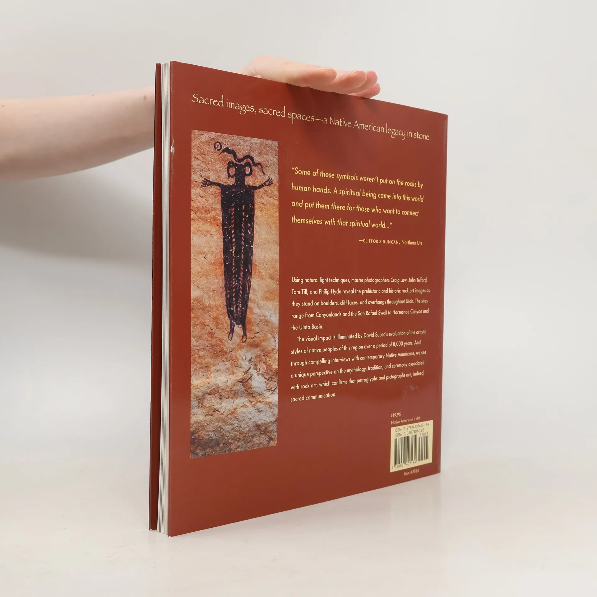 Sacred A Vision of Native American Rock Art brings together the talents of four Utah wilderness photographers and the storytelling skills of its indigenous peoples to present the visionary power of Utah rock art. Photographers Craig Law, John Telford, Tom Till, and Philip Hyde reveal prehistoric and historic rock art images on boulders, cliff faces, and overhangs.