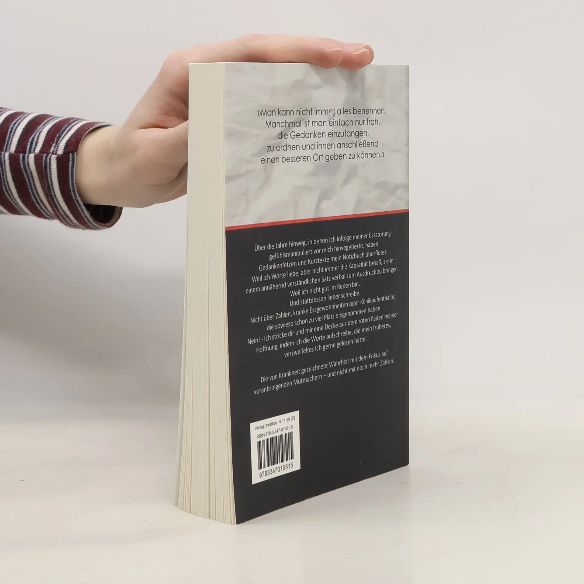 Über die Jahre hinweg, in denen ich infolge meiner Essstörung gefühlsmanipuliert vor mich hinvegetierte, haben Gedankenfetzen und Kurztexte mein Notizbuch überflutet: Weil ich Worte liebe, aber nicht immer die Kapazität besaß, sie in einem annähernd verständlichen Satz verbal zum Ausdruck zu bringen. Weil ich nicht gut im Reden bin. Und stattdessen lieber schreibe. Nicht über Zahlen, kranke Essgewohnheiten oder Klinikaufenthalte, die sowieso schon zu viel Platz eingenommen haben. Nein! - Ich stricke dir und mir eine Decke aus dem roten Faden meiner Hoffnung, indem ich die Worte aufschreibe, die mein früheres, verzweifeltes Ich gerne gelesen hätte: Die von Krankheit gezeichnete Wahrheit mit dem Fokus auf voranbringenden Mutmachern - und nicht mit noch mehr Zahlen. Man kann nicht immer alles benennen. Manchmal ist man einfach nur froh, die Gedanken einzufangen, zu ordnen und ihnen anschließend einen besseren Ort geben zu können.