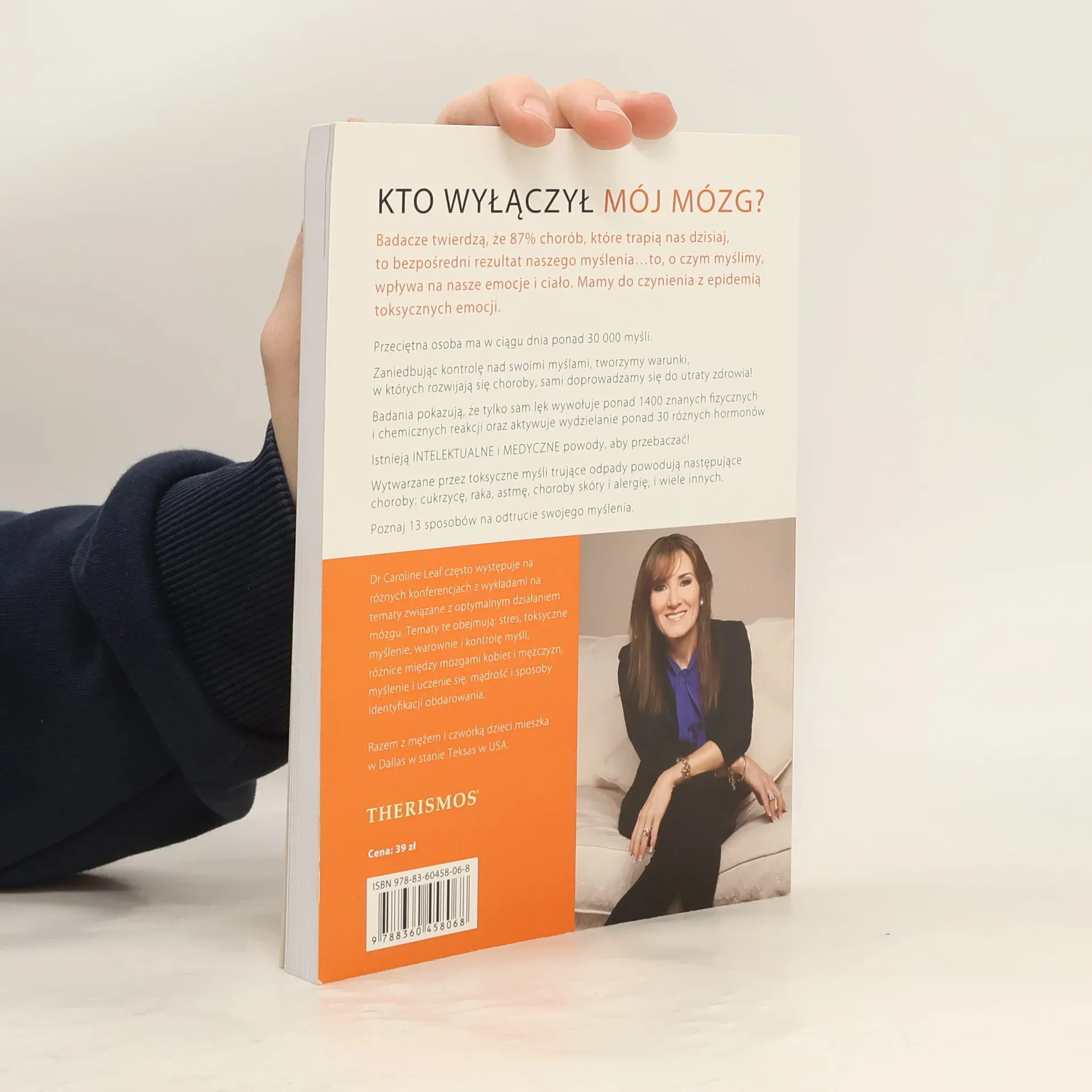 Badacze twierdzą, że 87% chorób, które trapią nas dzisiaj, to bezpośredni rezultat naszego myślenia... to, o czym myślimy, wpływa na nasze emocje i ciało. Mamy do czynienia z epidemią toksycznych emocji. Przeciętna osoba ma w ciągu dnia ponad 30 000 myśli. Zaniedbując kontrolę nad swoimi myślami, tworzymy warunki, w których rozwijają się choroby, sami doprowadzamy do utraty zdrowia! Badania pokazują, ze tylko sam lęk wywołuje ponad 1400 znanych fizycznych i chemicznych reakcji oraz aktywuje wydzielanie ponad 30 różnych hormonów. Istnieją INTELEKTUALNE i MEDYCZNE powody, aby przebaczać! Wytwarzane przez toksyczne myśli trujące odpady powodują następujące choroby: cukrzycę, raka, astmę, choroby skóry i alergie, i wiele innych. Poznaj 13 sposobów na odtrucie swojego myślenia. Dr Caroline Leaf często występuje na różnych konferencjach z wykładami na tematy związane z optymalnym działaniem mózgu. Tematy te obejmują: stres, toksyczne myślenie, warownie i kontrolę myśli, różnice między mózgami kobiet i mężczyzn, myślenie i uczenie się, mądrość i sposoby identyfikacji obdarowania. Razem z mężem i czwórką dzieci mieszka w Dallas w stanie Teksas w USA.