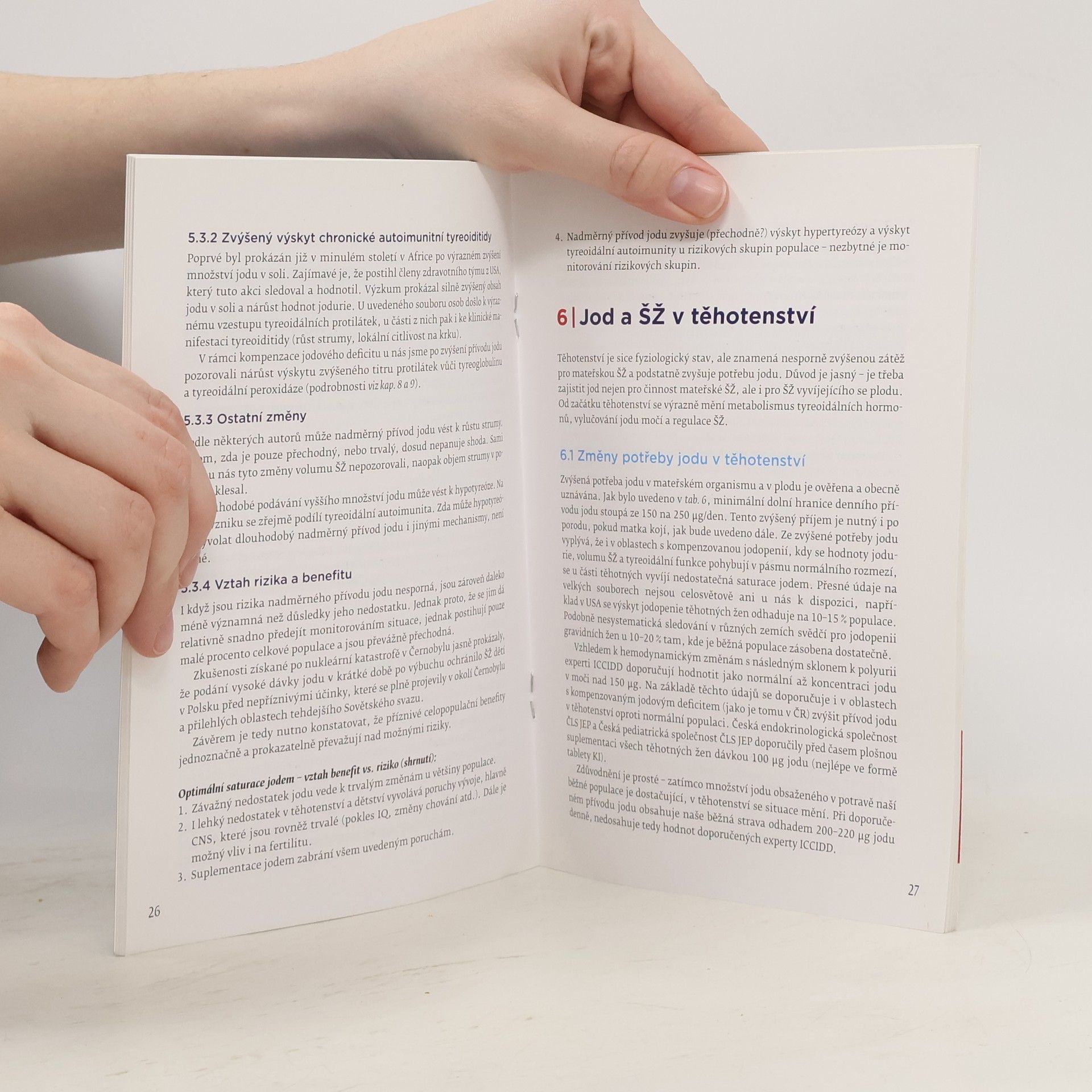 Optimální přívod jodu a poruchy z jeho nedostatku Cílem publikace je upozornit na fakt, že stále existují skupiny obyvatel ohrožené jodovým deficitem, které je vzhledem k potenciálním závažným následkům pro jejich organismus nezbytné aktivně vyhledávat. Autoři se zabývají současným stavem saturace jodem jak ve světě, tak i u nás, a uvádějí přehled opatření, která by měla přispět ke zlepšení jodace jedlé soli i její distribuce a k optimalizaci jejího přívodu. Důležitou součástí knížky je stať věnující se saturaci jodem v období těhotenství. Probrána jsou rovněž rizika nadměrného přívodu jodu, zejména u pacientů s autoimunitním postižením štítné žlázy. Dále jsou zde uvedeny výsledky rozsáhlého epidemiologického průzkumu populace v ČR, který probíhal na počátku 90. let minulého století, v kontextu s aktuálním stavem zásobení jodem v letech 2012–2013.