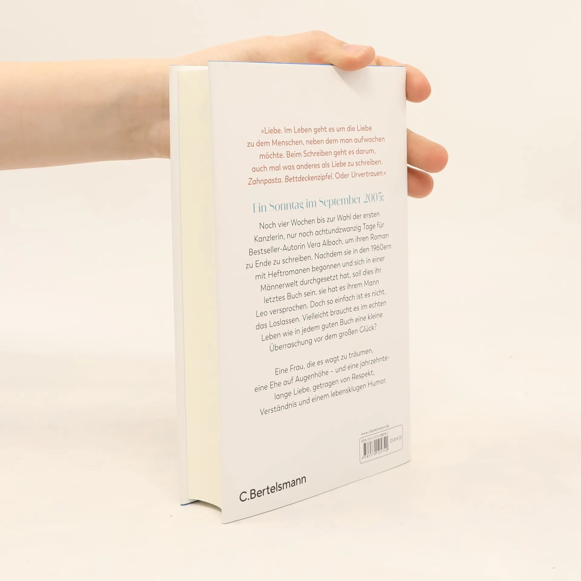 Eine Bestsellerautorin in der jungen Bundesrepublik. Eine Ehe voller Respekt und Humor. Und das Ringen um Anerkennung einer Frau in männderdominierten Zeiten. »Liebe. Im Leben geht es um die Liebe zu dem Menschen, neben dem man aufwachen möchte. Beim Schreiben geht es darum, auch mal was anderes als ›Liebe‹ zu schreiben. Zahnpasta. Oder Bettdeckenzipfel. Oder Urvertrauen.« Ein Sonntag im September 2005: Noch zwei Wochen bis zur Wahl der ersten Kanzlerin für Deutschland, nur noch 14 Tage für Bestseller-Autorin Vera Albach, um ihren Roman im Rekordtempo zu Ende zu schreiben. Nachdem sie in den 1960-ern mit Heftromanen begonnen und sich in einer Männerwelt durchgesetzt hat, soll dies ihr letztes Buch sein, sie hat es ihrem Mann Leo versprochen. Doch so einfach wie gedacht ist es nicht, das Loslassen. Vielleicht braucht es im echten Leben wie in jedem guten Buch eine kleine Überraschung vor dem großen Glück? Eine Frau, die es wagt zu träumen, eine Ehe auf Augenhöhe – und eine jahrzehntelange Liebe, getragen von Respekt, Verständnis und einem lebensklugen Humor.