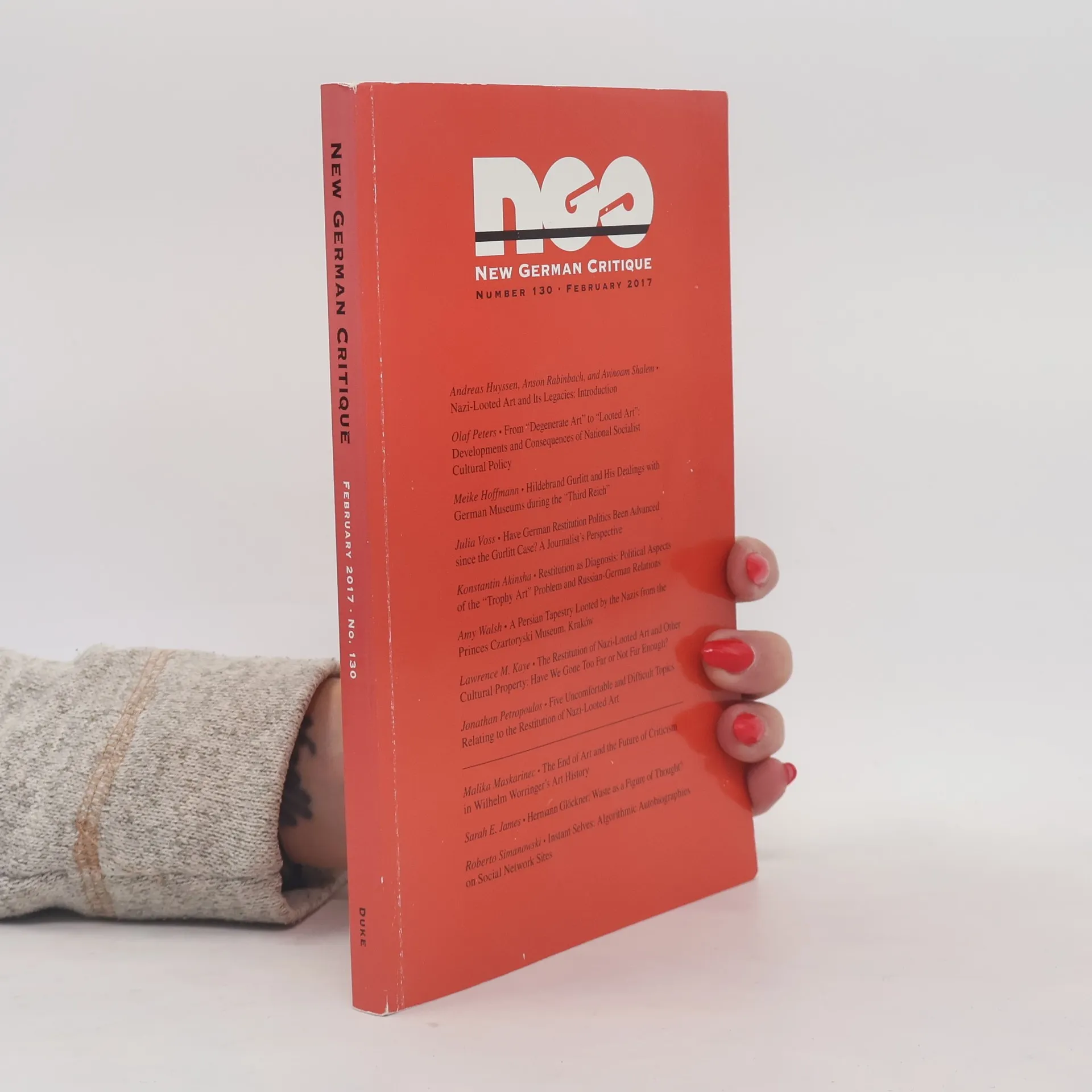 This issue examines the legacy of Nazi-looted art in light of the 2012 discovery of the famous Hildebrand Gurlitt collection of stolen artwork in Germany. When the German government declassified the case almost two years later, the resulting scandal raised fundamental questions about the role of art dealers in the Third Reich, the mechanics of the Nazi black market for artwork, the shortcomings of postwar denazification, the failure of courts and governments to adjudicate stolen artwork claims, and the unwillingness of museums to determine the provenance of thousands of looted pieces of art. The contributors to this issue explore the continuities of art dealerships and auction houses from the Nazi period to the Federal Republic and take stock of the present political and cultural debate over the handling of this artwork. Special topic contributors. Konstantin Akinsha, Meike Hoffmann, Andreas Huyssen, Lawrence M. Kaye, Olaf Peters, Jonathan Petropoulos, Anson Rabinbach, Avinoam Shalem, Julia Voss, Amy Walsh