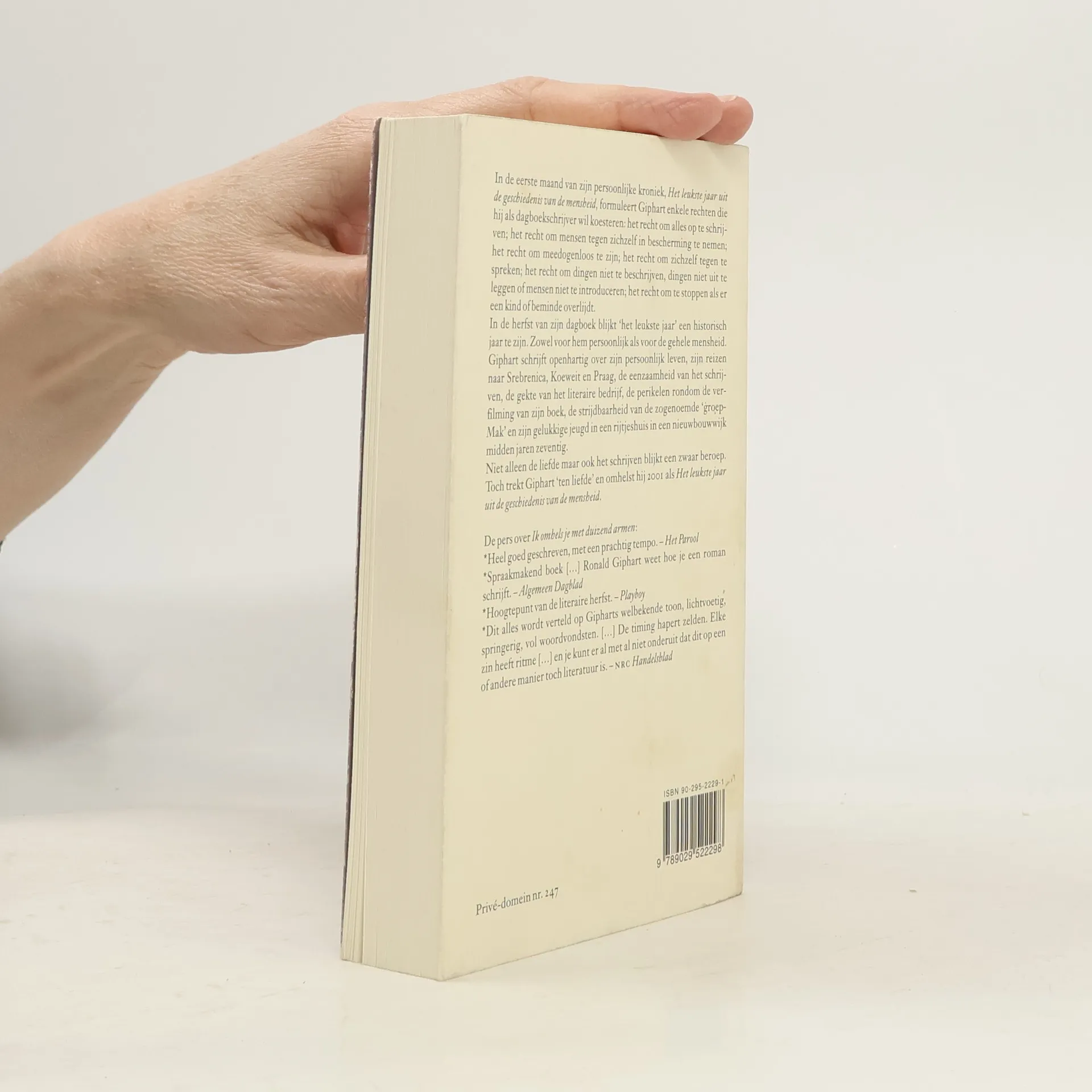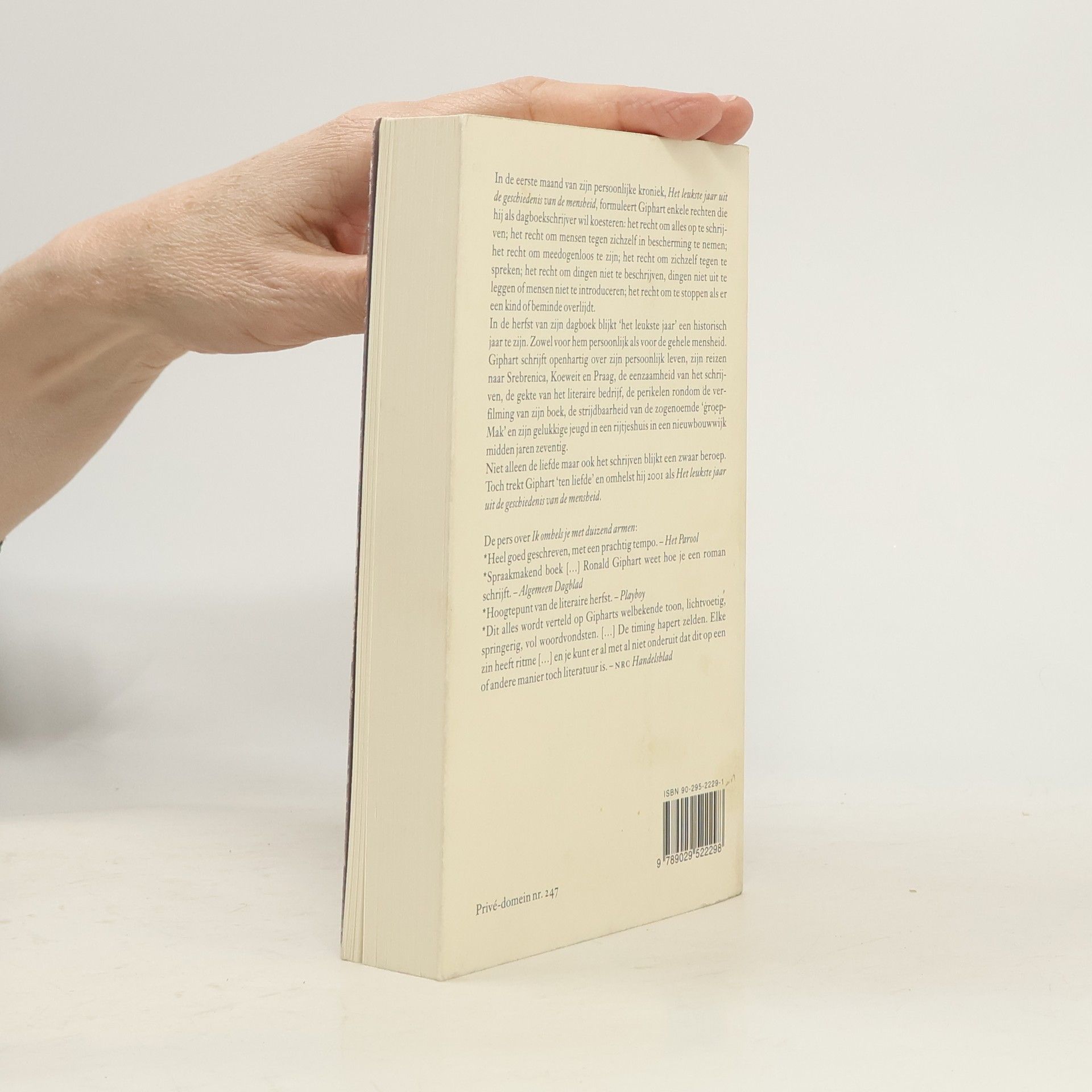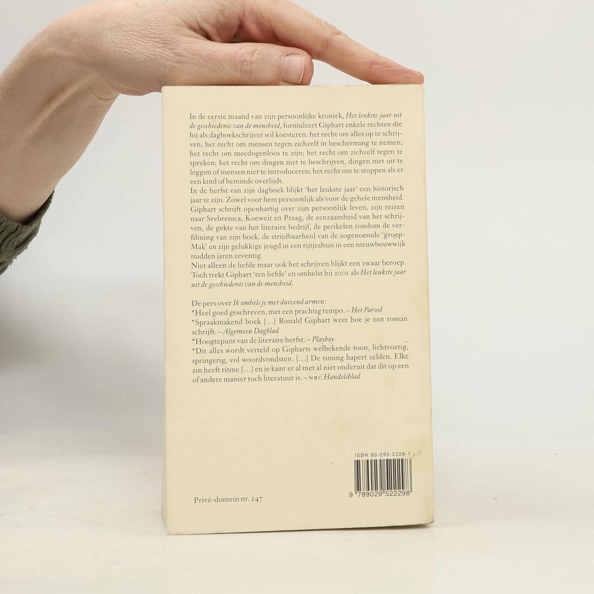 2001 bleek verre van het leukste jaar in de geschiedenis van de mensheid te zijn. Maar het was wel het jaar dat Ronald Giphart, de leukste schrijver van Nederland, dit dagboek schreef. En dat deed hij openhartig. Doorspekt met zijn bekende bijtende humor vertelt hij over de eenzaamheid van het schrijven, de gedragingen van zijn zoon en dochter, de perikelen rond de verfilming van Ik ook van jou, de reis die hij maakte naar Srebrenica, en natuurlijk over 11 september. Maar ook over de strijdbaarheid van de groep-Mak en zijn gelukkige jeugd in een nieuwbouwrijtjeshuis midden jaren zeventig.De veelgelezen schrijver Ronald Giphart (1965) hield op verzoek van Uitgeverij De Arbeiderspers in 2001 een persoonlijk dagboek bij ten behoeve van de prestigieuze reeks Prive-Domein. Giphart schreef over politiek, literatuur, vrienden, kroegen, optredens, kinderen, huizen, relaties, film en nog veel meer; soms feitelijk, veelal aangenaam subjectief. Als lezer krijg je enig inzicht in het eenmansliteratuurbedrijf dat Giphart runt, in zijn opvattingen, zijn emoties en zijn drukke agenda. Giphart kan schrijven, vaak humoristisch, soms ontroerend, dikwijls bevlogen en altijd boeiend.