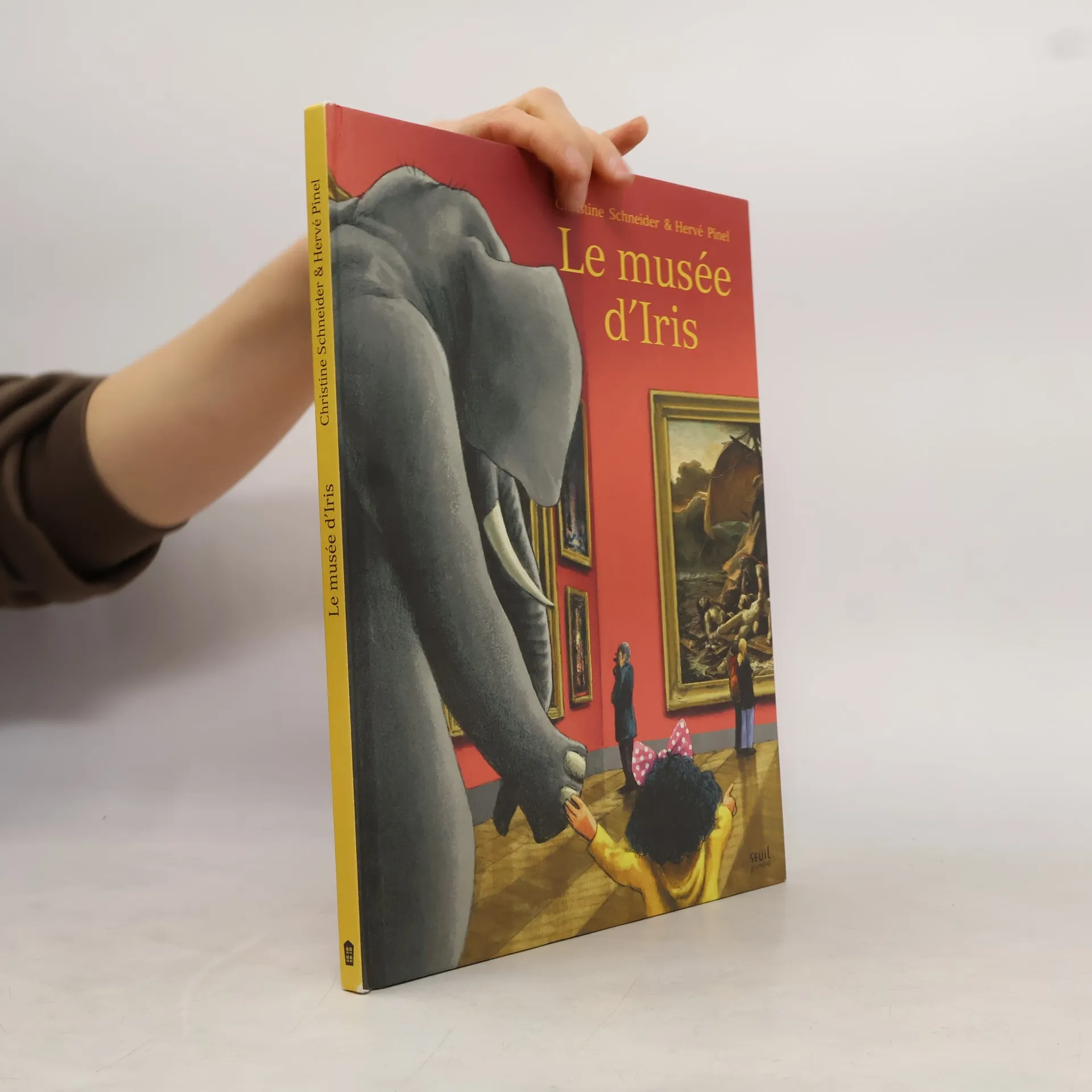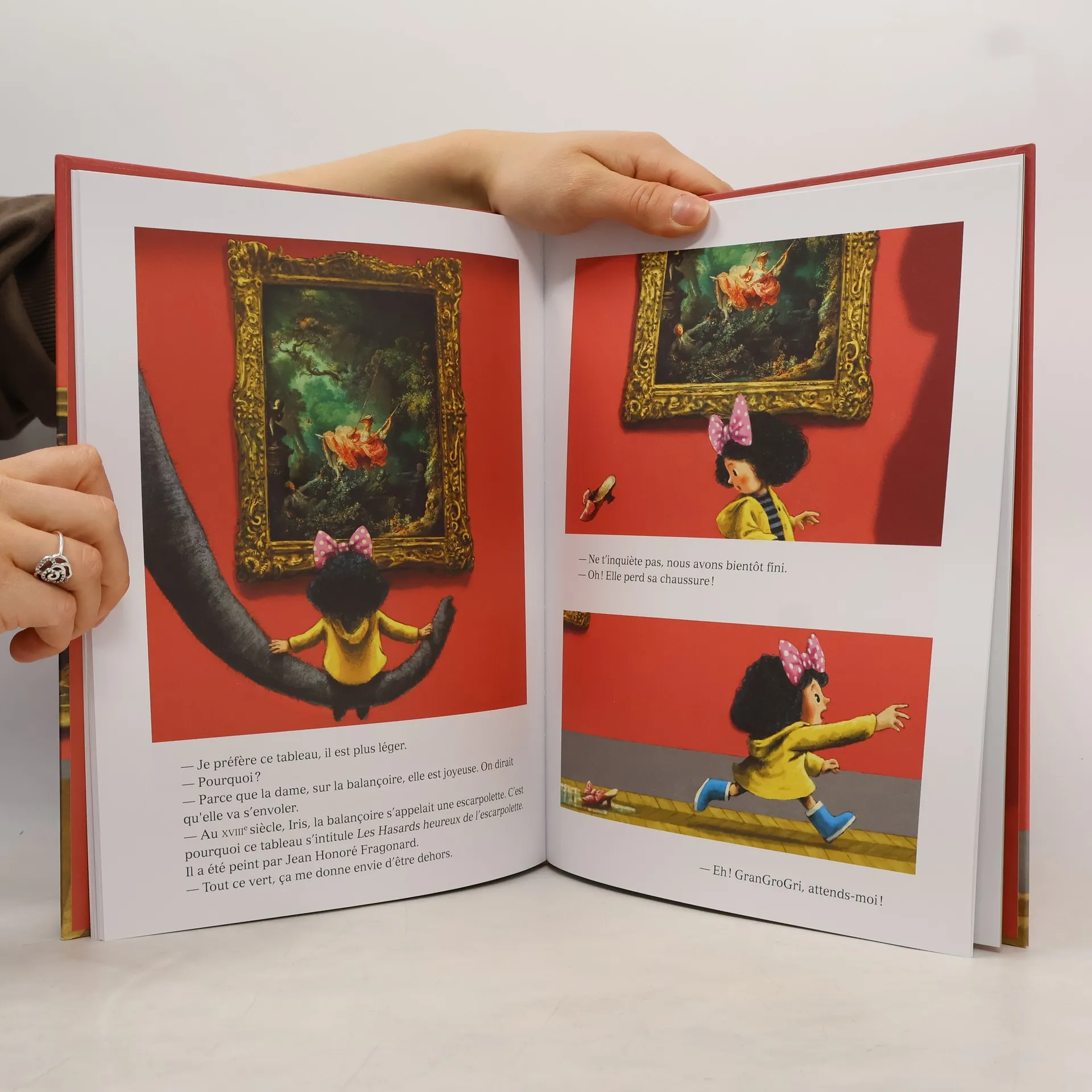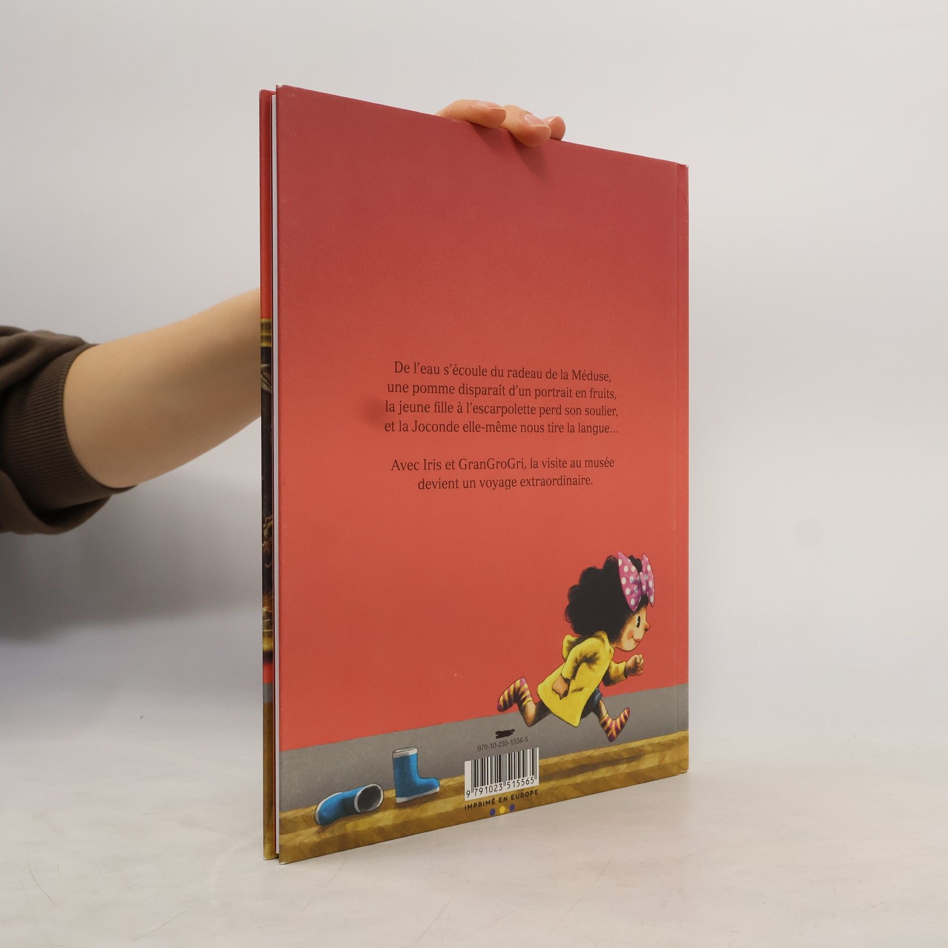 Il pleut, aujourd'hui. Iris s'ennuie à la maison. Pour la distraire, son ami, l'éléphant GranGroGri, l'emmène au musée. En route pour une visite à nulle autre pareille, où les peintures semblent douées de vie : de l'eau s'écoule du Radeau de la Méduse, une pomme s'échappe du portrait en fruit d'Arcimboldo, la jeune fille à l'escarpolette perd son soulier, et la Joconde elle-même se met à tirer la langue. Avec Iris et GranGroGri, la visite au musée se transforme en un voyage plein de surprises, ou chaque péripétie permet d'en apprendre plus sur un chef-d'oeuvre. Liste des oeuvres racontées : Un paysage d’hiver avec patineurs et trappe aux oiseaux , de Brueghel l’Ancien ; Le Radeau de la Méduse de Théodore Géricault ; La Joconde , de Léonard de Vinci ; Le Cri , d'Edward Munch ; Les Iris , de Vincent Van Gogh ; Le Voyageur contemplant une mer de nuages, de Gaspard Friedrich ; Les Hasards heureux de l’escarpolette, deJean-Honoré Fragonard ; Danseuse basculant , d'Edgar Degas ; L'Eté , d'Arcimboldo ; Le Rêve , du Douanier-Rousseau ; La Madeleine à la veilleuse de Georges de La Tour.