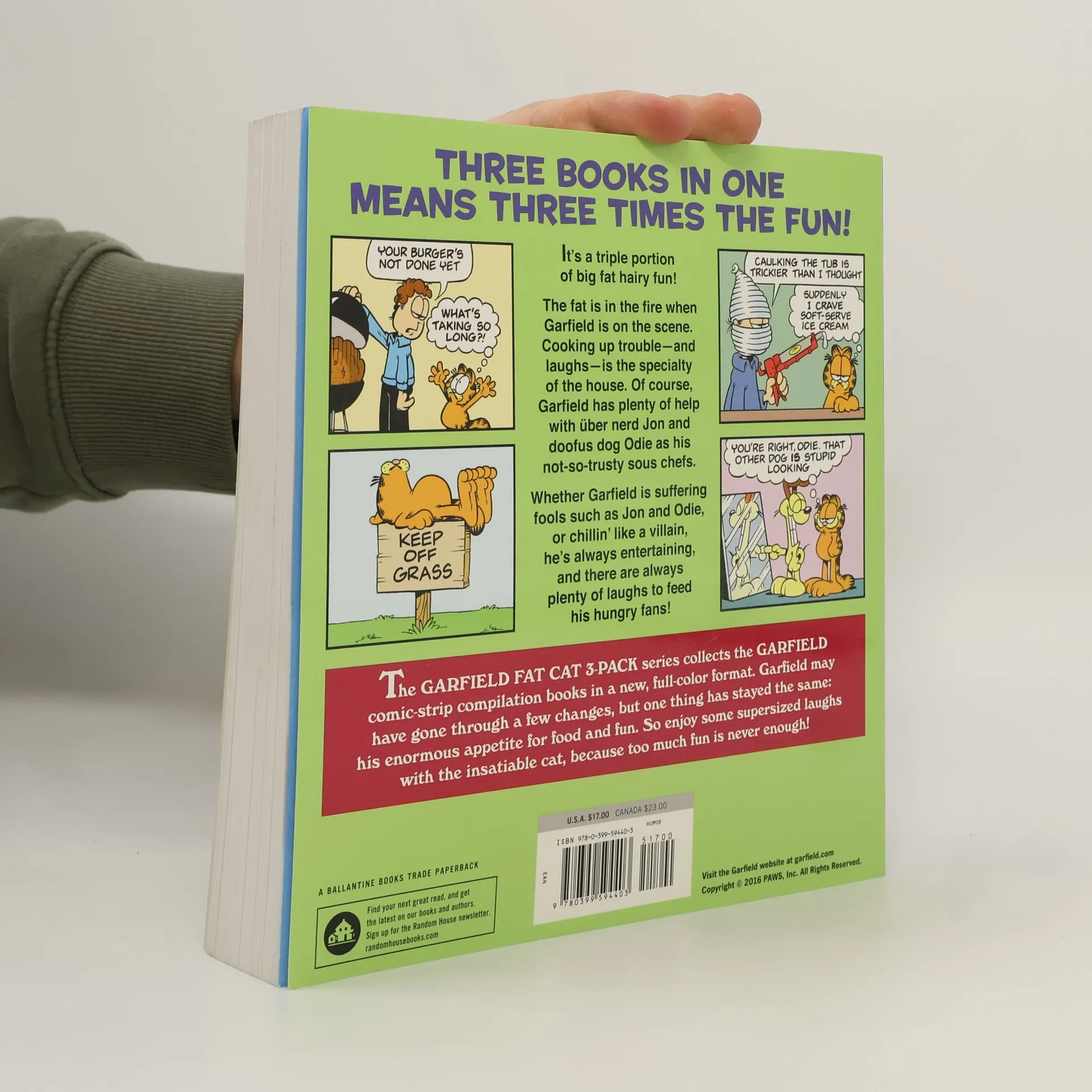 This uproarious collection includes three books in Garfield Lard of the Jungle, Garfield Brings Home the Bacon, and Garfield Gets in a Pickle . It’s a triple portion of big fat hairy fun! The fat is in the fire when Garfield is on the scene. Cooking up trouble—and laughs—is the specialty of the house. Of course, Garfield has plenty of help with über nerd Jon and doofus dog Odie as his not-so-trusty sous chefs. Whether Garfield is suffering fools such as Jon and Odie, or chillin’ like a villain, he’s always entertaining, and there are always plenty of laughs to feed his hungry fans! The GARFIELD FAT CAT 3-PACK series collects the GARFIELD comic-strip compilation books in a new, full-color format. Garfield may have gone through a few changes, but one thing has stayed the his enormous appetite for food and fun. So enjoy some supersized laughs with the insatiable cat, because too much fun is never enough!