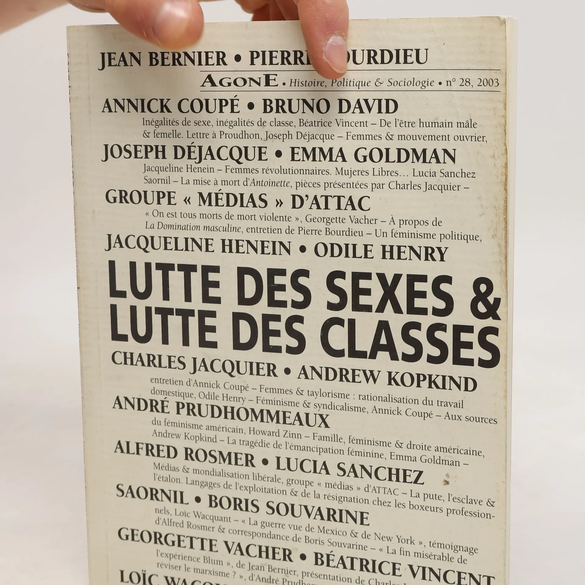 Agone. Histoire, Politique & Sociologie - 28: Lutte des sexes et lutte des classes, Jean Bernier, Pierre Bourdieu, Annick Coupé, Bruno David, Joseph Déjacque, Emma Goldman, Groupe « Médias » d'ATTAC, Jacqueline Henein, Odile Henry, Charles Jacquier, Andrew Kopkind, André Prudhommeaux, Alfred Rosmer, Lucía Sánchez Saornil, Boris Souvarine, Georgette Vacher, Béatrice Vincent, Loi c. Wacquant, Howard Zinn, Collectif