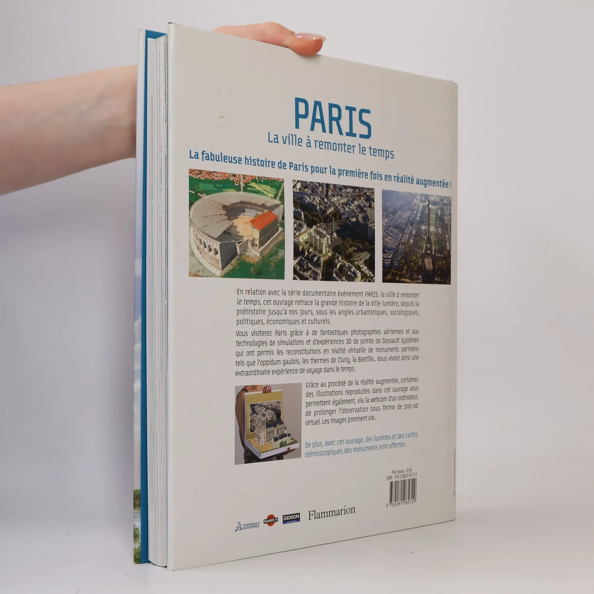 En relation avec la série documentaire événement PARIS, la ville à remonter le temps, cet ouvrage retrace la grande histoire de la Ville lumière, depuis la préhistoire jusqu à nos jours, sous les angles urbanistiques, sociologiques, politiques, économiques et culturels.Vous visiterez Paris grâce à de fantastiques photographies aériennes et à la technologie de pointe de Dassault Systèmes qui a permis la reconstitution en 3D de monuments parisiens tels que l oppidum gaulois, les thermes de Cluny, la Bastille... Vous vivrez ainsi une extraordinaire expérience de voyage dans le temps.Grâce au procédé de la réalité augmentée, certaines des illustrations reproduites dans cet ouvrage vous permettent, via la webcam d un ordinateur, de prolonger l observation par une animation en relief. Les images prennent vie...En cadeau dans cet ouvrage: des lunettes et cartes stéréoscopiques des monuments.