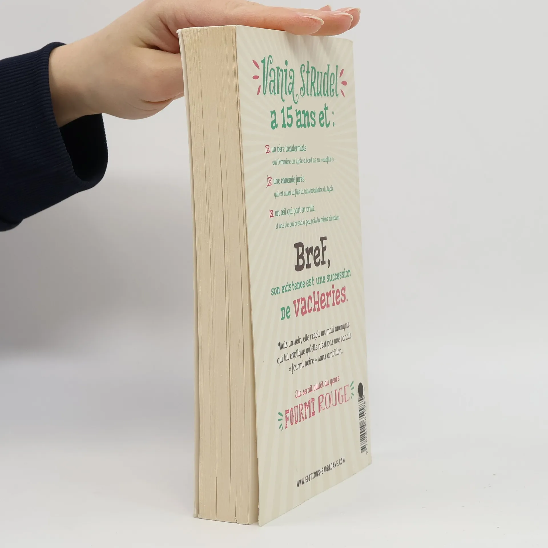 Vania Strudel a 15 ans et: - un père taxidermiste qui l'emmène au collège à bord de sa "ouafture" - Une ennemie jurée, qui est aussi la fille la plus populaire du lycée - Un œil qui part en vrille, et une vie qui prend à peu près la même direction Bref, son existence est une succession de VACHERIES. Mais un soir, elle reçoit un mail anonyme qui lui explique qu'elle n'est pas une banale "fourmi noire" sans ambition. Elle serait plutôt du genre "fourmi rouge"
