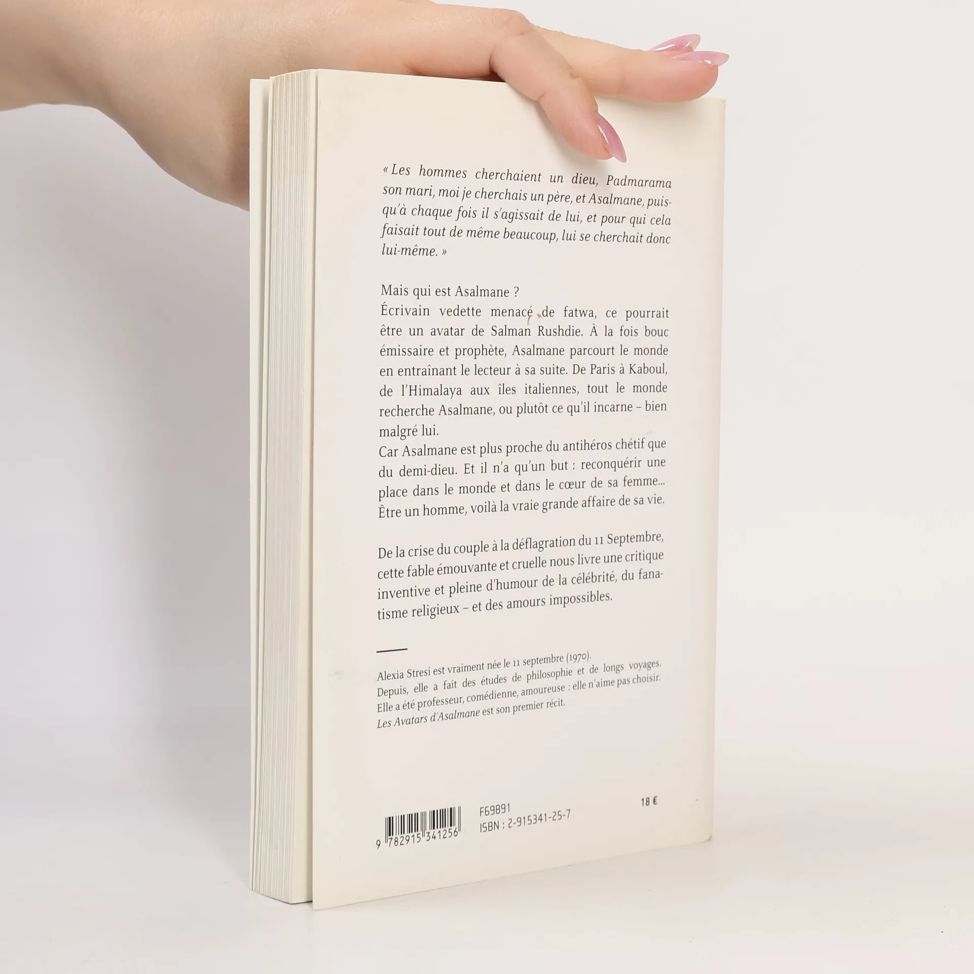 Les hommes cherchaient un dieu, Padmarama son mari, moi je cherchais un père, et Asalmane, puisqu'à chaque fois il s'agissait de lui, et pour qui cela faisait tout de même beaucoup, lui se cherchait donc lui-même. Mais qui est Asalmane ? Écrivain vedette menacé de fatwa, ce pourrait être un avatar de Salman Rushdie. À la fois bouc émissaire et prophète, Asalmane parcourt le monde en entraînant le lecteur à sa suite. De Paris à Kaboul, de l'Himalaya aux îles italiennes, tout le monde recherche Asalmane, ou plutôt ce qu'il incarne - bien malgré lui. Car Asalmane est plus proche du antihéros chétif que du demi-dieu. Et il n'a qu'un but : reconquérir une place dans le monde et dans le cœur de sa femme... Être un homme, voilà la vraie grande affaire de sa vie. De la crise du couple à la déflagration du 11 septembre, cette fable émouvante et cruelle nous livre une critique inventive et pleine d'humour de la célébrité, du fanatisme religieux - et des amours impossibles.