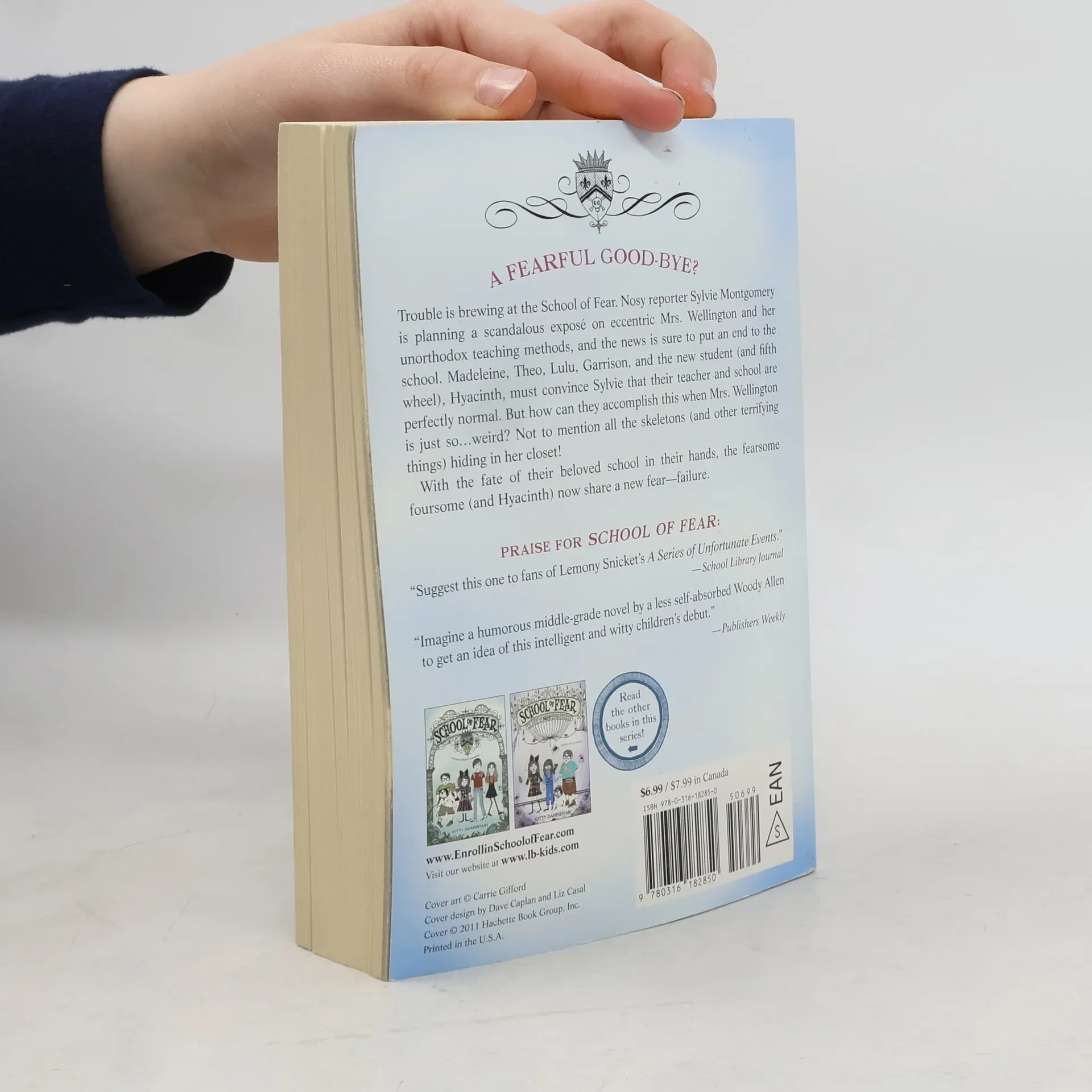 Is school out forever at the School of Fear? A nosy reporter is planning a scandalous exposé on eccentric Mrs. Wellington and her unorthodox teaching methods, and the news is sure to put an end to the school. Madeleine, Theo, Lulu, Garrison, and the new student Hyacinth must convince the reporter that their teacher and the school are perfectly normal. But how can they accomplish this when Mrs. Wellington is just so... odd? With the fate of their beloved school in their hands, the children now share a new fear--failure.
