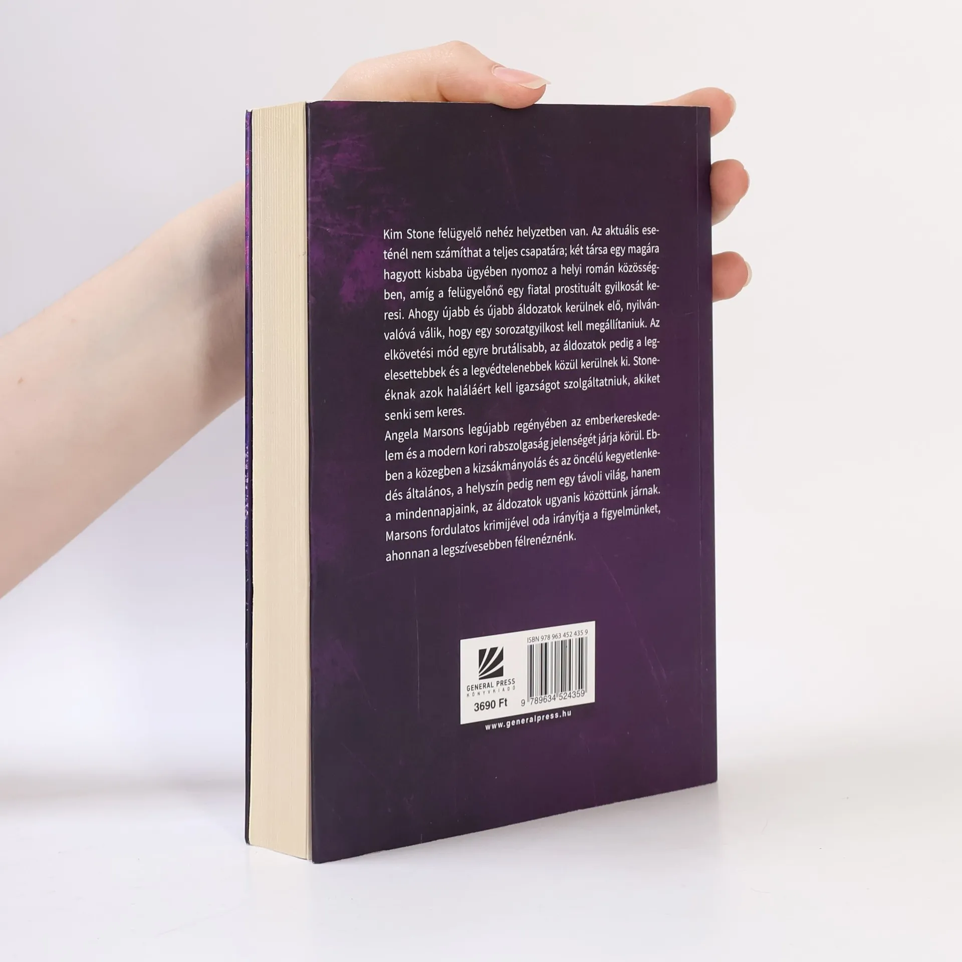 Kim Stone felügyelő nehéz helyzetben van. Az aktuális eseténél nem számíthat a teljes csapatára; két társa egy magára hagyott kisbaba ügyében nyomoz a helyi román közösségben, amíg a felügyelőnő egy fiatal prostituált gyilkosát keresi. Ahogy újabb és újabb áldozatok kerülnek elő, nyilvánvalóvá válik, hogy egy sorozatgyilkost kell megállítaniuk. Az elkövetési mód egyre brutálisabb, az áldozatok pedig a legelesettebbek és a legvédtelenebbek közül kerülnek ki. Stone-éknak azok haláláért kell igazságot szolgáltatniuk, akiket senki sem keres. Angela Marsons legújabb regényében az emberkereskedelem és a modern kori rabszolgaság jelenségét járja körül. Ebben a közegben a kizsákmányolás és az öncélú kegyetlenkedés mindennapos, a helyszín pedig nem egy távoli világ, hanem a mindennapjaink, az áldozatok ugyanis közöttünk járnak. Marsons fordulatos krimijével oda irányítja a figyelmünket, ahonnan a legszívesebben félrenéznénk.