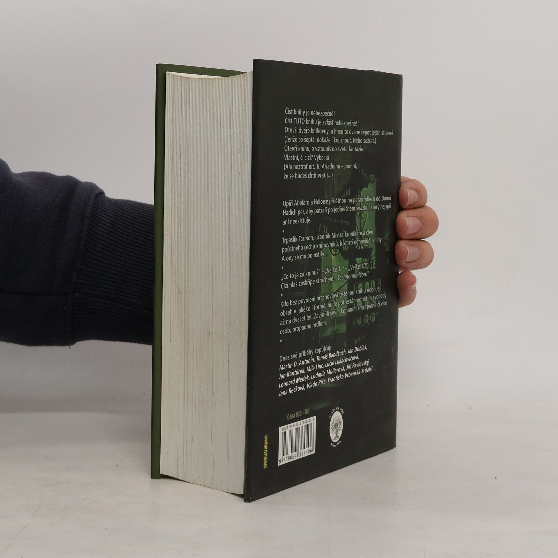 Číst knihy je nebezpečné! Číst TUTO knihu je zvlášť nebezpečné!! Otevři dveře knihovny, a hned tě ovane šepot jejich stránek. (Jenže co šeptá, dokáže i kousnout. Nebo sežrat.) Otevři knihu, a vstoupíš do světa fantazie. Vlastní, či cizí? Vyber si! (Ale neztrať nit. Tu Ariadninu – pomni, že se budeš chtít vrátit...) Upíři Abélard a Héloise přilétnou na parakřídlech do Domu Hadích per, aby pátrali po jedinečném svazku, který nejspíš ani neexistuje... Trpaslík Tarmon, učedník Mistra kronikáře a člen početného cechu knihovníků, k smrti nenáviděl knihy. A ony se mu pomstily... „Co to je za knihu?“ – „Velké T. “ – „Velké T.?“ Cizí hlas zaskřípe strachem: „Technonomicon!“ Kdo bez povolení přechovává tištěnou knihu nebo její obsah v jakékoli formě, bude potrestán odnětím svobody až na dvacet let. Zaviní-li svým konáním smrt jedné či více osob, propadne hrdlem.