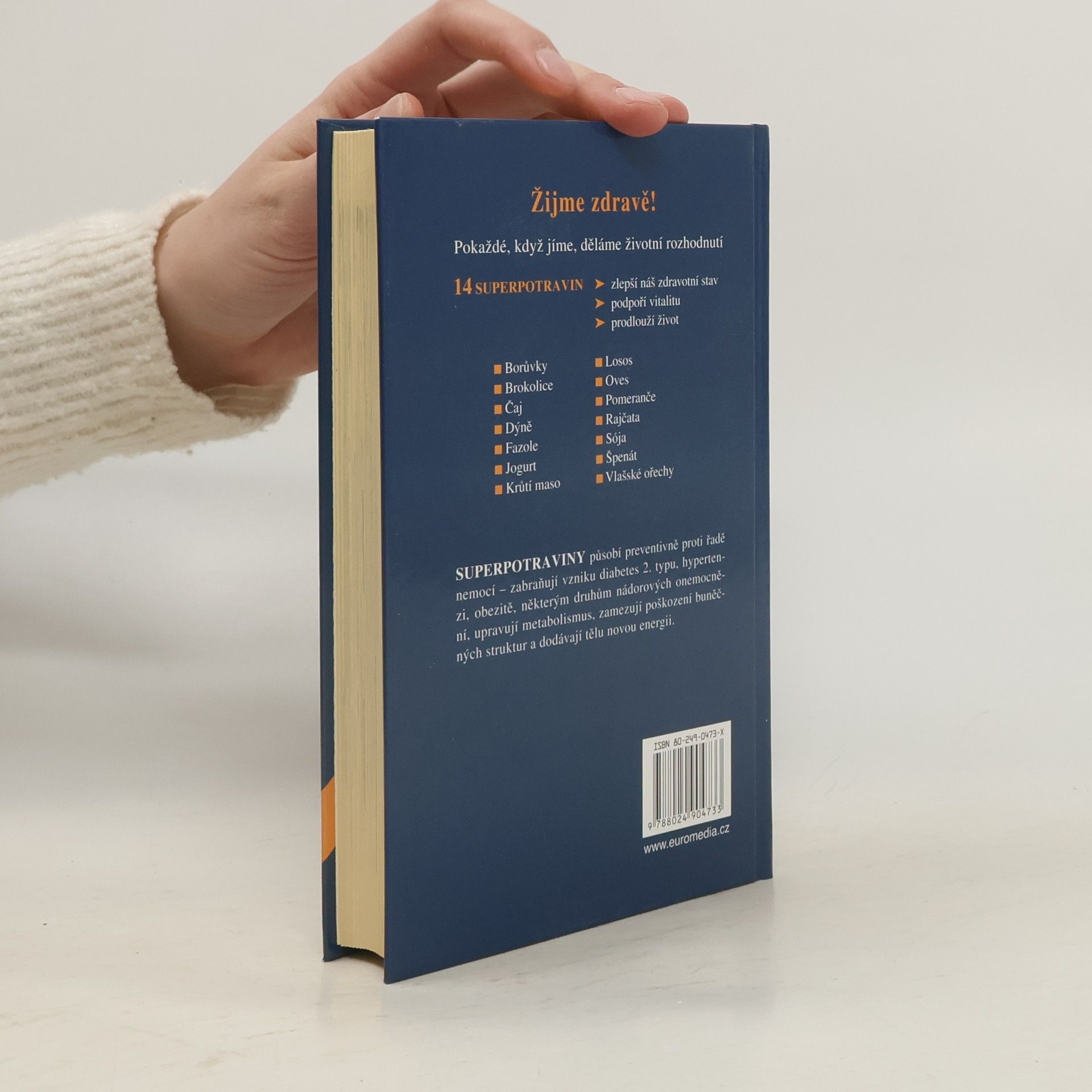 Autor popisuje 14 potravin, které považuje za stěžejní pro udržení optimálního zdraví:, borůvky, brokolici, dýni, fazole, jogurt, krůtí maso, lososa, oves, pomeranče, rajčata, sóju, špenát, vlašské ořechy. Popisuje látky, které jsou v jednotlivých "superpotravinách" obsaženy, čím pozitivně ovlivňují zdraví, a rizika jakých onemocnění snižuje. U každé potraviny uvádí, čím ji lze zaměnit za podobnou ze stejné skupiny (např. borůvky bobulovitým ovocem, vlašské ořechy mandlemi, pistáciemi), a to s podobnými účinky. V úvodu vysvětluje principy zdravé výživy, uvádí současnou moderní pyramidu potravin. Závěr tvoří desetidenní jídelníček od snídaně po večeři s velmi chutnými recepty. Informace v této srozumitelně napsané knize vycházejí z posledních poznatků o zdravém dietním způsobu.