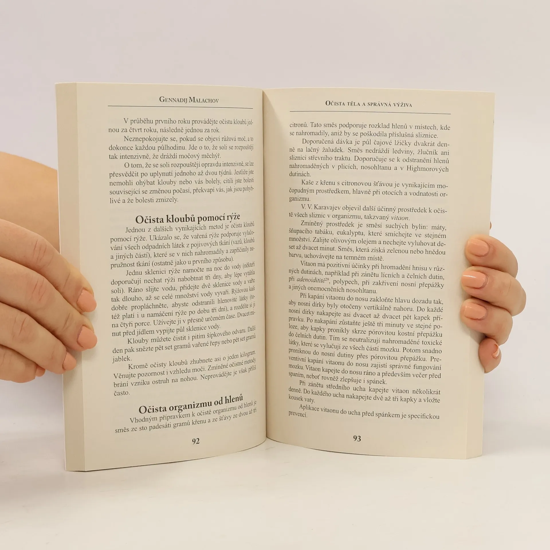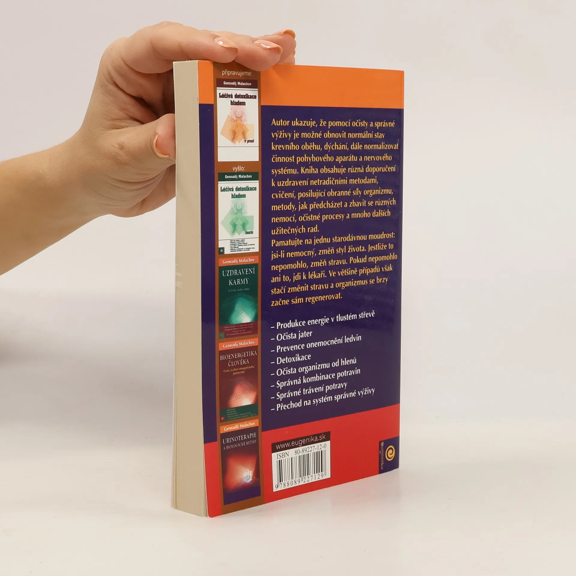 Autor ukazuje, že pomocí očisty a správné výživy je možné obnovit normální stav krevního oběhu, dýchání, dále normalizovat činnost pohybového aparátu a nervového systému. Kniha obsahuje různá doporučení k uzdravení netradičními metodami, cvičení posilující obranné síly organismu, metody, jak předcházet a zbavit se různých nemocí, očistné procesy a mnoho dalších užitečných rad.