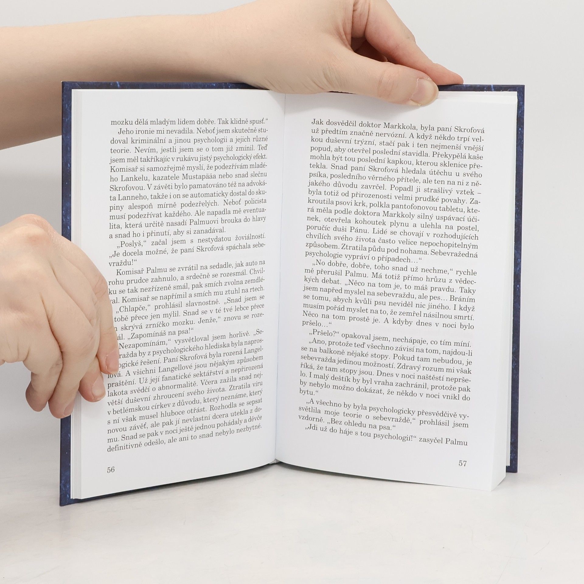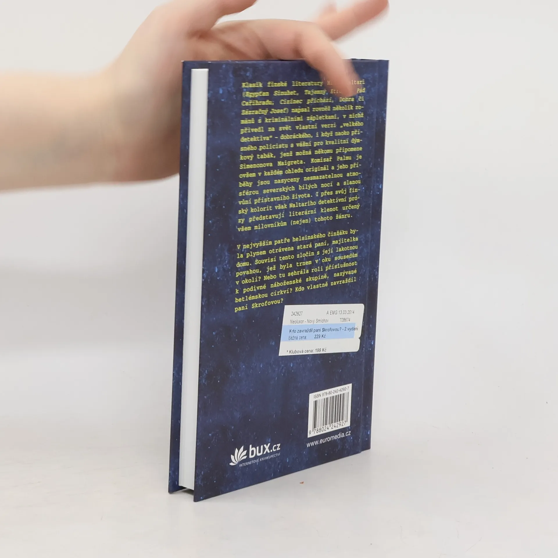 Klasik finské literatury Mika Waltari (Egypťan Sinuhet, Tajemný Etrusk, Pád Cařihradu, Cizinec přichází či Dohra) psal i romány s kriminálními zápletkami, jejichž řešením pověřil svého „velkého detektiva“ – dobráckého, naoko přísného komisaře Palmua, milujícího, jako Maigret, dýmkový tabák. Detektivky ve Waltariho podání jsou prosyceny atmosférou severských bílých nocí a slanou vůní přístavu… V helsinském činžáku byla otrávena majitelka domu. Souvisí zločin s její lakotou? Anebo sehrála roli příslušnost k podivné náboženské skupině? Kdo zavraždil paní Skrofovou?