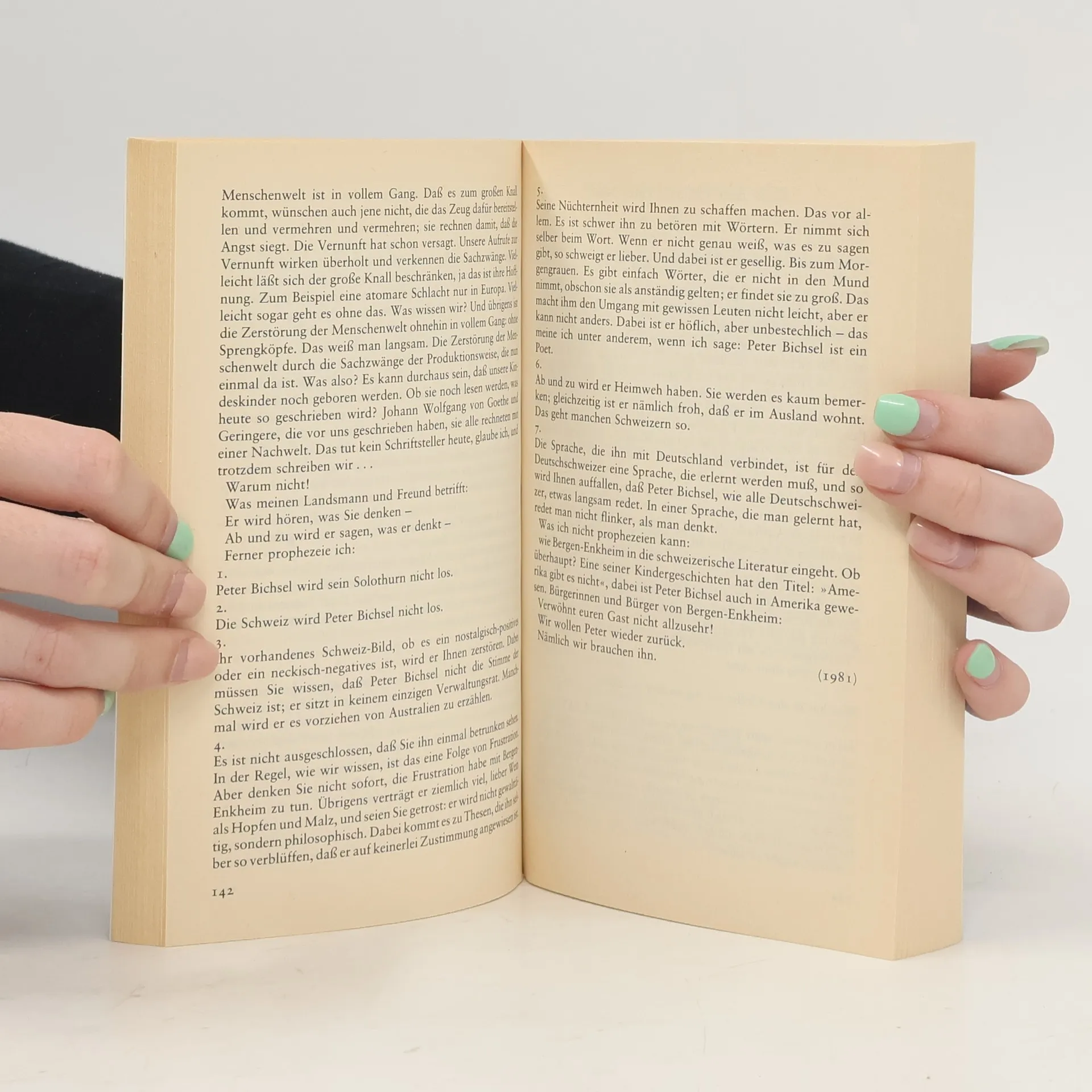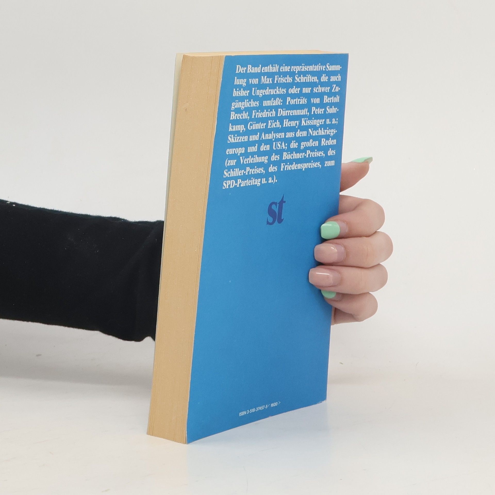 „Der Band enthält eine repräsentative Sammlung von Max Frischs Schriften, die auch bisher Ungedrucktes oder nur schwer Zugängliches umfasst: Porträts von Bertolt Brecht, Friedrich Dürrenmatt; Peter Suhrkamp, Günter Eich, Henry Kissinger u. a.; Skizzen und Analysen uns dem Nachkriegseuropa und den USA; die großen Reden (zur Verleihung des Büchner-Preises, des Schiller-Preises, des Friedenspreises, zum SPD-Parteitag u. a.).“