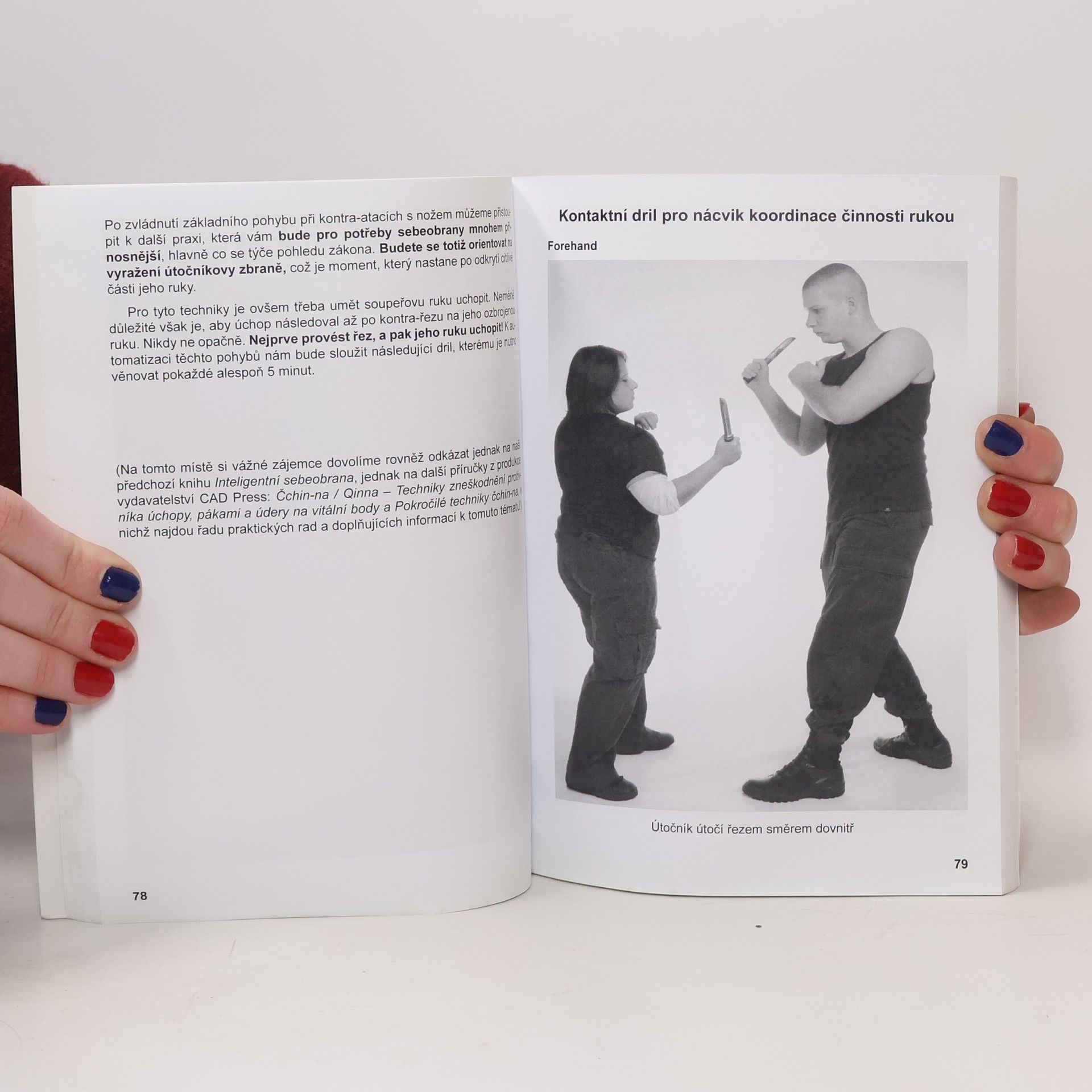 Přes 200 fotografií a ilustrací. Praktická příručka pro boj nožem a obranu proti noži doporučená odborníky z řad policie i bezpečnostních služeb. Tato učebnice boje nožem je rozhodně velmi vhodným základním materiálem k seznámení zájemců o tuto problematiku. Jde o publikaci, která je svým obsahem metodicky dobře zpracována a vedena k finální přípravě na realitu. Vhodně a srozumitelně autoři zdůraznili nutnost zvládnutí trvalého pohybu těla, základní techniky boje nožem a boje proti noži. Reálně je také zdůrazněno vyrovnání fyzického handicapu nožem ozbrojené ženy a muže. Zvláště část „Zrcadlo reality" vhodně doplňuje téma a považuji ji za velmi úspěšně zpracovanou a informačně bohatou. Cenné a zkušenostmi potvrzené, je „evropské" pojetí boje nožem.