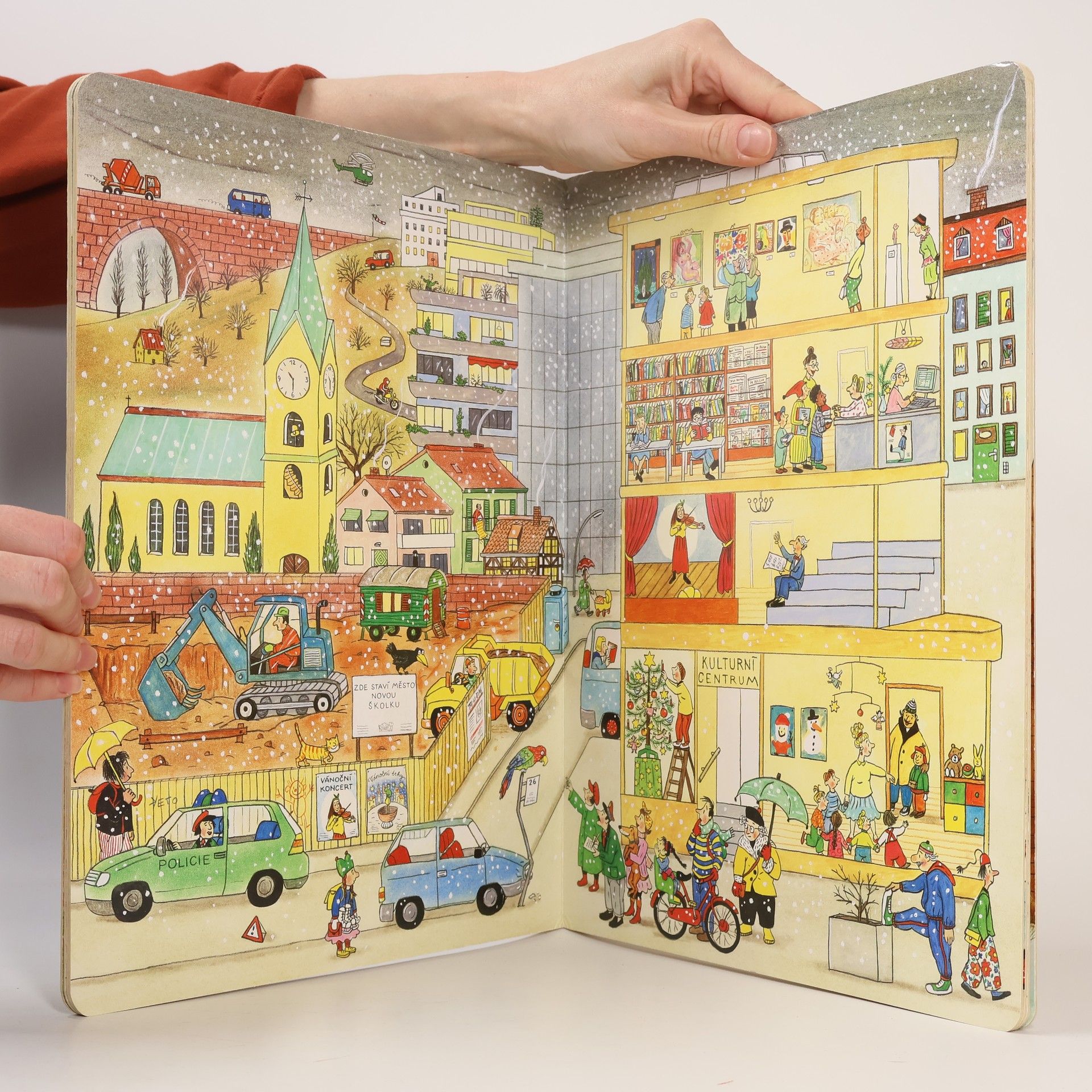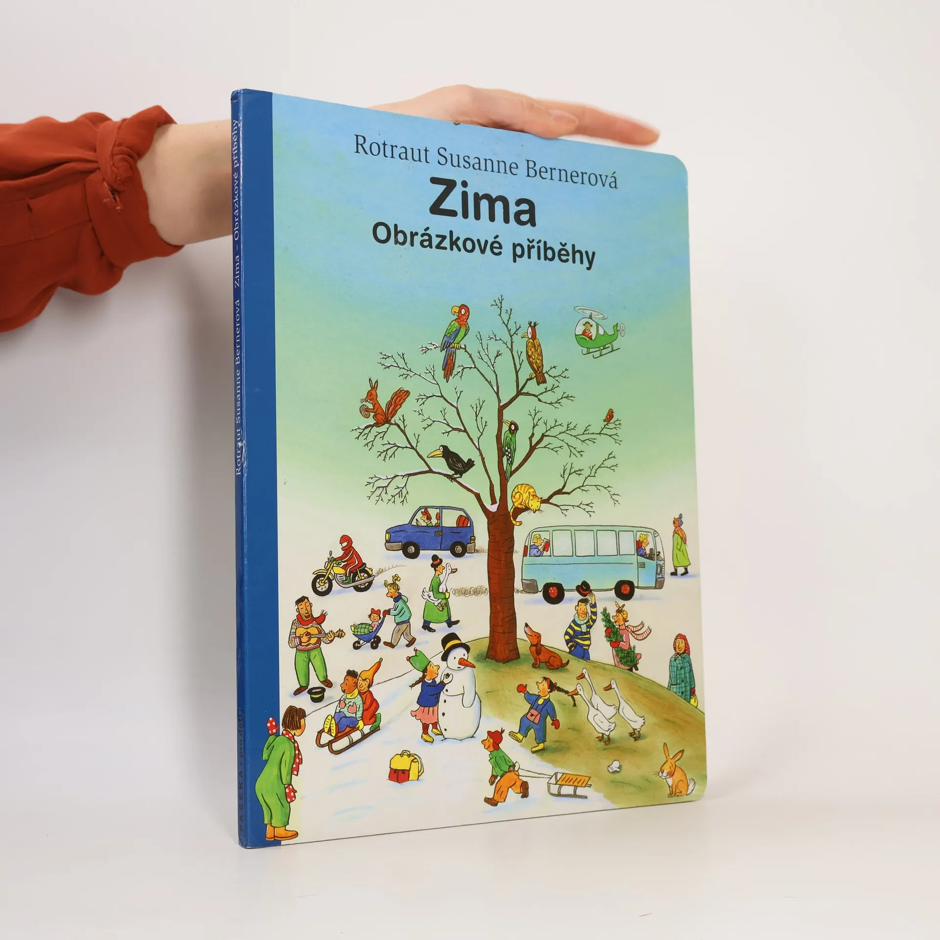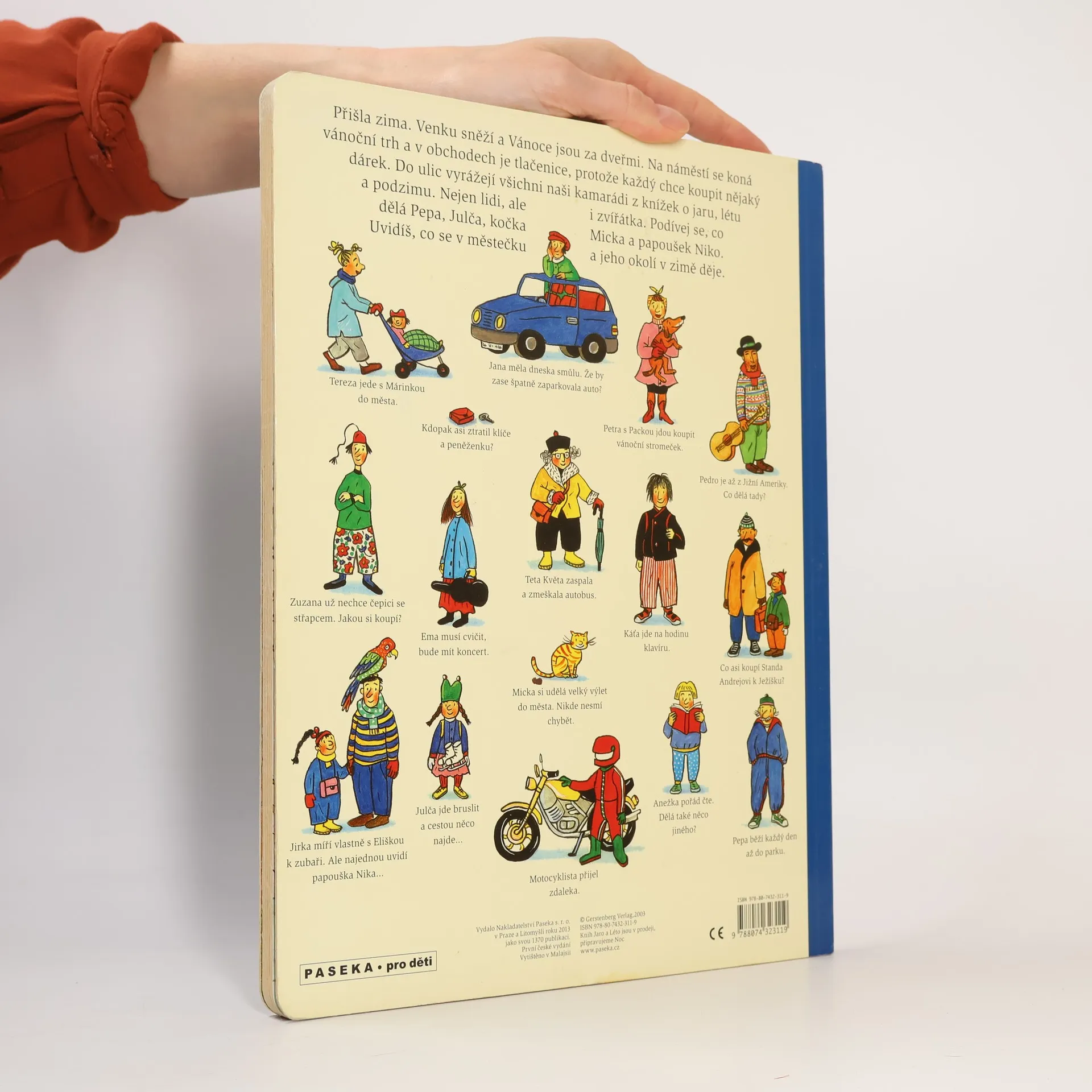 Po knížce o jaru, létu a podzimu přichází Zima. Rotraut Suzanne Bernerová na obrázcích znovu vypráví své malé, vtipné příběhy všedního dne, které poutají a bystří pozornost, podněcují fantazii a řečové schopnosti, ale hlavně baví malé i větší děti. V předvánoční atmosféře se opět setkáte s některými starými známými a kamarády z předchozích tří úspěšných knížek. Přibudou další postavy, věci a zvířátka. Jen místo zůstává stejné: město s ulicemi, domy, s tržištěm, obchody, k tomu park a nedaleký statek. Podívejte se, co všechno se v Zimě děje!