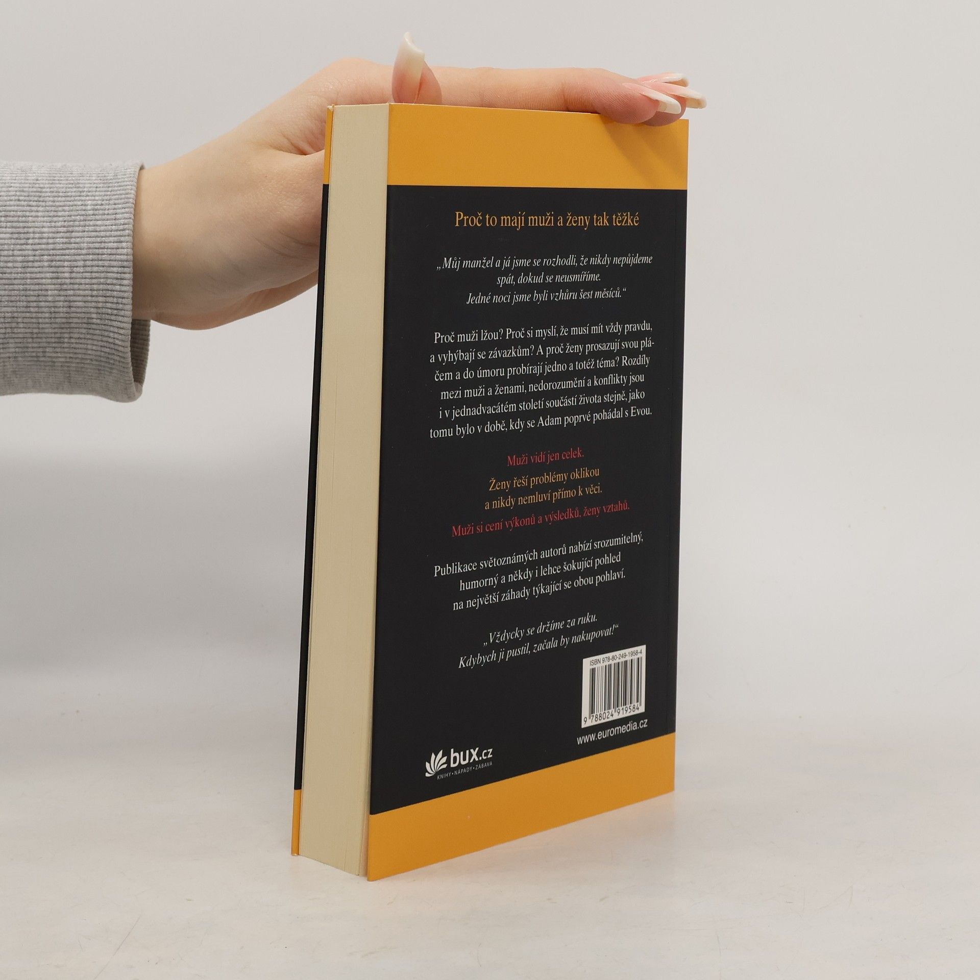 Proč muži lžou? Proč si myslí, že musí mít vždy pravdu, a vyhýbají se závazkům? A proč ženy prosazují svou pláčem a do úmoru probírají jedno a totéž téma? Rozdíly mezi muži a ženami, nedorozumění a konflikty jsou i v jednadvacátém století součástí života stejně, jako tomu bylo v době, kdy se Adam poprvé pohádal s Evou. Publikace světoznámých autorů nabízí srozumitelný, humorný a někdy i lehce šokující pohled na největší záhady týkající se obou pohlaví.