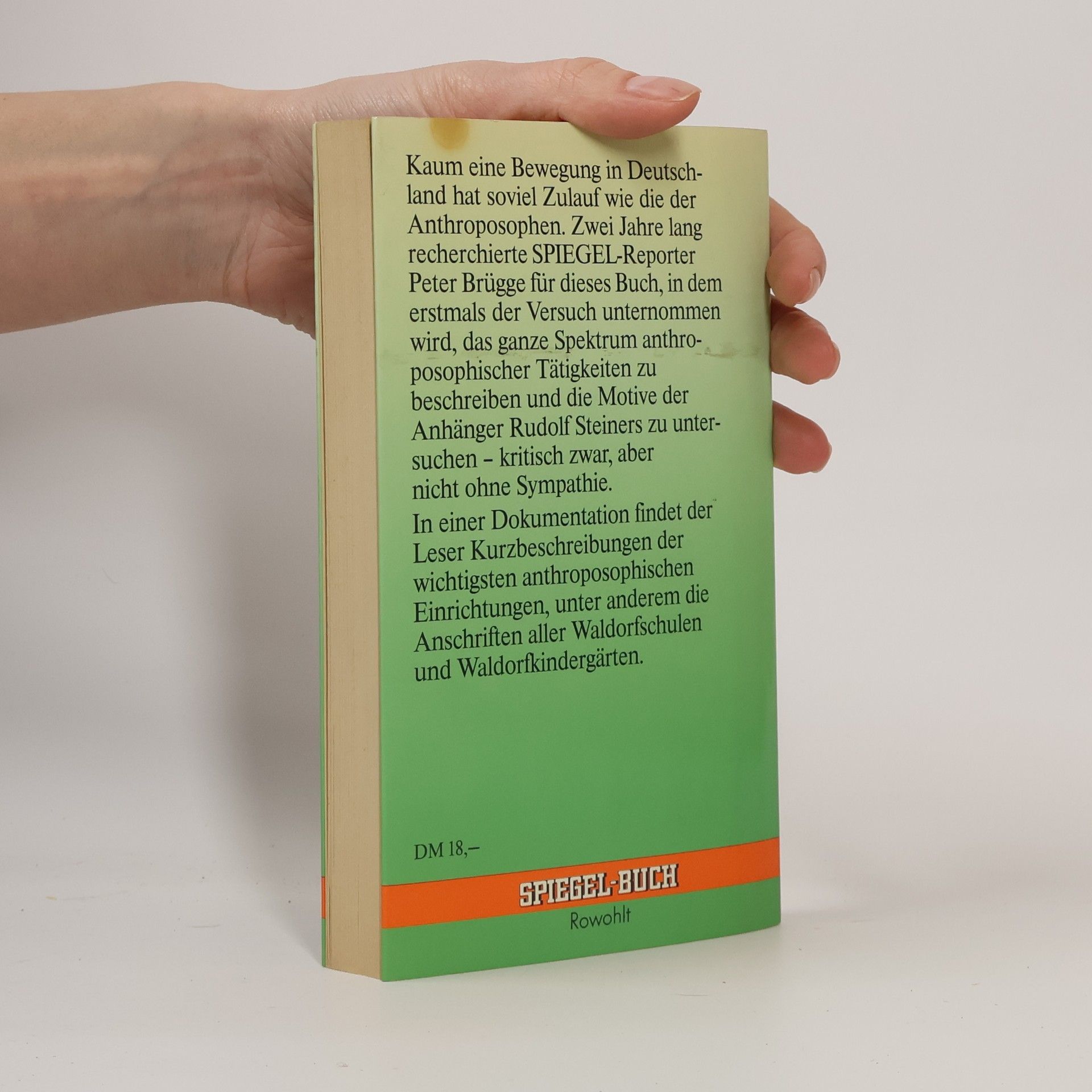 Kaum eine Bewegung in Deutschland hat soviel Zulauf wie die der Anthroposophen. Zwei Jahre lang recherchierte SPIEGEL-Reporter Peter Brügge fur dieses Buch, in dem erstmals der Versuch unternommen wird, das ganze Spektrum anthroposophischer Tätigkeiten zu beschreiben und die Motive der Anhinger Rudolf Steiners zu untersuchen – kritisch zwar, aber nicht ohne Sympathie. In einer Dokumentation findet der Leser Kurzbeschreibungen der wichtigsten anthroposophischen Einrichtungen, unter anderem die Anschriften aller Waldorfschulen und Waldorfkindergärten.