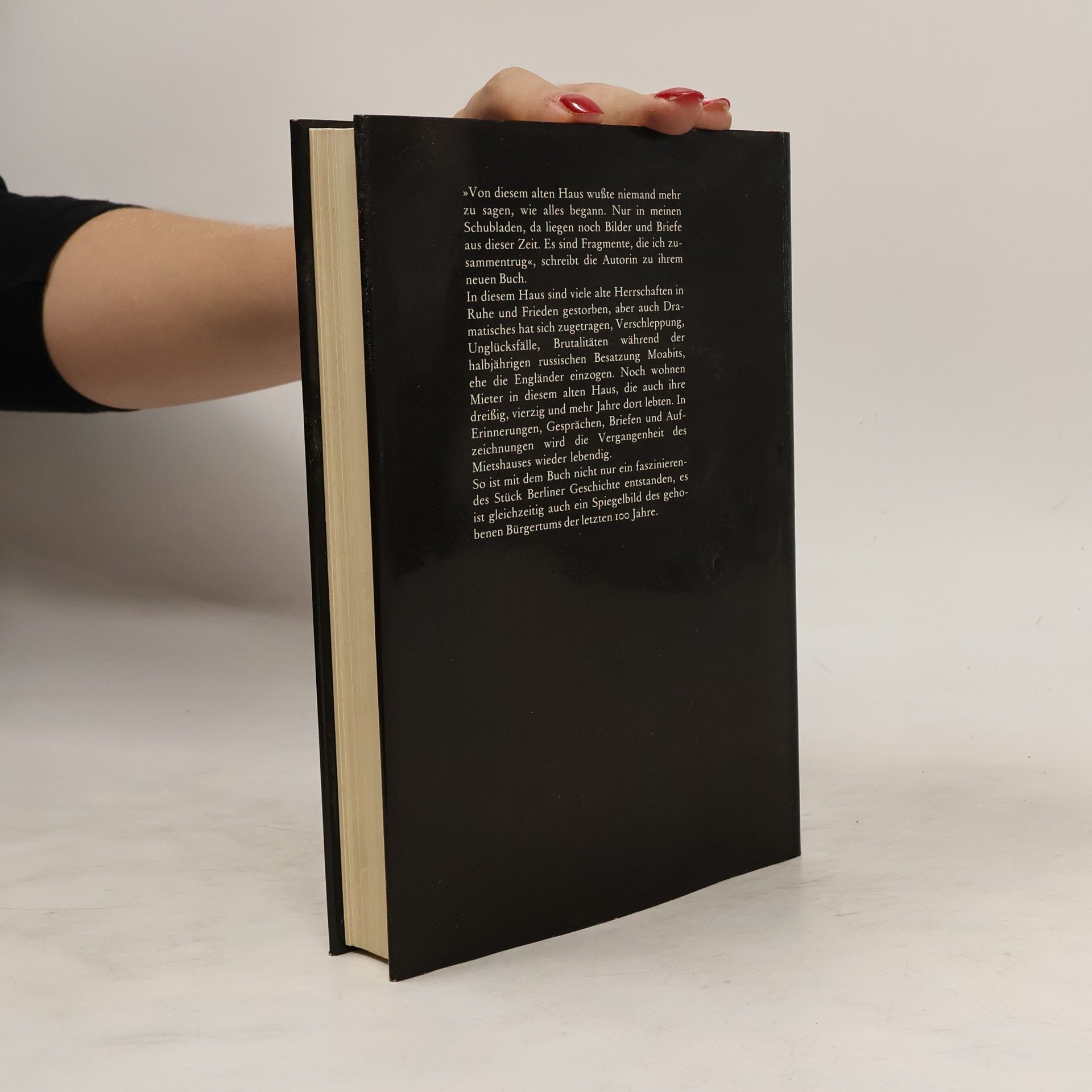 "Von diesem alten Haus wußte niemand mehr zu sagen, wie alles begann. Nur in meinen Schubladen, da liegen noch Bilder und Briefe aus dieser Zeit. Es sind Fragmente, die ich zusammentrug" schreibt die Autorin zu ihrem neuen Buch. In diesem Haus sind viele alte Herrschaften in Ruhe und Frieden gestorben, aber auch Dramatisches hat sich zugetragen, Verschleppung, Unglücksfälle, Brutalitäten während der halbjährigen russischen Besatzung Moabits, ehe die Engländer einzogen. Noch wohnen Mieter in diesem alten Haus, die auch ihre dreißig, vierzig und mehr Jahre dort lebten. In Erinnerungen, Gesprächen, Briefen und Aufzeichnungen wird die Vergangenheit des Mietshauses wieder lebendig. So ist mit diesem Buch nicht nur ein faszinierendes Stück Berliner Geschichte entstanden, es ist gleichzeitig auch ein Spiegelbild des gehobenen Bürgertums der letzten 100 Jahre.