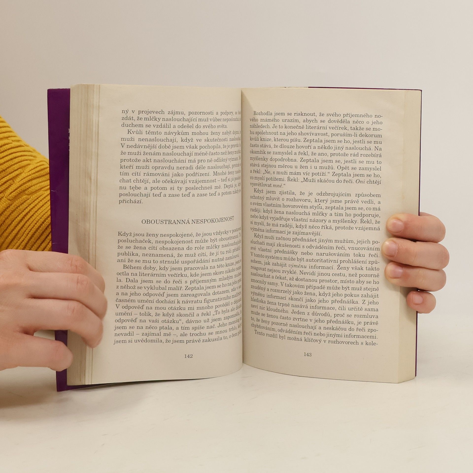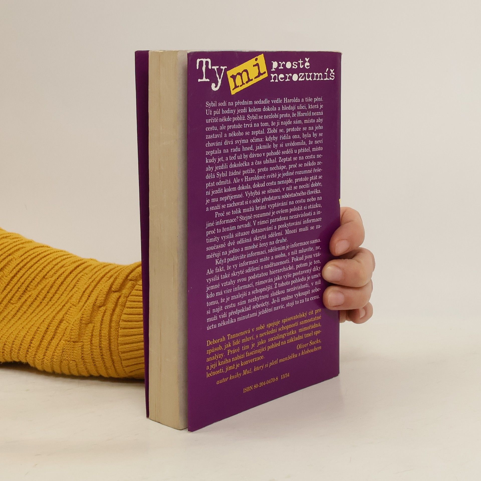 Každý z nás to někdy zažil: muž a žena si "jen tak" povídají, a příjemný rozhovor zčistajasna vyústí v oboustrannou podrážděnost či dokonce hádku. Proč se partneři nemohou domluvit, nepřistupuje-li nikdo z nich k druhému se zlou vůlí? Jsou ženy nenapravitelné drbny, které nepustí muže ke slovu? Jsou muži lhostejní sobci, pro něž je domácnost jen místem, kde si lze v kludu přečíst noviny? Právě na takové otázky se ve své knize Ty mi prostě nerozumíš snaží odpovědět americká badatelka Deborah Tannenová. Život se v jejím podání skládá ze sledu více či méně uspokojivých rozhovorů, jež muží a ženy vedou na základě předpokladů, které se liší, jako by každý z nich patřil k úplně jinému světu, k úplně jiné kultuře. Budeme-li vědět víc o tom, proč náš partner říká právě to, co říká, můžeme se méně hádat a více si navzájem rozumět, tvrdí Tannenová a skutečnost, že se její kniha ve Spojených státech po tři roky držela vysoko na žebříčku nejprodávanějších knih, nám může napovědět, že její recept může mít něco do sebe i pro českého čtenáře.