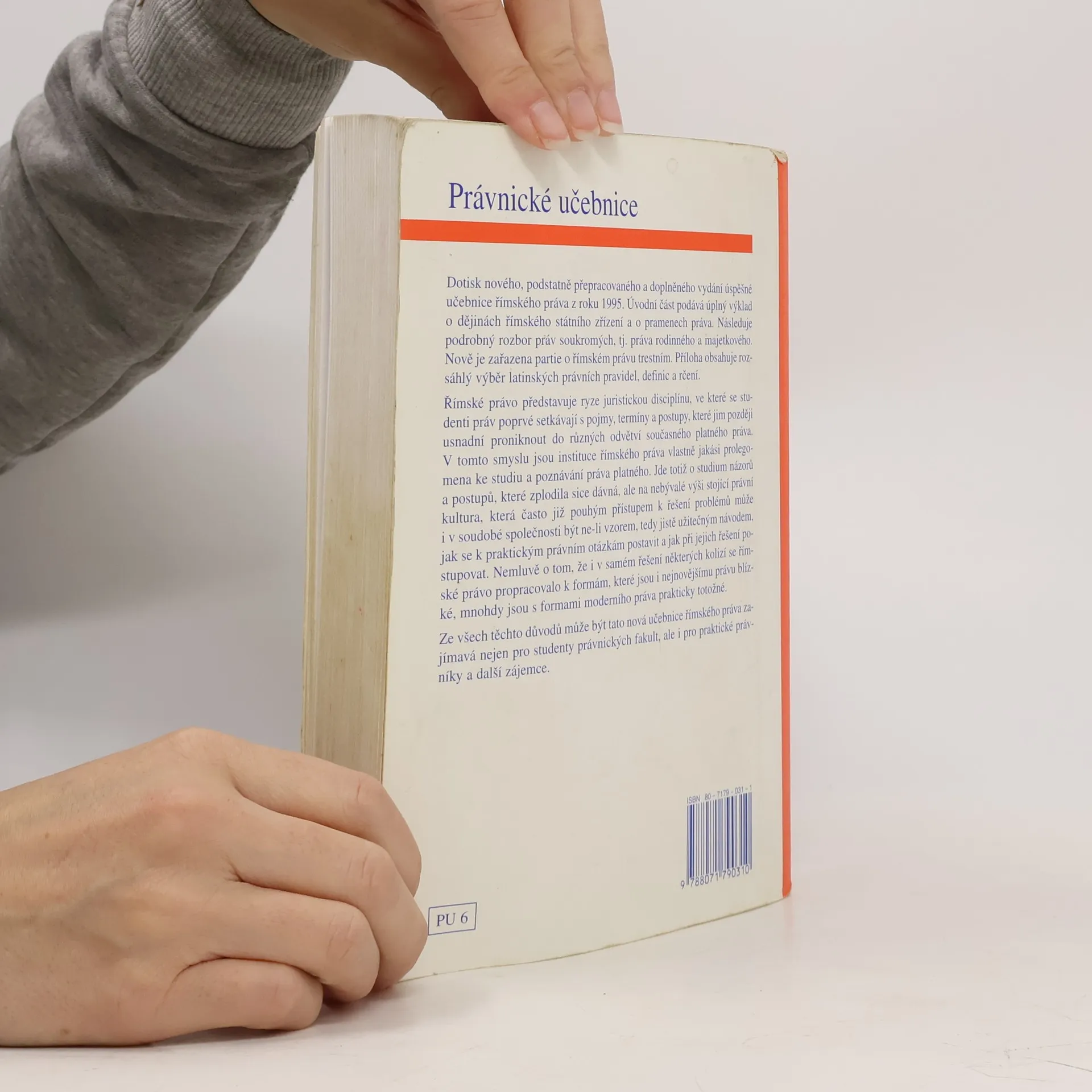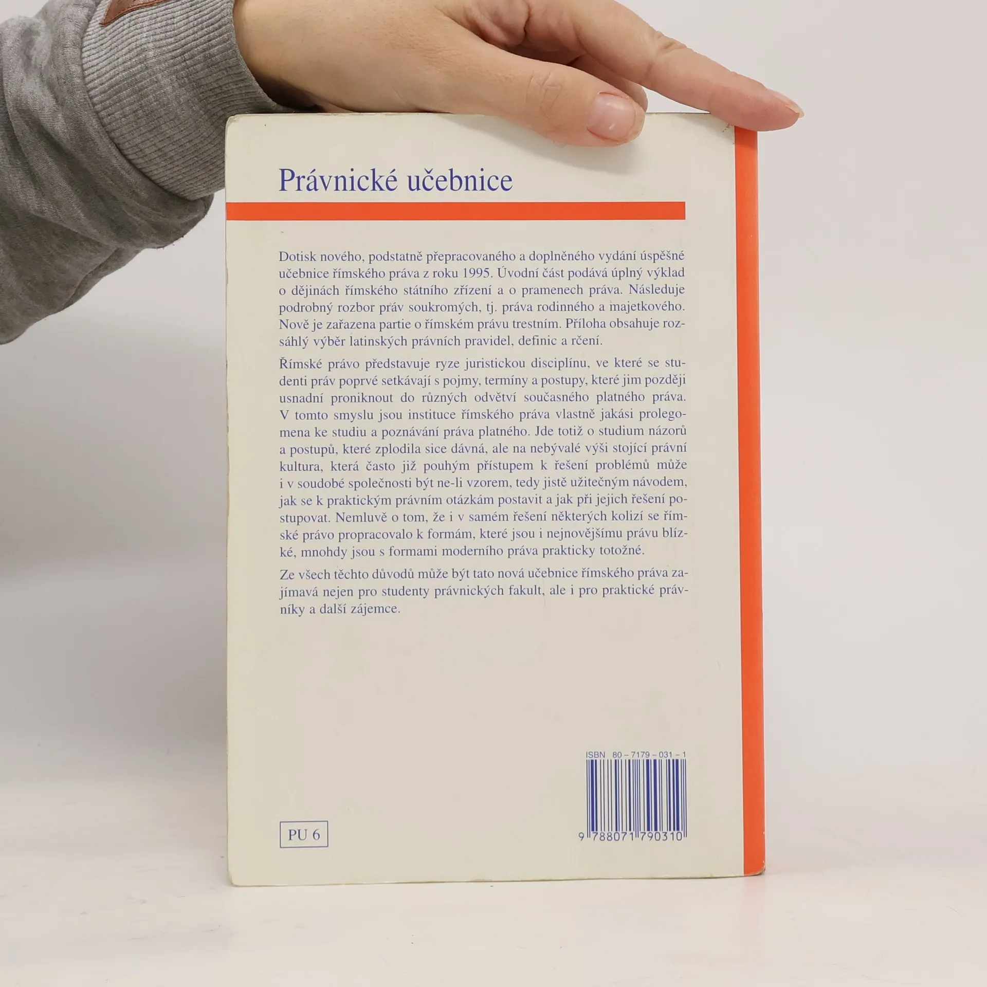 Dotisk nového, podstatně přepracovaného a doplněného vydání úspěšné učebnice římského práva z roku 1995. Úvodní část podává úplný výklad o dějinách římského státního zřízení a o pramenech práva. Následuje podrobný rzobor práv soukromých, tj. práva rodinného a majetkového. Nově je zařazena partie o římském právu trestním. Příloha obsahuje rozsáhlý výběr latinských právních pravidel, definic a rčení.