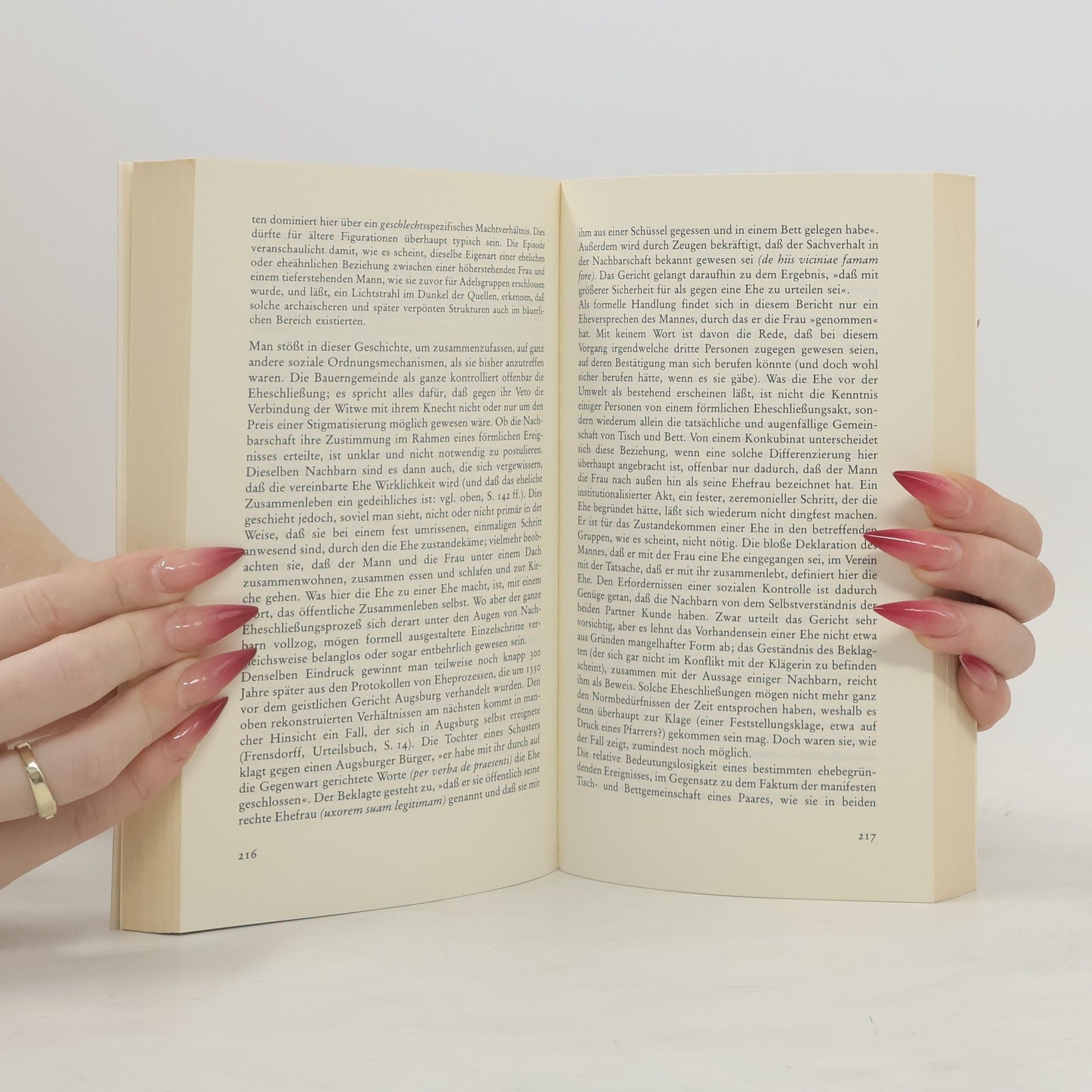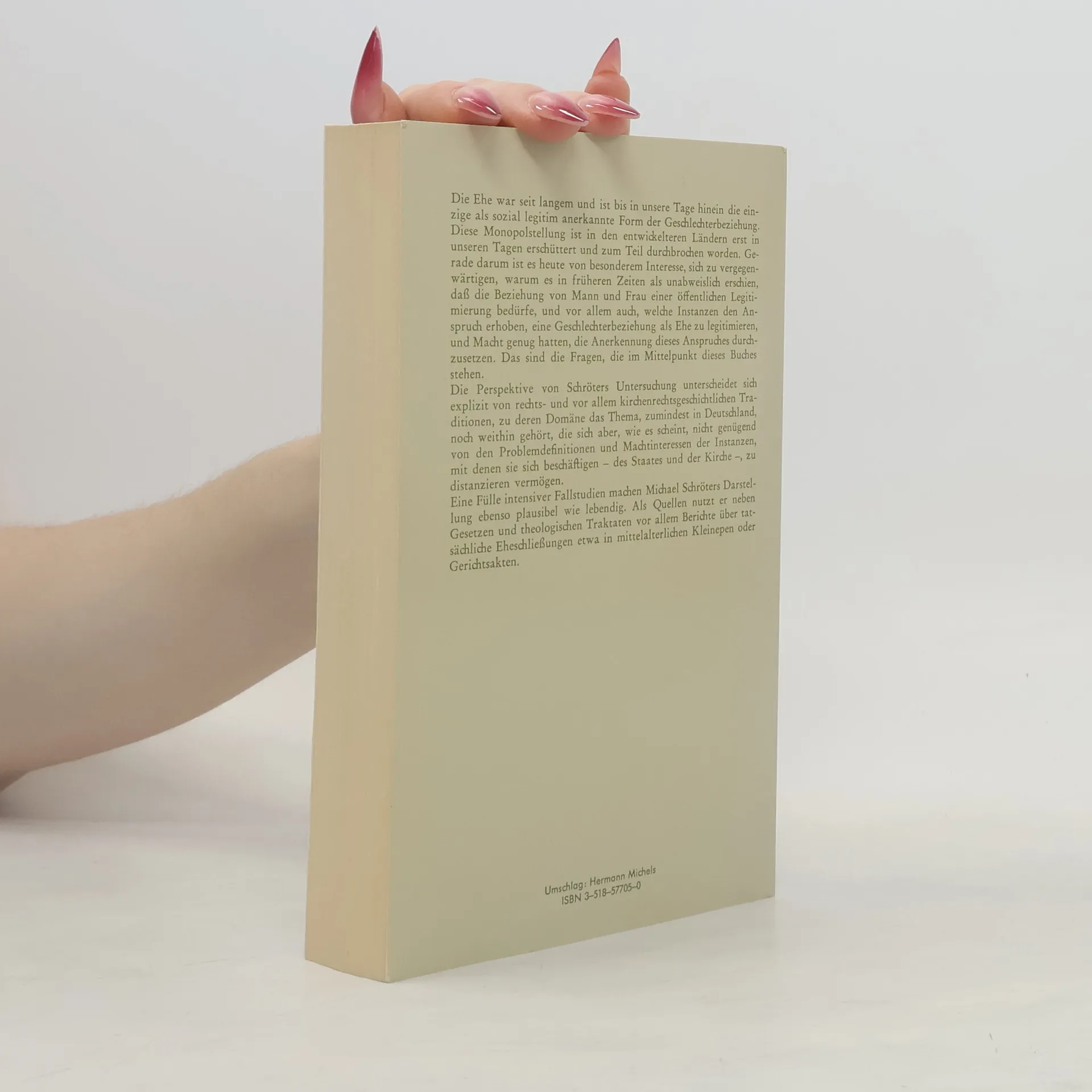 Die Ehe war seit langem und ist bis in unsere Tage hinein die einzige als sozial legitim anerkannte Form der Geschlechterbeziehung. Diese Monopolstellung ist in den entwickelteren Ländern erst in unseren Tagen erschüttert und zum Teil durchbrochen worden. Gerade darum ist es heute von besonderem Interesse, sich zu vergegenwärtigen, warum es in früheren Zeiten als unabweislich erschien, daß die Beziehung von Mann und Frau einer öffentlichen Legitimierung bedürfe, und vor allem auch, welche Instanzen den Anspruch erhoben, eine Geschlechterbeziehung als Ehe zu legitimieren, und Macht genug hatten, die Anerkennung dieses Anspruches durchzusetzen. Das sind die Fragen, die im Mittelpunkt dieses Buches stehen. Die Perspektive von Schröters Untersuchung unterscheidet sich explizit von rechts- und vor allem kirchenrechtsgeschichtlichen Traditionen, zu deren Domäne das Thema, zumindest in Deutschland, noch weithin gehört, die sich aber, wie es scheint, nicht genügend von den Problemdefinitionen und Machtinteressen der Instanzen, mit denen sie sich beschäftigen - des Staates und der Kirche -, zu distanzieren vermögen. Eine Fülle intensiver Fallstudien machen Michael Schröters Darstellung ebenso plausibel wie lebendig. Als Quellen nutzt er neben Gesetzen und theologischen Traktaten vor allem Berichte über tatsächliche Eheschließungen etwa in mittelalterlichen Kleinepen oder Gerichtsakten.