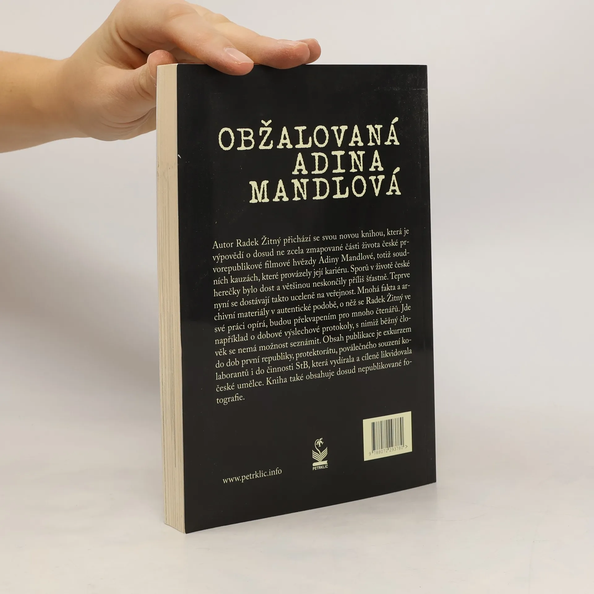 Autor Radek Žitný přichází se svou novou knihou, která je výpovědí o dosud ne zcela zmapované části života české prvorepublikové filmové hvězdy Adiny Mandlové, totiž soudních kauzách, které provázely její kariéru. Sporů v životě české herečky bylo dost a většinou neskončily příliš šťastně. Teprve nyní se dostávají takto uceleně na veřejnost. Mnohá fakta a archivní materiály v autentické podobě, o něž se Radek Žitný ve své práci opírá, budou překvapením pro mnoho čtenářů. Jde například o dobové výslechové protokoly, s nimiž běžný člověk se nemá možnost seznámit. Obsah publikace je exkurzem do dob první republiky, protektorátu, poválečného souzení kolaborantů i do činnosti StB, která vydírala a cíleně likvidovala české umělce. Kniha také obsahuje dosud nepublikované fotografie.