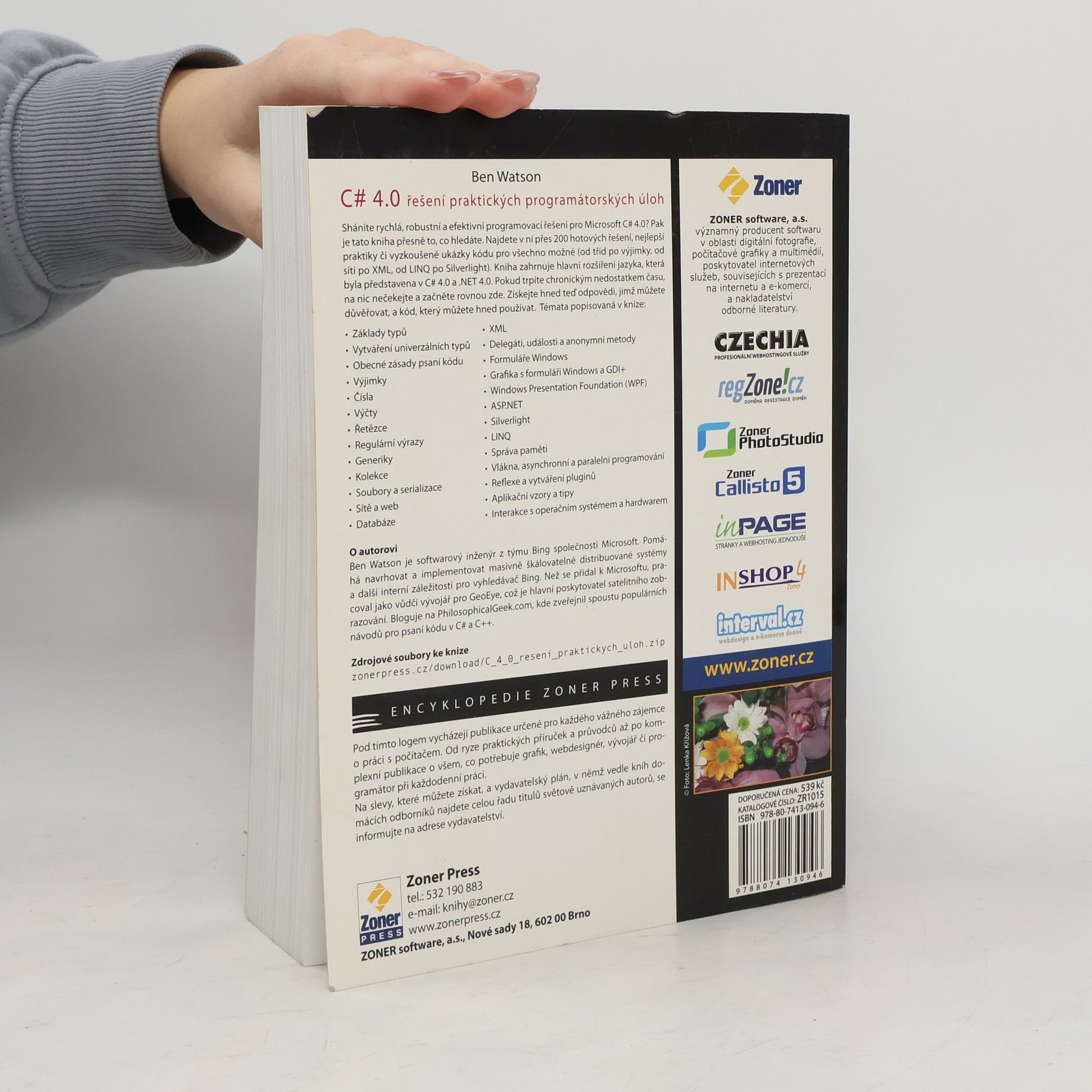 Sháníte rychlá, robustní a efektivní programovací řešení pro Microsoft C# 4.0? Pak je tato kniha přesně to to, co hledáte. Najdete v ní přes 200 hotových řešení, nejlepší praktiky či vyzkoušené ukázky kódu pro všechno možné (od tříd po výjimky, od sítí po XML, od LINQ po Silverlight). Kniha zahrnuje hlavní rozšíření jazyka, která byla představena v C# 4.0 a .NET 4.0. Pokud trpíte chronickým nedostatkem času, na nic nečekejte a začněte rovnou zde. Získejte hned teď odpovědi, jimž můžete důvěřovat, a kód, který můžete hned používat. O autorovi: Ben Watson je softwarový inženýr z týmu Bing společnosti Microsoft. Pomáhá navrhovat a implementovat masivně škálovatelné distribuované systémy a další interní záležitosti pro vyhledávač Bing. Předtím, než se přidal k Microsoftu, pracoval jako vůdčí vývojář pro GeoEye, což je hlavní poskytovatel satelitního zobrazování. Bloguje na PhilosophicalGeek.com, kde zveřejnil spoustu populárních návodů pro psaní kódu v C# a C++. Ke stažení Stáhnout zdrojové soubory ke knize (31 MB)