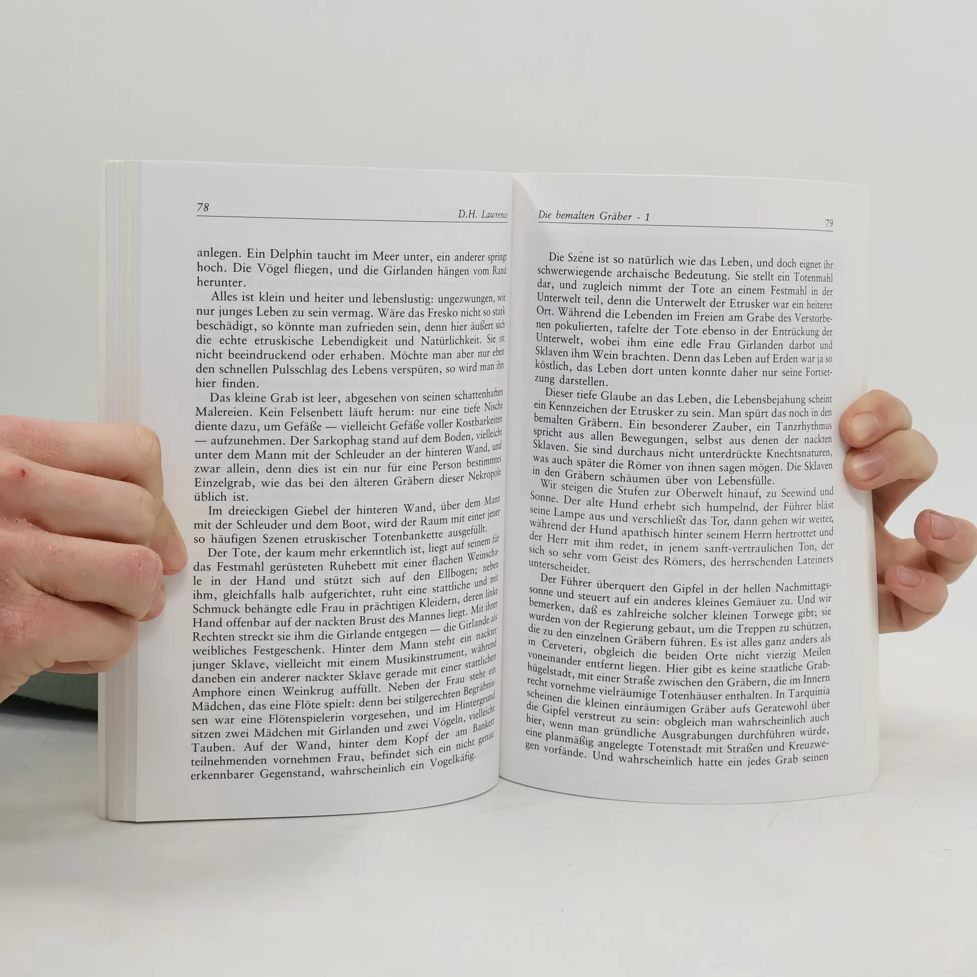 »Die Etrurienreise, die Lawrence im Frühjahr 1927 unternahm, berührte Caere, Tarquina, Vulci und Volterra. In buntem Wechsel wird von den antiken Stätten, von der Landschaft und den heutigen Bewohnern erzählt, die in ihrer Eigenart scharf erfaßt und liebevoll charakterisiert sind.«