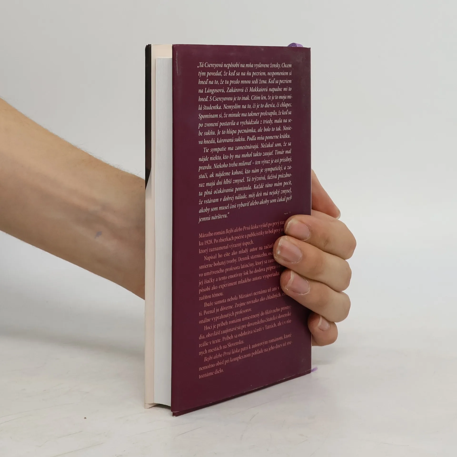 Máraiho román Bejbi alebo prvá láska vyšiel po prv raz v roku 1928. Po zbierkach poézie a publicistiky to bol prvý román, ktorý zaznamenal výrazný úspech. Napísal ho ešte ako mladý autor na začiatku svojej nesmierne bohatej tvorby. Denník starnúceho, osamelého, citovo umŕtveného profesora latinčiny, ktorý sa zamiluje do svojej žiačky a tento emotívny šok ho doslova pripraví o rozum, pôsobí ako experiment mladého autora vysporiadať sa s nezažitou témou. Hoci je príbeh románu umiestnený do fiktívneho prostredia, obzvlášť zaujímavé sú pre slovenského čitateľa i slovenské reálie v texte.Príbeh sa odohráva sčasti v Tatrách, ale i v rôznych mestách na Slovensku. Bejbi alebo prvá láska patrí k autorovým románom, ktoré nemožno obísť pri komplexnom pohľade na jeho dnes už svetoznáme dielo.