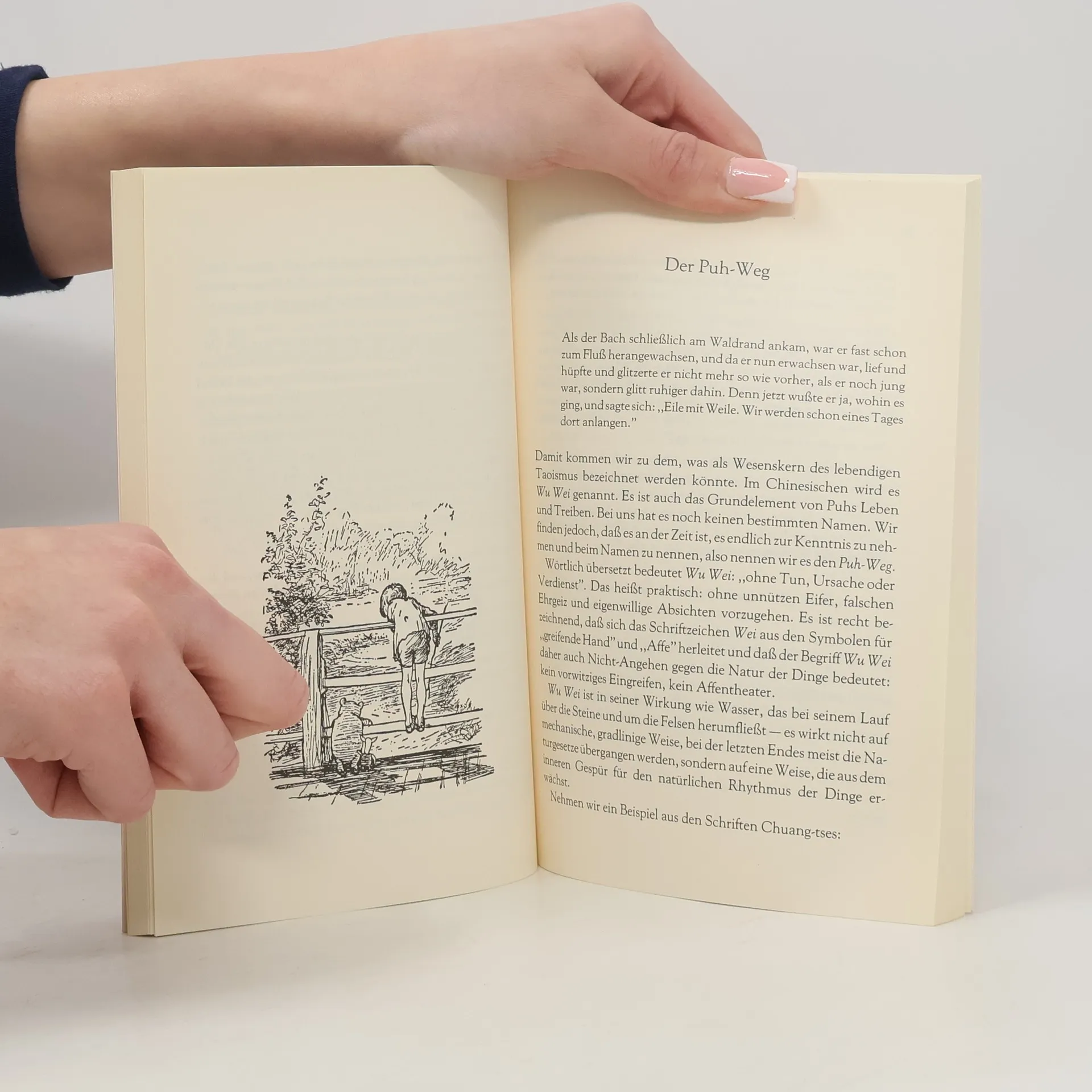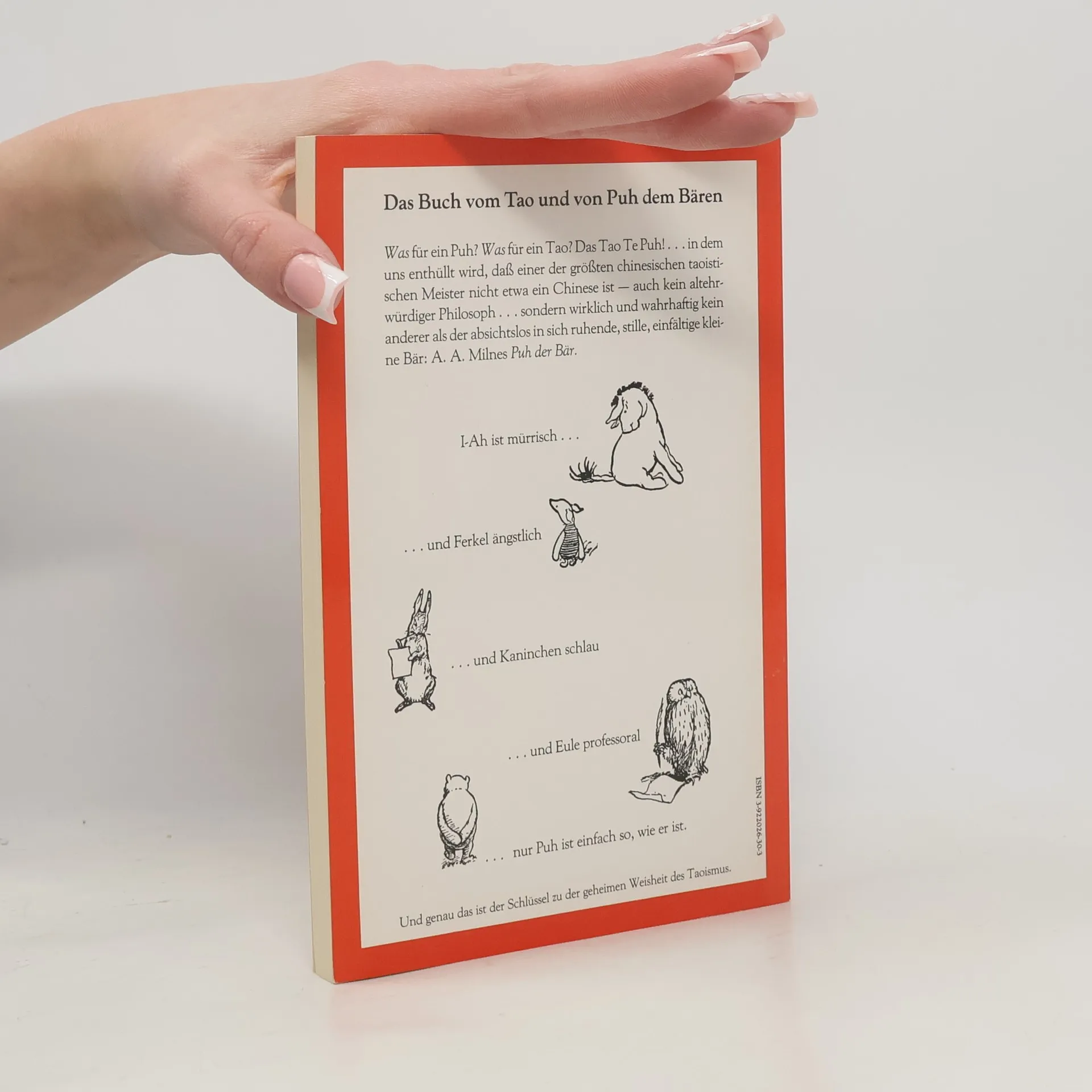 Was für ein Puh? Was für ein Tao? Das Tao Te Puh, in dem uns enthüllt wird, daß einer der größten chinesischen taoistischen Meister nicht etwa ein Chinese ist - auch kein altehrwürdiger Philosoph, sondern wirklich und wahrhaftig kein anderer als der absichtslos in sich ruhende, stille, einfältige kleine Bär. I-Ah ist mürrisch.. ..und Ferkel ängstlich ..und Kaninchen schlau ..und Eule professoral ..nur Puh ist einfach so, wie er ist. Und genau das ist der Schlüssel zu der geheimen Weisheit des Taoismus.